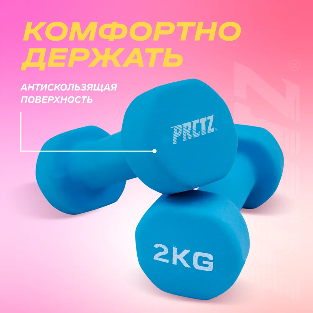 - Гантели PRCTZ отлично подходят как для коммерческого использования, так и для персональных домашних тренировок. Неопреновое покрытие отличается своей долговечностью и помогает сохранять внешний вид гантелей. Удобные ручки обеспечивают комфортный хват при занятиях, а эргономичный дизайн без острых углов обеспечивает безопасность и простоту ухода за гантелями. Гантели помогают эффективно развивать и поддерживать в форме мышцы рук, грудной клетки, верхней части спины и плеч. Гантели для фитнеса, гимнастики и аэробики, как правило, имеют небольшой вес (в основном до 1-10кг), яркое цветовое решение и продуманный дизайн. Имеют эргономичную форму и удобны в ипользовании. Преимущества упражнений с гантелями: 1) - Позволяют задействовать больше мышц стабилизаторов, чем упражнения со штангой; 2) - Делают мышцы, связки и сухожилия более гибкими, а суставы более подвижными; 3) - Позволяют выполнять большое разнообразие упражнений; 4) - Позволяют выявить дисбаланс парных мышц (левая и правая руки) и нагружать их раздельно; 5) - Позволяют более тонко и детально проработать отдельные мышцы; 6) - Диапазон движений в упражнениях с гантелями более широк, чем в упражнениях со штангой, они позволяют лучше проработать суставы.