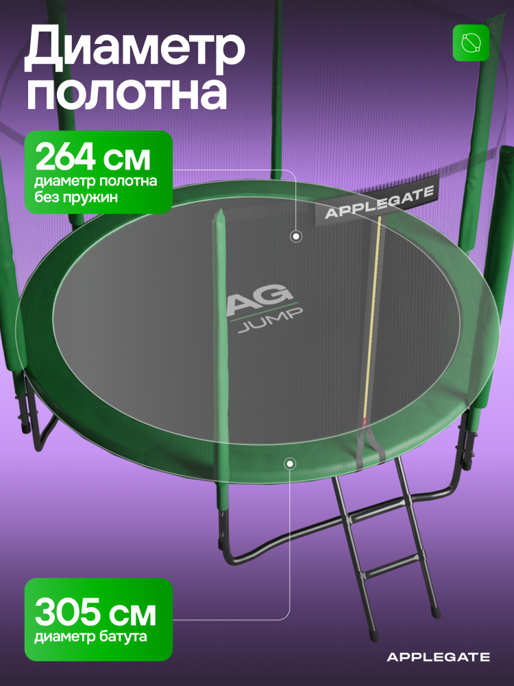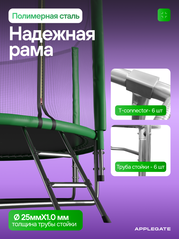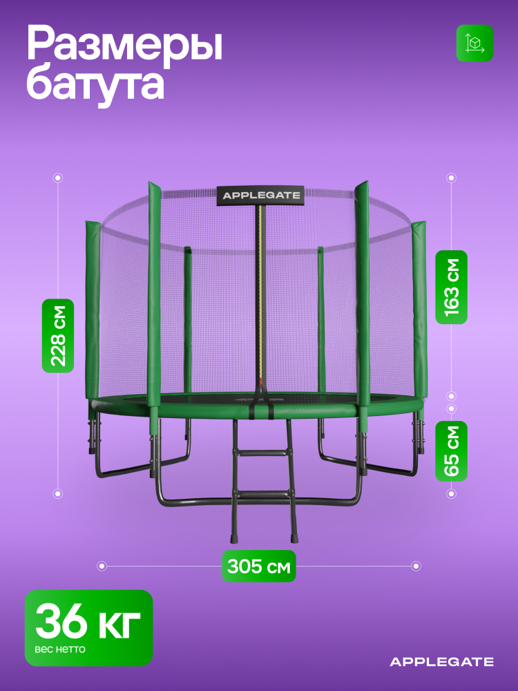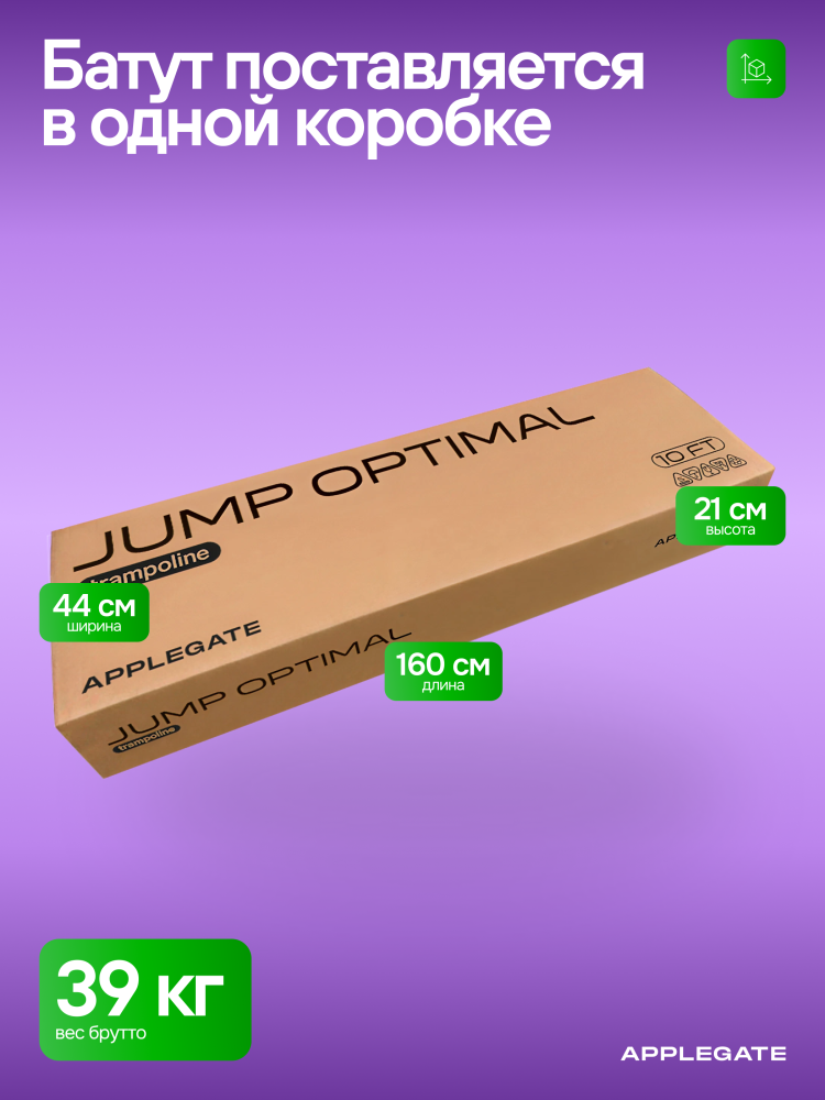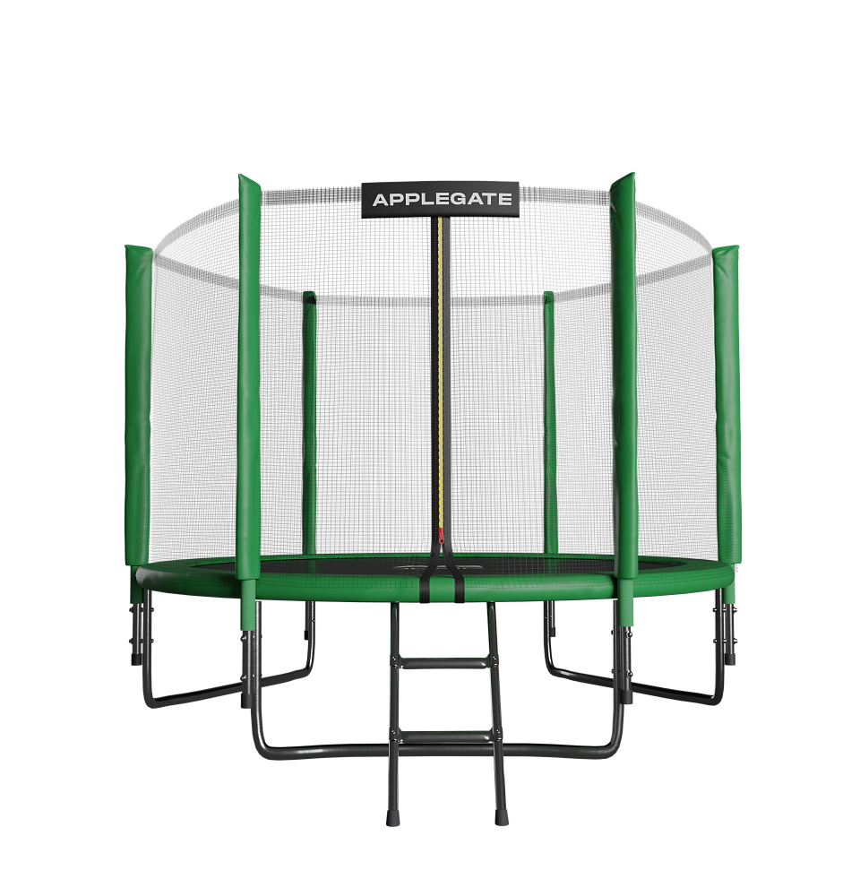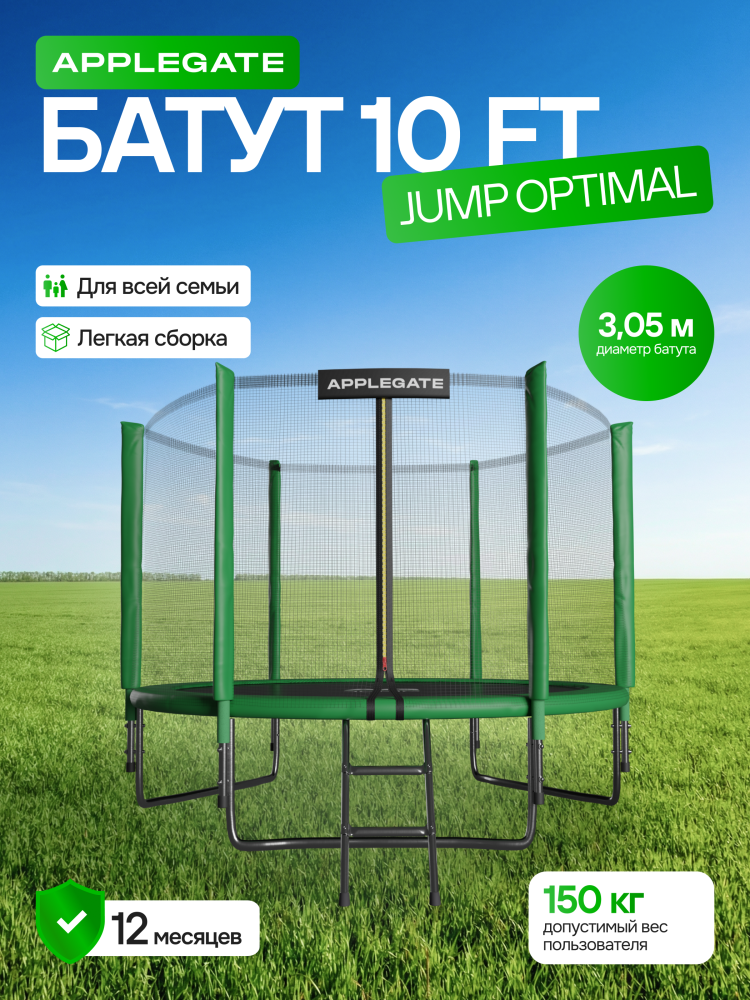 - Идеальное средство для отличного настроения всей семьи – это уличные батуты от бренда APPLEGATE. Более того, это настоящий помощник в поддержании физической формы, ведь благодаря занятиям на батуте отмечается снижение веса, повышение выносливости, тренируется координация и развиваются все группы мышц. Долговечность и безопасность – две основополагающие характеристики при выборе батута от APPLEGATE. Построенные на основе высокопрочной стальной рамы, модели JUMP OPTIMAL рассчитаны на долгие часы прыжков. За соединение всех стальных элементов, обеспечивающих надежность конструкции, отвечает система T-Shaped Component™. Устойчивость на поверхности гарантируют 3 опорные стойки W-образной формы. Допустимый вес пользователя - 150 кг. Общий диаметр модели составляет 10 футов (3,05 м). На батуте 10FT с внутренней страховочной сеткой (Outside PE) используется премиальная серия легендарного полотна из полипропилена Permatron™, произведенного в США, который является самым прочным материалом для прыжковой поверхности. Верхние изогнутые стойки, в количестве 6 штук, оплетены мягкими прорезиненными чехлами из PVC-материала. По окружности рабочей зоны на стойки натянута прочная внутренняя защитная сетка высотой 163 см. В комплекте с батутом предусмотрена лестница длиной 85 см для удобного подъема. Стоит отметить и стильный ярко-зеленый цвет модели, подчеркивающий премиальность и высокий уровень качества продукции. Батуты APPLEGATE JUMP легко собираются своими силами. Для удобства можно посмотреть подробное видео сборки!