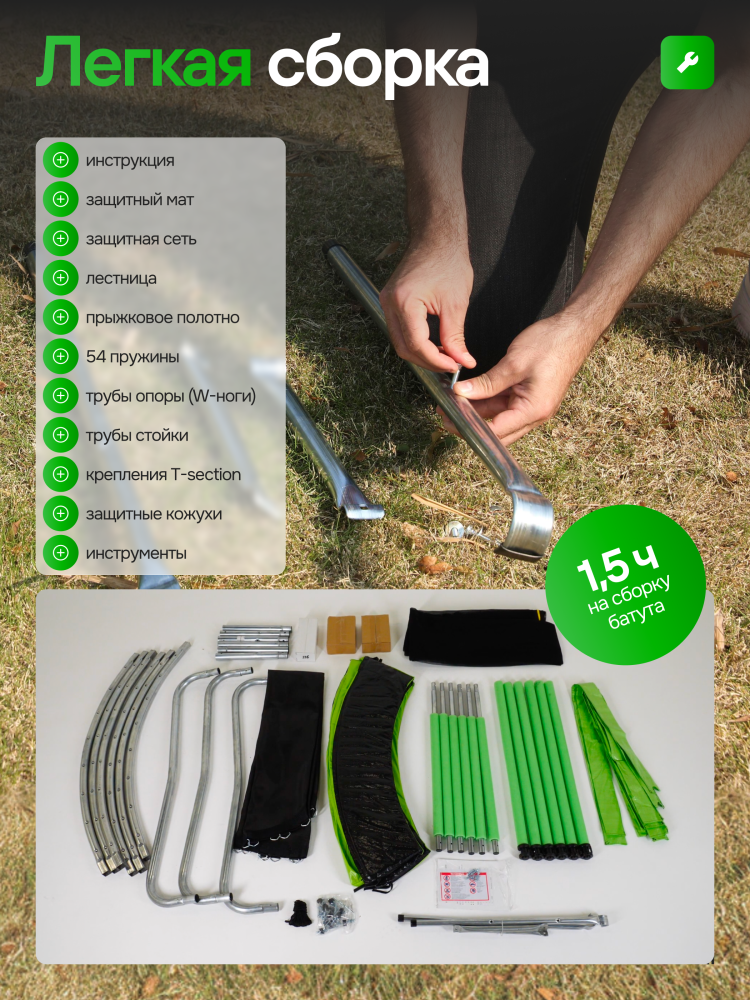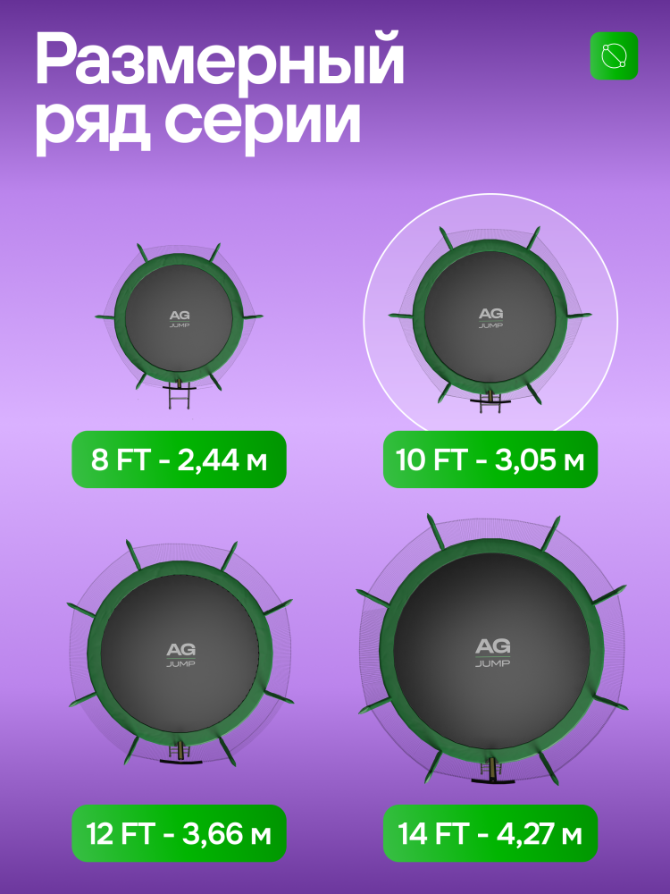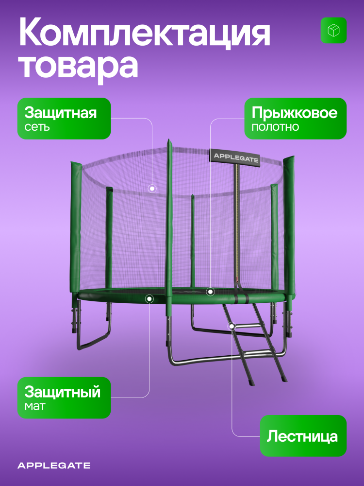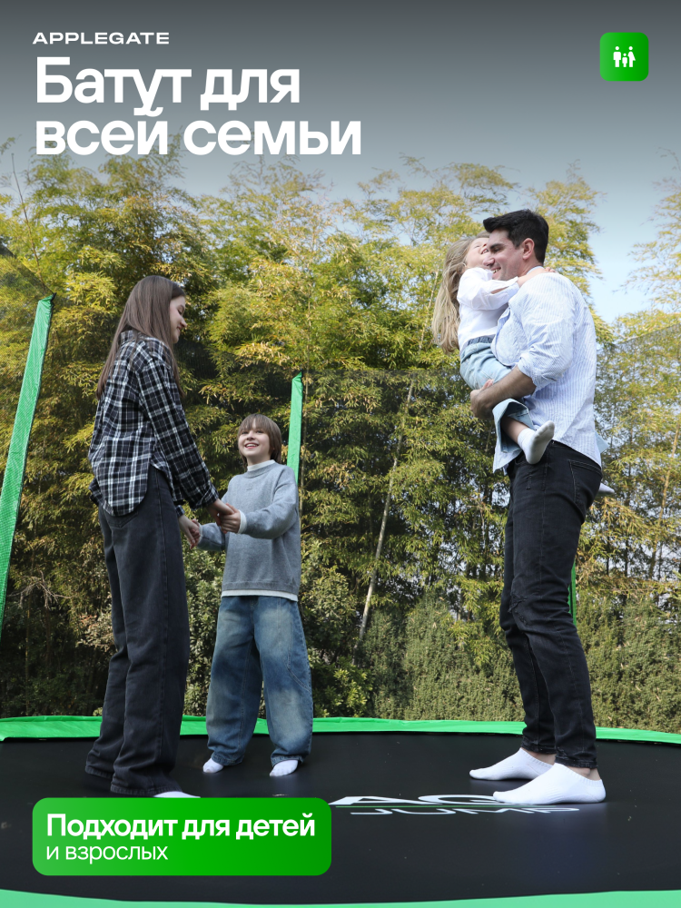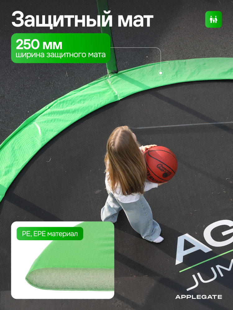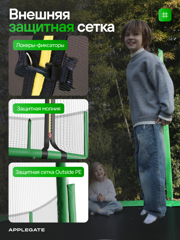 - Идеальное средство для отличного настроения всей семьи – это уличные батуты от бренда APPLEGATE. Более того, это настоящий помощник в поддержании физической формы, ведь благодаря занятиям на батуте отмечается снижение веса, повышение выносливости, тренируется координация и развиваются все группы мышц. Долговечность и безопасность – две основополагающие характеристики при выборе батута от APPLEGATE. Построенные на основе высокопрочной стальной рамы, модели JUMP OPTIMAL рассчитаны на долгие часы прыжков. За соединение всех стальных элементов, обеспечивающих надежность конструкции, отвечает система T-Shaped Component™. Устойчивость на поверхности гарантируют 3 опорные стойки W-образной формы. Допустимый вес пользователя - 150 кг. Общий диаметр модели составляет 10 футов (3,05 м). На батуте 10FT с внутренней страховочной сеткой (Outside PE) используется премиальная серия легендарного полотна из полипропилена Permatron™, произведенного в США, который является самым прочным материалом для прыжковой поверхности. Верхние изогнутые стойки, в количестве 6 штук, оплетены мягкими прорезиненными чехлами из PVC-материала. По окружности рабочей зоны на стойки натянута прочная внутренняя защитная сетка высотой 163 см. В комплекте с батутом предусмотрена лестница длиной 85 см для удобного подъема. Стоит отметить и стильный ярко-зеленый цвет модели, подчеркивающий премиальность и высокий уровень качества продукции. Батуты APPLEGATE JUMP легко собираются своими силами. Для удобства можно посмотреть подробное видео сборки!