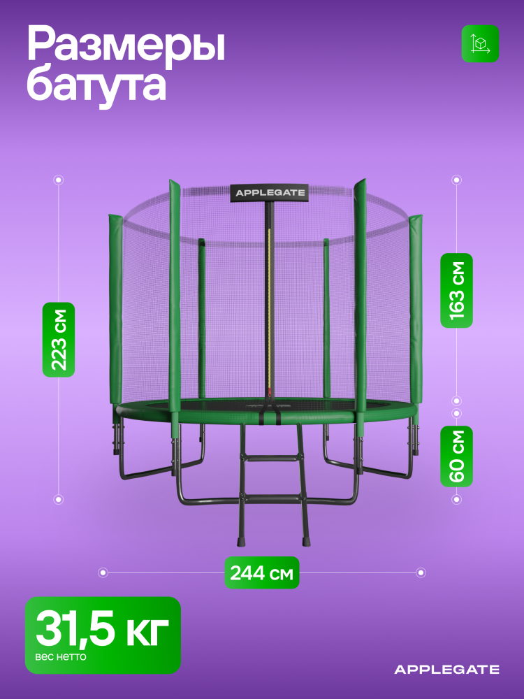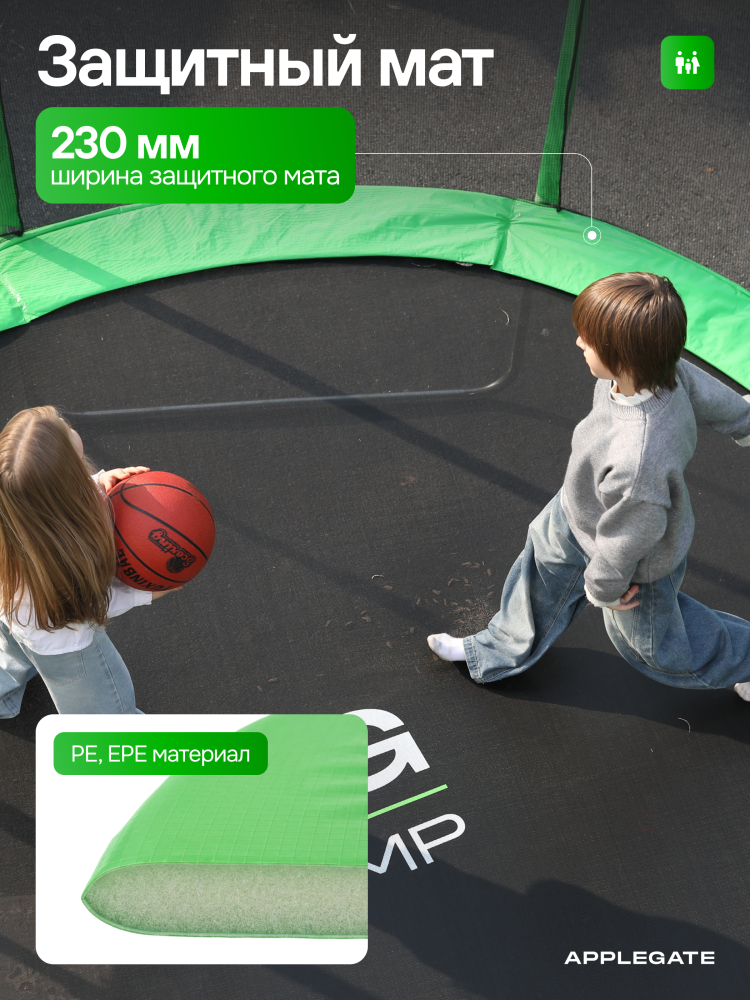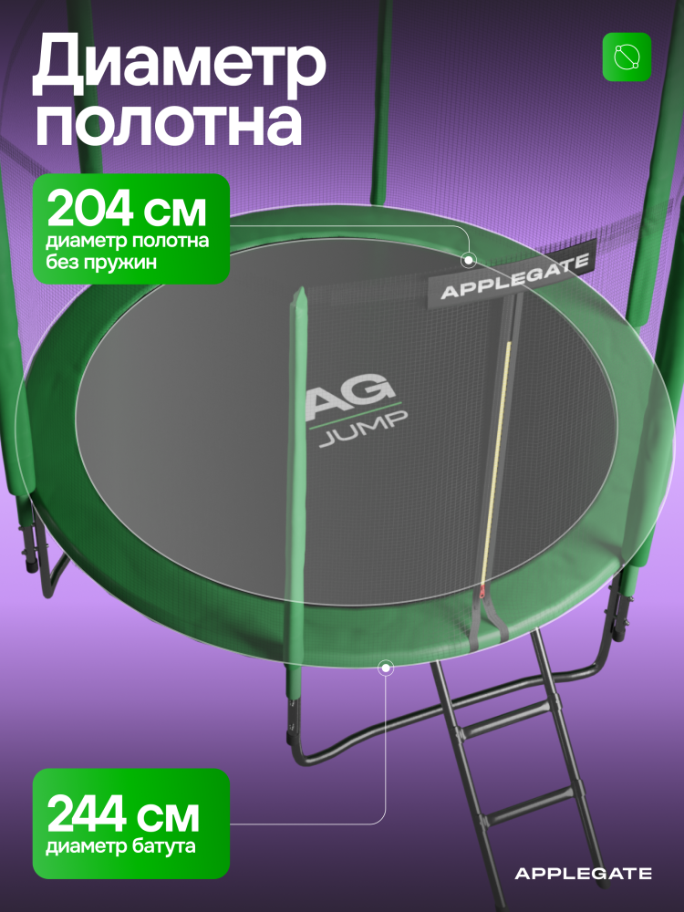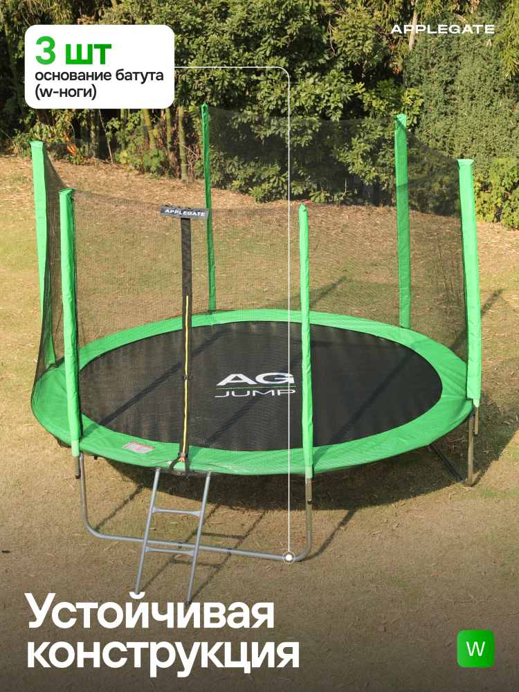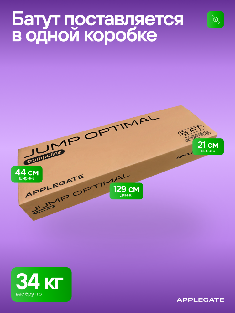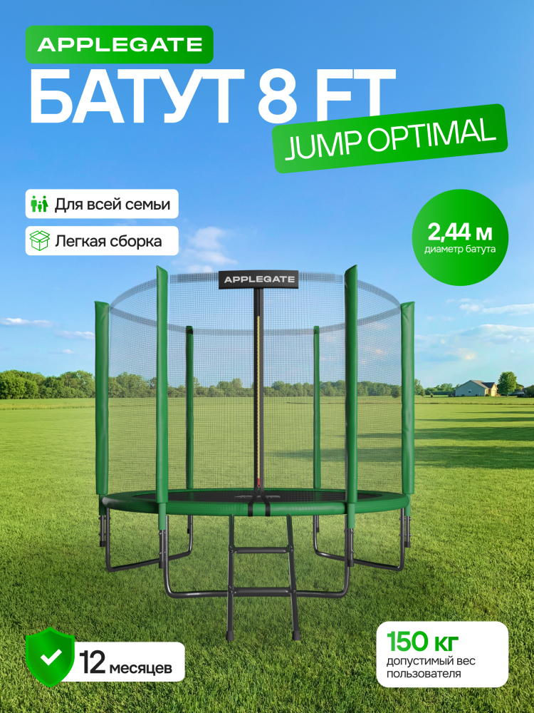 - Идеальное средство для отличного настроения всей семьи – это уличные батуты от бренда APPLEGATE. Более того, это настоящий помощник в поддержании физической формы, ведь благодаря занятиям на батуте отмечается снижение веса, повышение выносливости, тренируется координация и развиваются все группы мышц. Долговечность и безопасность – две основополагающие характеристики при выборе батута от APPLEGATE. Построенные на основе высокопрочной стальной рамы, модели JUMP OPTIMAL рассчитаны на долгие часы прыжков. За соединение всех стальных элементов, обеспечивающих надежность конструкции, отвечает система T-Shaped Component™. Устойчивость на поверхности гарантируют 3 опорные стойки W-образной формы. Допустимый вес пользователя - 150 кг. Общий диаметр модели составляет 8 футов (2,44 м). На батуте 8FT с внутренней страховочной сеткой (Outside PE) используется премиальная серия легендарного полотна из полипропилена Permatron™, произведенного в США, который является самым прочным материалом для прыжковой поверхности. Верхние изогнутые стойки, в количестве 6 штук, оплетены мягкими прорезиненными чехлами из PVC-материала. По окружности рабочей зоны на стойки натянута прочная внутренняя защитная сетка высотой 163 см. В комплекте с батутом предусмотрена лестница длиной 85 см для удобного подъема. Стоит отметить и стильный ярко-зеленый цвет модели, подчеркивающий премиальность и высокий уровень качества продукции. Батуты APPLEGATE JUMP легко собираются своими силами. Для удобства можно посмотреть подробное видео сборки!