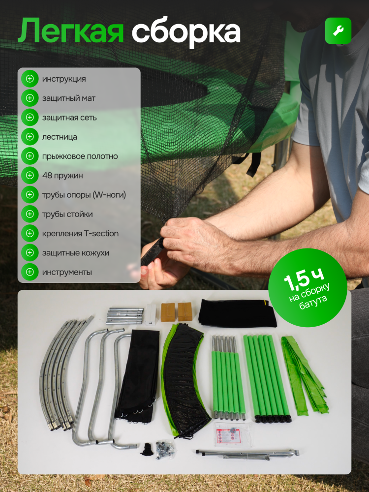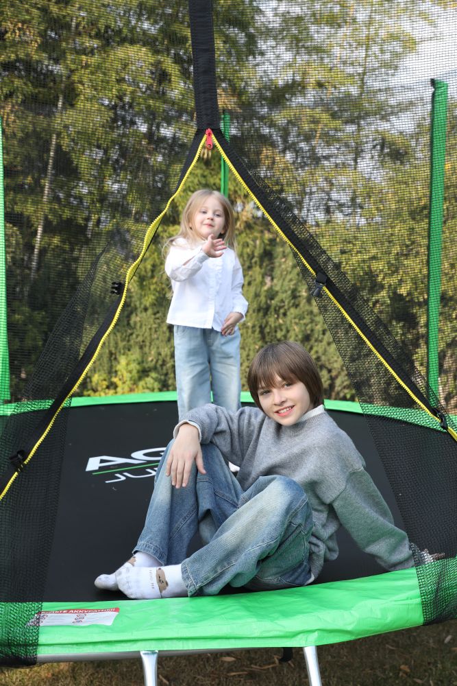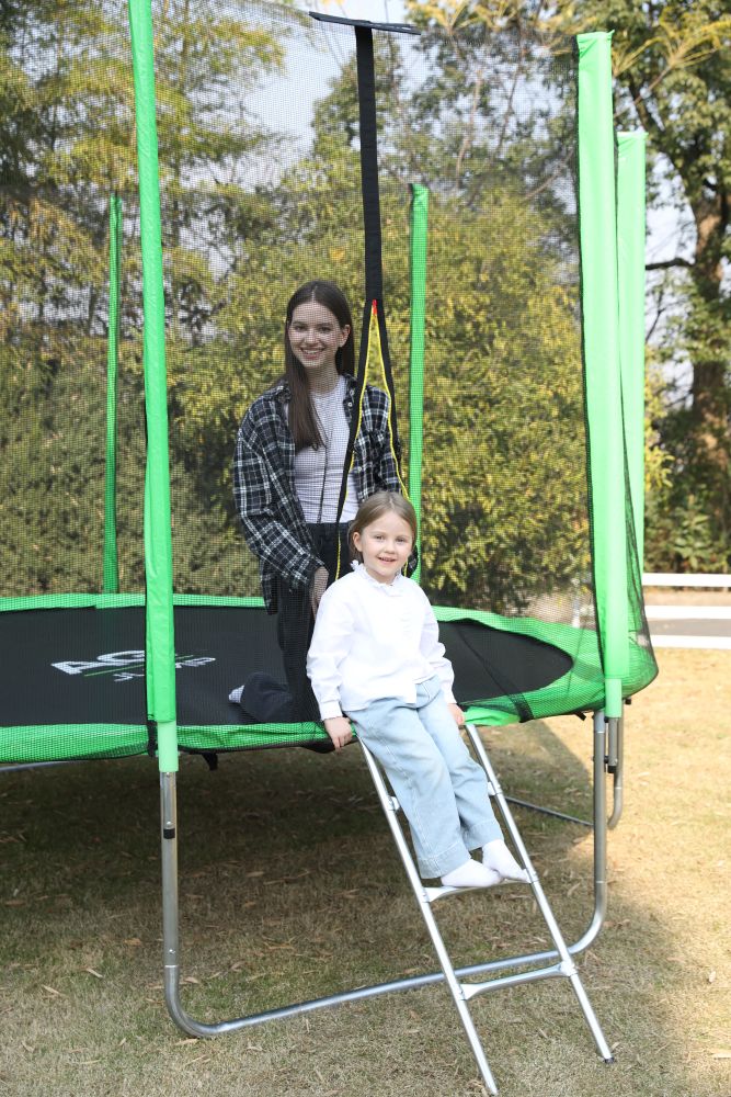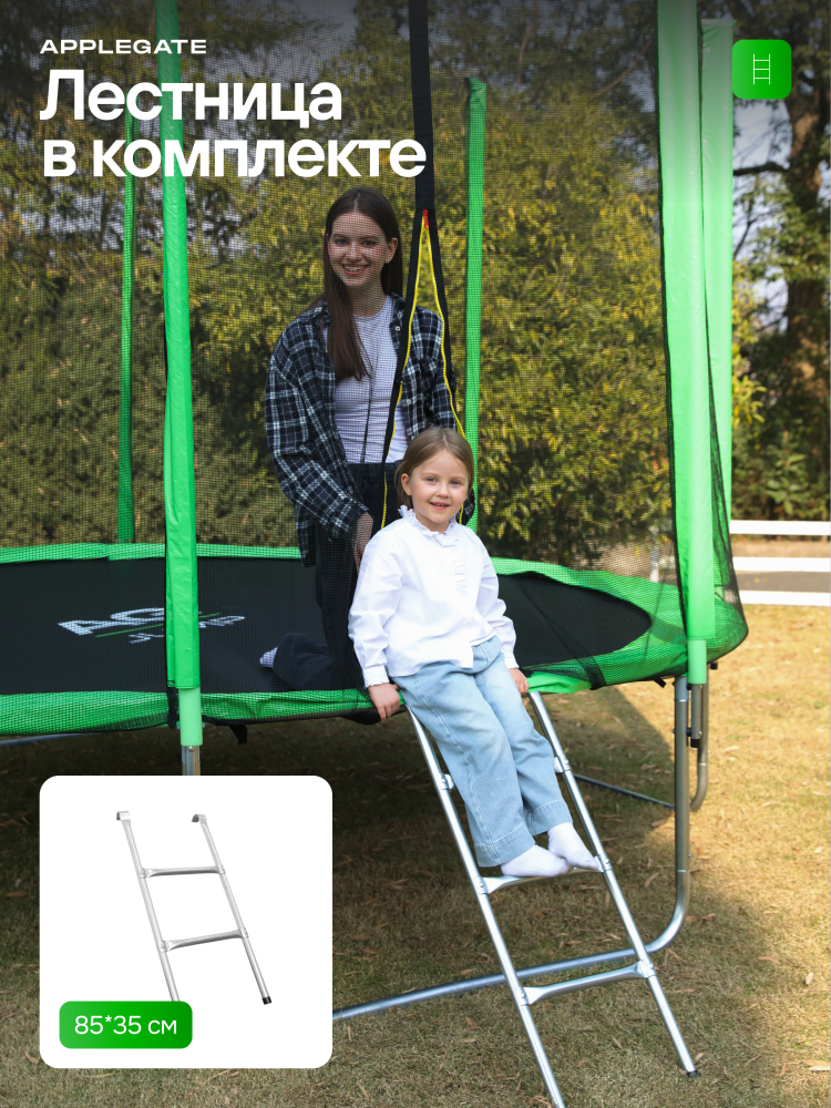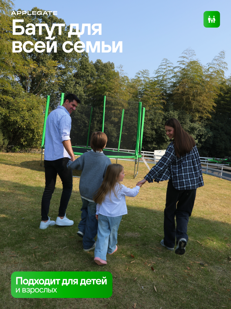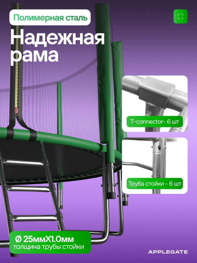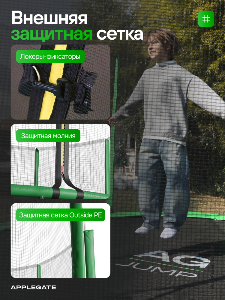 - Идеальное средство для отличного настроения всей семьи – это уличные батуты от бренда APPLEGATE. Более того, это настоящий помощник в поддержании физической формы, ведь благодаря занятиям на батуте отмечается снижение веса, повышение выносливости, тренируется координация и развиваются все группы мышц. Долговечность и безопасность – две основополагающие характеристики при выборе батута от APPLEGATE. Построенные на основе высокопрочной стальной рамы, модели JUMP OPTIMAL рассчитаны на долгие часы прыжков. За соединение всех стальных элементов, обеспечивающих надежность конструкции, отвечает система T-Shaped Component™. Устойчивость на поверхности гарантируют 3 опорные стойки W-образной формы. Допустимый вес пользователя - 150 кг. Общий диаметр модели составляет 8 футов (2,44 м). На батуте 8FT с внутренней страховочной сеткой (Outside PE) используется премиальная серия легендарного полотна из полипропилена Permatron™, произведенного в США, который является самым прочным материалом для прыжковой поверхности. Верхние изогнутые стойки, в количестве 6 штук, оплетены мягкими прорезиненными чехлами из PVC-материала. По окружности рабочей зоны на стойки натянута прочная внутренняя защитная сетка высотой 163 см. В комплекте с батутом предусмотрена лестница длиной 85 см для удобного подъема. Стоит отметить и стильный ярко-зеленый цвет модели, подчеркивающий премиальность и высокий уровень качества продукции. Батуты APPLEGATE JUMP легко собираются своими силами. Для удобства можно посмотреть подробное видео сборки!