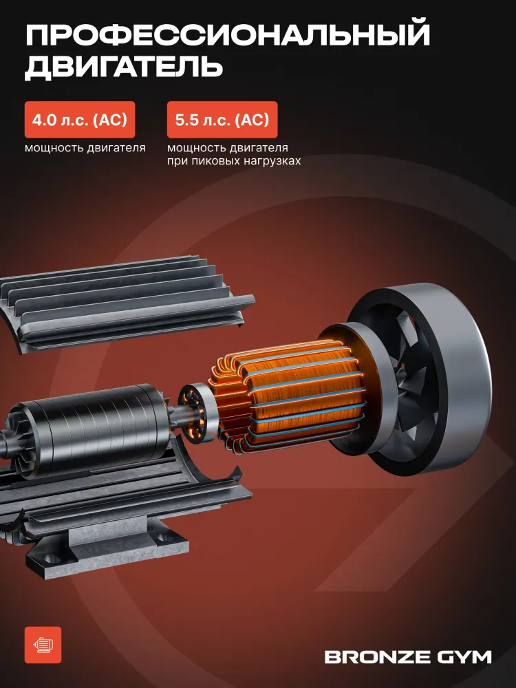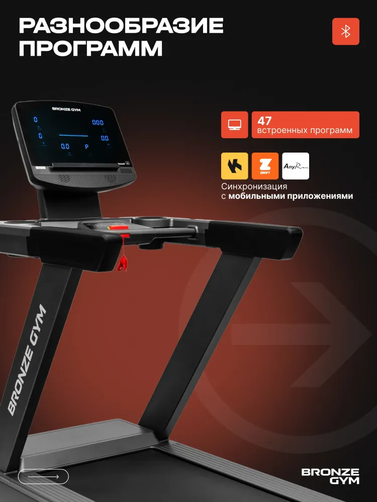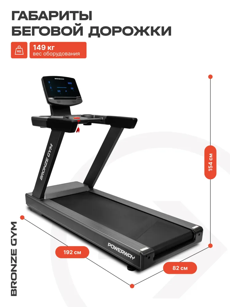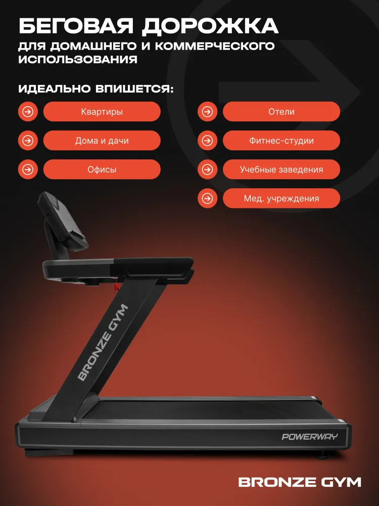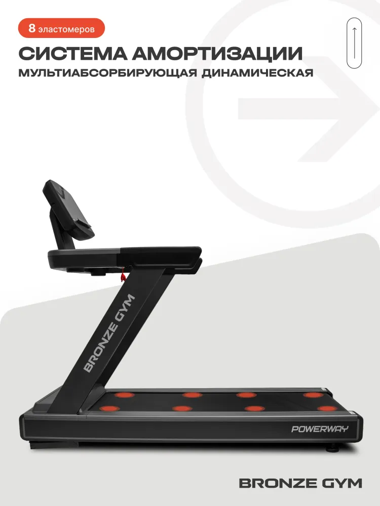 - Встречайте новинку — коммерческая беговая дорожка BRONZE GYM POWERWAY. Достаточно всего один раз на нее взглянуть и становится очевидно — это на 100% рабочая лошадка. Такие тренажеры — это хлеб и соль фитнес-клубов. Все детали и элементы оточены годами, если не десятилетиями. Это отличный вариант для фитнес-клубов любого формата — от небольших уютных студий до крупных сетевых гигантов. А благодаря относительно компактным внешним габаритам дорожка идеально впишется и в офисный спортзал, и учебный центр, в отель, в гостиницу, дом отдыха, санаторий или реабилитационный центр. Это именно профессиональный тренажёр с полным набором всех самых передовых функций. Надёжный, прочный, выносливый, со строгим дизайном по принципу ничего лишнего, только чистые линии». Максимально допустимый вес пользователя составляет внушительные 160 кг, да и сама беговая дорожка весит 133 кг. Всё это следствие прочнейшей конструкции, стабильной в работе и надёжной в эксплуатации. При этом благодаря встроенным транспортировочным роликам переместить в нужное место её можно силами всего лишь одного крепкого мужчины. Во время занятий тренажёр ощущается максимально стабильным и монолитным. Ничего не шатается, и не издаёт посторонних звуков. Беговое полотно усиленное и весьма просторное. Длина 155, ширина 55 см. В движение её приводит электродвигатель мощностью 4 л.c., что позволяет бегать на дорожке с максимальной скоростью в 22 км в час, и этого более чем достаточно даже опытным спортсменам. Наклон полотна регулируется автоматически, программой или кнопками на консоли. Максимальный угол подъема составляет оптимальные 15%. За бережное отношение к нашим суставам и гашение ударных нагрузок во время бега отвечает развитая система амортизации на базе комплекса эластомеров продвинутого уровня. BRONZE GYM POWERWAY — это отличный вариант для реабилитации и физиотерапии. Минимальная скорость движения бегового полотна всего один километр в час и регулируется очень плавно. Широкие направляющие для ног по бокам и большие крепкие поручни для поддержки. Управляющая консоль современного дизайна может похвастаться крупными удобными кнопками с четкими понятными обозначениями и полным переводом всех надписей на русский язык. Крупная четкая индикация с яркой белой подсветкой на нескольких жидкокристаллических экранах отображает все текущие параметры тренировки и режимы работы. Имеется целых 36 встроенных тренировочных программ, в том числе 4 ручных режима, 3 пользовательских, 3 пульсозависимых плюс жироанализатор. Тренироваться с контролем частоты сердечных сокращений можно с помощью датчиков на поручнях или подключив беспроводной нагрудный кардиодатчик. Такой датчик в комплекте не идет и приобретается отдельно. Также к тренажеру через Bluetooth можно подключить смартфон или планшет, разместить на удобной полке и тренироваться. Тренироваться в таких популярных фитнес-приложениях, как Kinomap, Zwift и Any Run. За удобство отвечают два вместительных кармана для фляги с водой, полотенца, телефона, ключей или чего-то еще полезного и необходимого. BRONZE GYM POWERWAY — это плотно сбитый, крепкий и надежный инструмент, насыщенный технологиями и опциями. Такая беговая дорожка — это основа и база кардиозоны любого серьезного фитнес-клуба. Тренируйтесь на здоровье и удовольствие только на самом лучшем. До ск