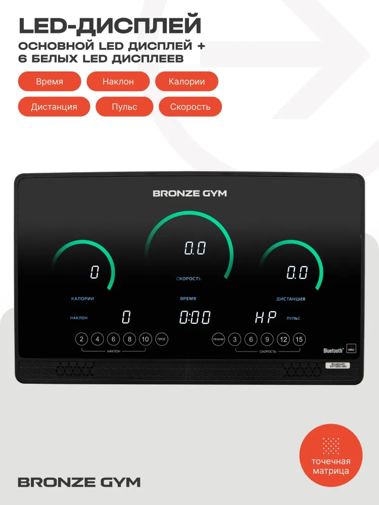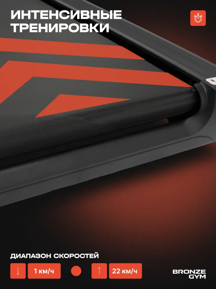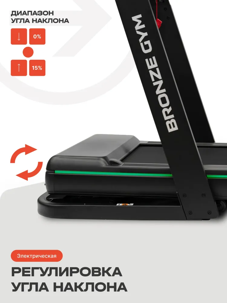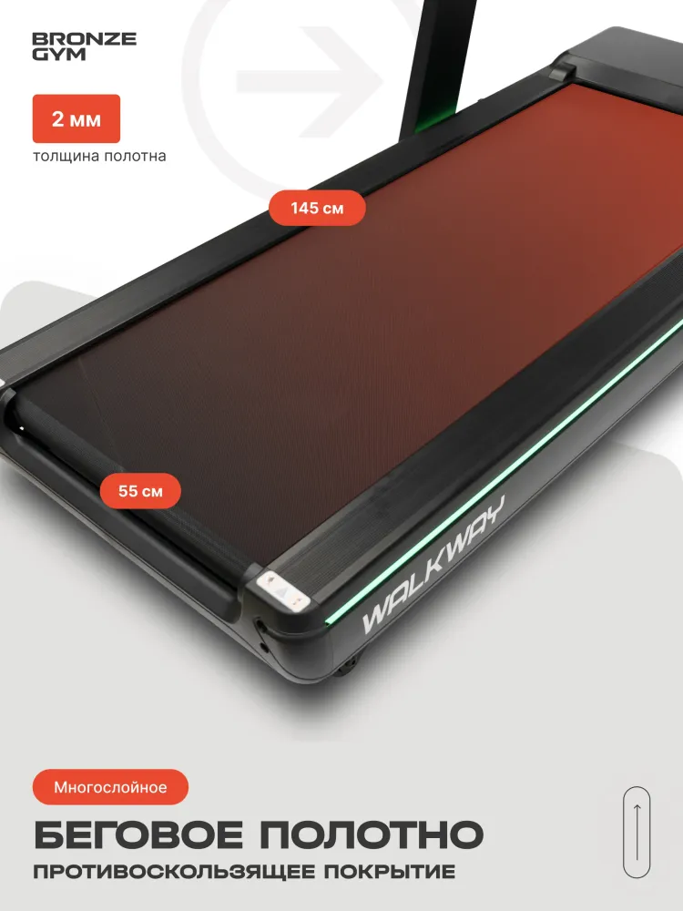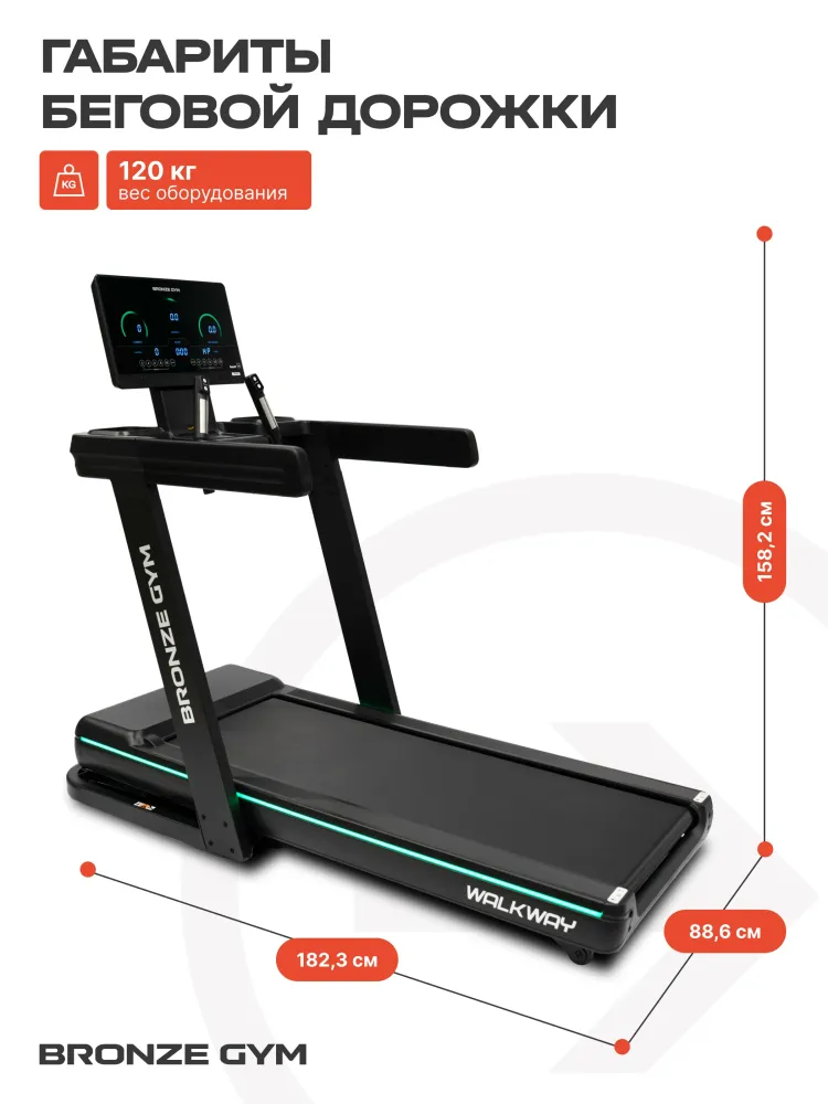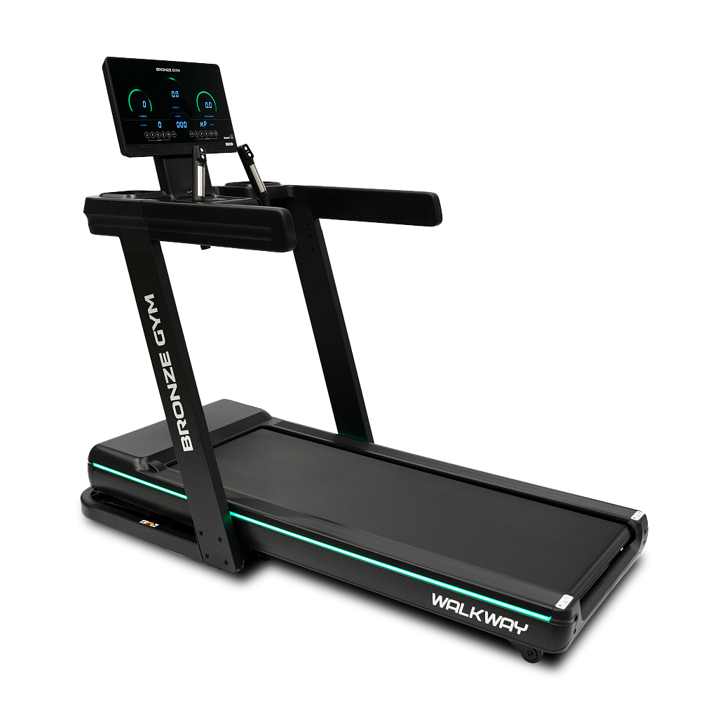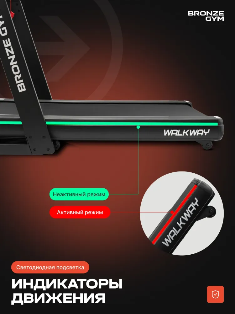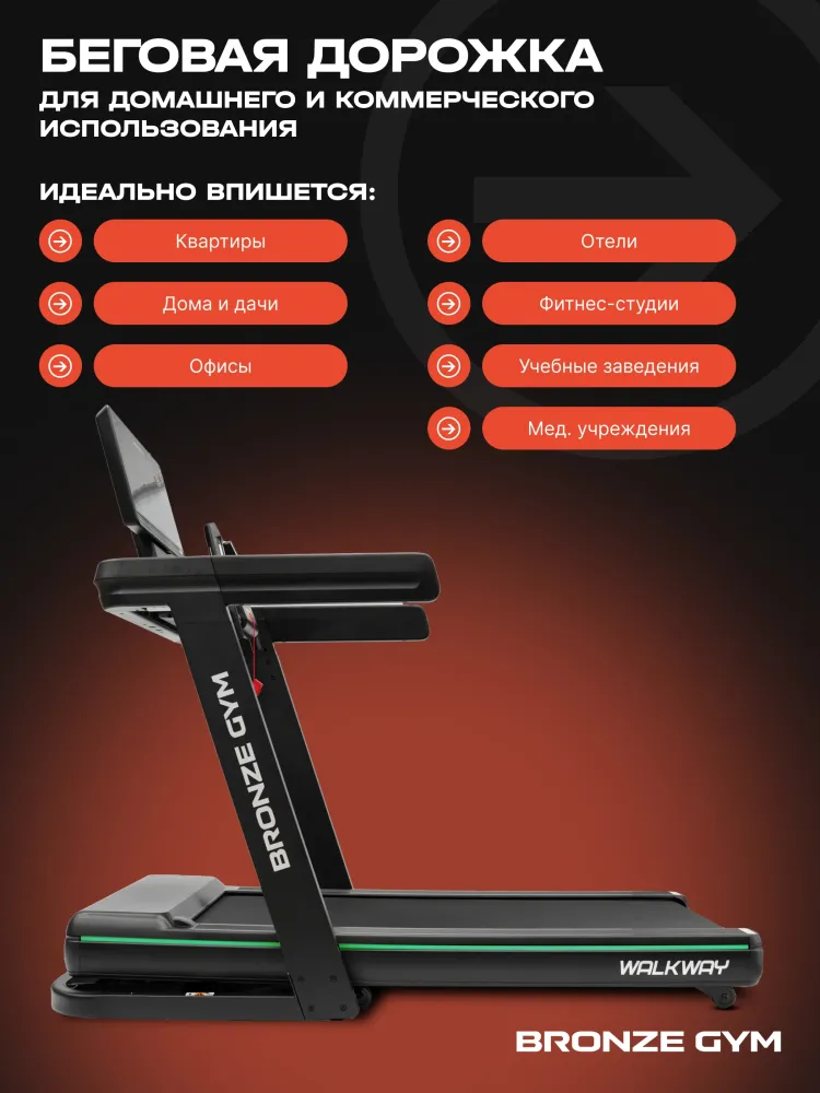 - Встречайте складная коммерческая беговая дорожка BRONZE GYM WALKWAY. Первое, что нужно знать, это складной тренажёр. И в классе полноценного коммерческого оборудования такой, согласитесь, встречается нечасто. В сложенном состоянии, как можете видеть, конструкция весьма компактная. Такой вариант станет отличным выбором для уютной студии фитнеса, офисного спортзала, учебного центра, отеля, гостиницы, дома отдыха или санатория. А еще, например, больницы или реабилитационного центра. И совместить в одной конструкции складную систему хранения и надежность коммерческого оборудования — задача весьма непростая, но вполне доступная инженерам компании BRONZE GYM. Несмотря на относительно компактные внешние габариты, это именно профессиональный тренажёр с полным набором всех самых передовых функций, надёжным прочным конструктивом и строгим премиальным дизайном. Дорожка рассчитана на максимальный вес пользователя в солидные 150 кг и сама по себе весит внушительные 120, что является следствием приличного запаса прочности и надёжности. При этом благодаря встроенным транспортировочным роликам переместить в нужное место её можно силами всего одного крепкого мужчины. Благодаря серьёзной массе и прочной стальной раме во Время работы конструкция ощущается максимально стабильной и монолитной. Ничего не шатается, не люфтит и не издаёт посторонних звуков. Усиленное беговое полотно размером 145 на 55 см в сочетании с электромотором мощностью 3 л.c. Позволяет разогнаться на дорожке до максимальной скорости в 22 км в час. И этого более чем достаточно даже самым продвинутым пользователям. Наклон полотна регулируется автоматически, программой или кнопками на консоли. Максимальный угол подъёма составляет полноценное 15%. Шесть встроенных динамических лостомеров, поглощая удар, обеспечивают развитую амортизацию и дополнительный комфорт, особенно важный пользователям с проблемами суставов. Также это отличный вариант для реабилитационной физиотерапии. Минимальная скорость движения полотна всего 1 км в час, широкие направляющие для ног по бокам и большие крупные поручни для надёжной опоры. Дизайн дополнил светодиодной подсветкой, которая не только создаёт приятный внешний вид, но и имеет практическое применение. Она горит зелёным светом, когда дорожка не работает, и красным, когда включена. С одного взгляда даже с большого расстояния понятно, занят тренажёр или свободен. Элементы управления собраны в одном удобном месте. Кнопки крупные и чёткие, все надписи переведены на русский язык. На консоли с контрастным жидкокристаллическим дисплеем отображается вся необходимая информация о процессе тренировки. Имеется целых 36 тренировочных программ, в том числе 4 ручных режима, 3 пользовательских, 3 пульсозависимых плюс встроенный жироанализатор. Показания пульса можно контролировать с помощью специальных датчиков на поручнях или подключив беспроводной нагрудный кардио датчик. Датчик в комплекте не идёт и приобретается отдельно. К тренажёру через Bluetooth можно подключить смартфон или планшет, разместить на удобной полке и тренироваться в таких популярных фитнес-приложениях, как Kinomap и Zwift. На удобной просторной полке есть два очень вместительных кармана для всяких нужных мелочей — от фляги с водой до полотенца, телефона, ключей или чего-то еще. И, конечно, бесп