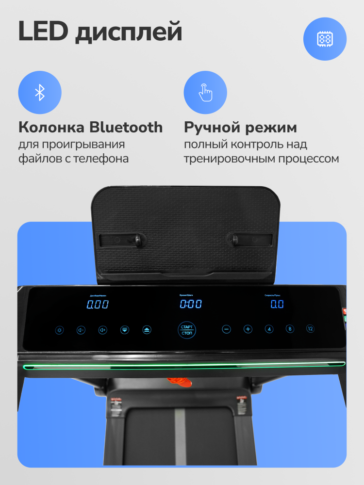 - Applegate Stroke — электрическая беговая дорожка, которая станет вашим надежным помощником для домашних тренировок. Стильный дизайн, функциональность и внимание к деталям делают эту модель универсальным решением как для новичков, так и для опытных пользователей. Двигатель Schneider Electric мощностью 1,75 л.с. с пиковым показателем 3 л.с. обеспечивает плавный и стабильный разгон скорости от 1 до 15 км/ч. Комфортное беговое полотно размером 122х46 см с толщиной 1,6 мм и парафинированной декой (15 мм) идеально подходит для эффективных и безопасных тренировок. Полотно поддерживает 15 уровней наклона, которые регулируются для увеличения нагрузки. Три LED-дисплея с синей индикацией выводят данные на русском и английском языках: время, скорость, дистанцию, калории, пульс и уровень наклона. Встроенный Bluetooth позволяет подключаться к тренировочным приложениям Spax™ и Kinomap™ и синхронизировать дорожку с мобильным устройством для удобства тренировок. Также Bluetooth поддерживает проигрывание музыки через встроенную колонку, что добавляет дополнительный комфорт во время занятий. Для измерения пульса в поручни встроены сенсорные датчики, которые позволяют отслеживать пульс в реальном времени, обеспечивая более точный контроль за тренировочным процессом. Эта модель рассчитана на пользователей весом до 130 кг. Дорожка весит 49,6 кг, легко складывается и хранится вертикально, экономя место. В сложенном виде ее размеры составляют 156,7х78х33,5 см. Для удобства управления клавиши расположены на поручнях, которые дополнительно складываются, а ключ безопасности обеспечивает максимальную защиту. Applegate Stroke поставляется в полностью собранном виде, готовая к использованию сразу после распаковки. Ключевые преимущества Applegate Stroke: • скорость от 1 до 15 км/ч; • беговое полотно 122х46 см с 15 уровнями наклона; • три LED-дисплея с синей индикацией; • Bluetooth для синхронизации с приложениями и проигрывания музыки; • сенсорные датчики на поручнях для измерения пульса; • складные поручни и вертикальное хранение.