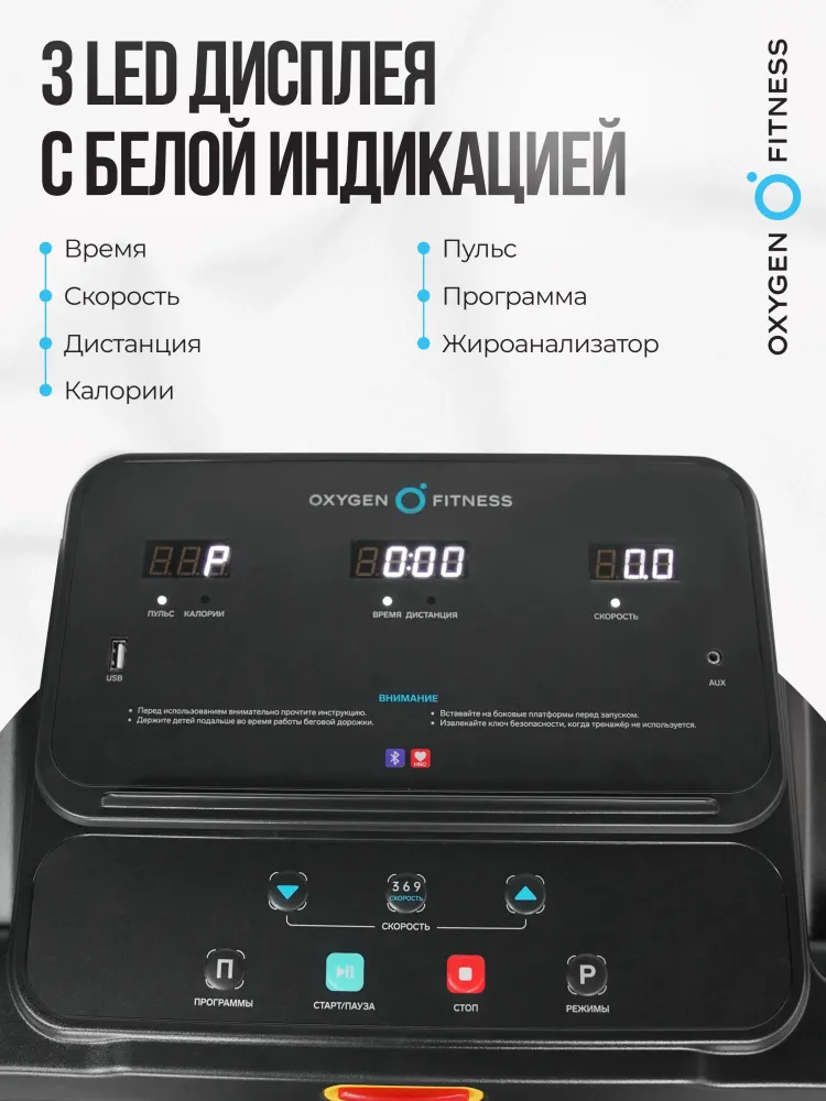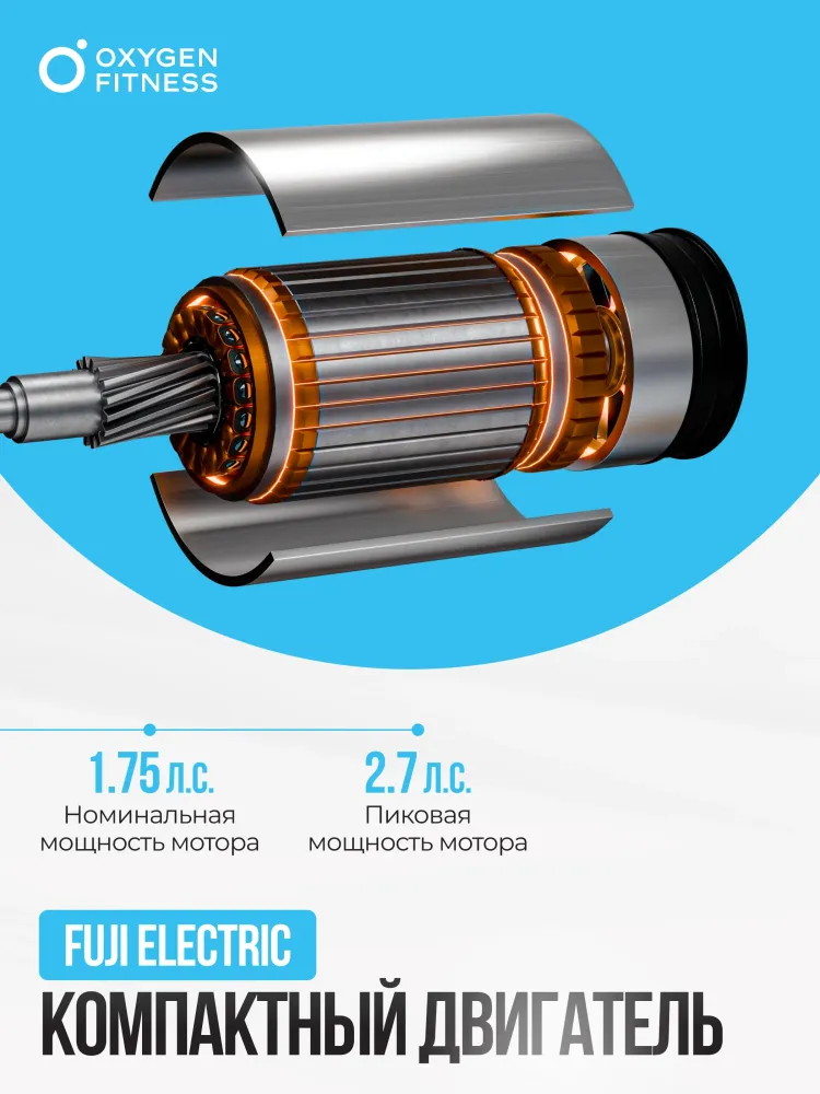 - Беговая дорожка OXYGEN FITNESS NIOBI — идеальный тренажер для тех, кто хочет поддерживать физическую форму, не выходя из дома. Эта электрическая беговая дорожка оснащена мощным двигателем Fuji Electric мощностью 1.75 л.с. (пиковая мощность 2.7 л.с.), который позволяет развивать скорость до 12 км/ч. Благодаря высокопрочной раме с антикоррозийной обработкой и двухслойной покраской, она обеспечивает надежность и долговечность в использовании. Дорожка имеет беговое полотно длиной 105 см и шириной 39 см, что обеспечивает достаточное пространство для комфортного бега. Система амортизации HighSoft Zone™ снижает нагрузку на суставы, а ручная регулировка угла наклона позволяет варьировать интенсивность тренировок. Для вашего удобства предусмотрены сенсорные датчики на поручнях для измерения пульса и кнопки управления стартом и скоростью. Консоль OXYGEN FITNESS NIOBI оборудована тремя LED-дисплеями с белой индикацией, на которых отображаются важные параметры: время, скорость, дистанция, калории, пульс и программы. Дорожка предлагает 17 различных программ, включая ручной режим, 12 предустановленных и 3 пульсозависимые, что позволяет каждому подобрать оптимальный вариант для тренировок. Интуитивно понятный интерфейс на русском и английском языках делает использование тренажера простым и удобным. С OXYGEN FITNESS NIOBI ваш домашний фитнес станет не только более доступным, но и эффективным! Ключевые преимущества XYGEN FITNESS NIOBI: • ударопрочный пластик HIPS и высокопрочная рама с антикоррозийной обработкой для долговечности; • система амортизации HighSoft Zone™ для комфортных тренировок; • 17 программ тренировок для разнообразия и эффективности подходов.