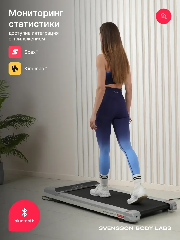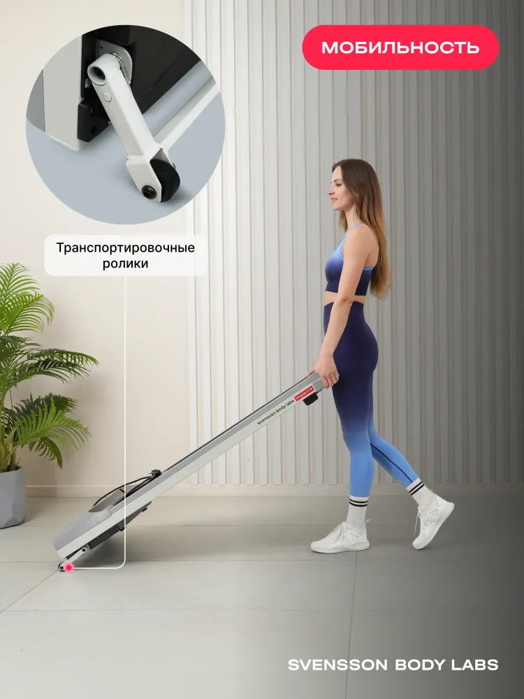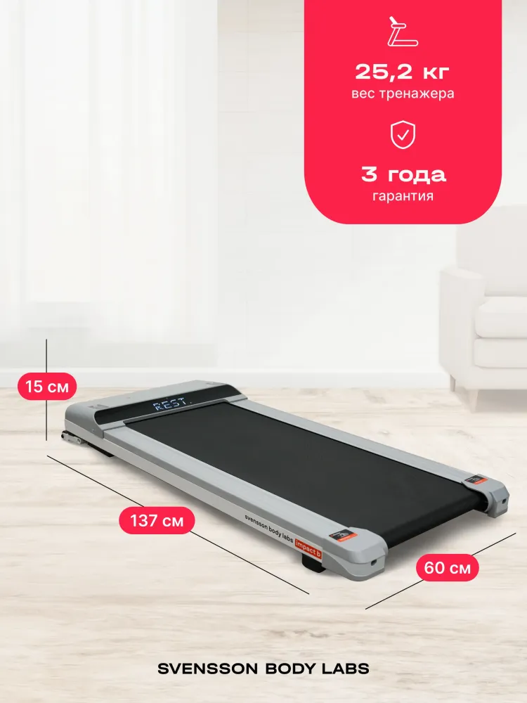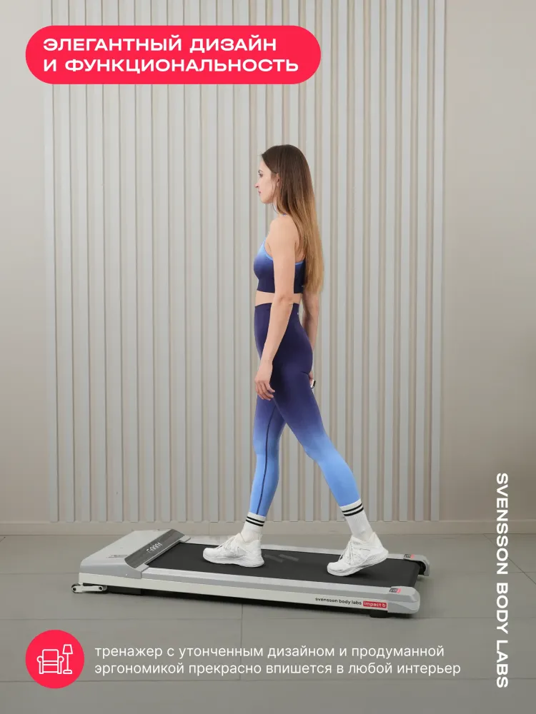 - Svensson Body Labs IMPACT B — беговая дорожка, воплощающая стиль и технологии в новом светлом монохромном дизайне. Эта модель создана для домашних тренировок, сочетая современный минимализм, комфорт и надежность. Она идеально впишется в любой интерьер и станет надежным спутником на пути к здоровому образу жизни. Электрическая беговая дорожка оснащена бесщеточным двигателем Mitsubishi Motors Corporation с мощностью 1,35 л.с. DC и пиковым показателем 2,5 л.с., что обеспечивает плавный разгон скорости от 1 до 10 км/ч. Комфортное беговое полотно размером 105х41 см с толщиной 1,6 мм и парафинированной декой (12 мм). LED-дисплей с белой индикацией отображает ключевые параметры тренировки. Для синхронизации с мобильными приложениями Spax™ и Kinomap™ предусмотрен встроенный Bluetooth. IMPACT B сочетает компактность, функциональность и готовность к использованию прямо из коробки. Вес тренажера составляет всего 25,2 кг, а его размеры составляют 137х60х15 см, что позволяет хранить дорожку в вертикальном положении у стены. При этом дорожка выдерживает максимальный вес пользователя до 100 кг, что делает ее универсальным решением для всей семьи. Ключевые преимущества Svensson Body Labs IMPACT B: • скорость от 1 до 10 км/ч; • комфортное беговое полотно 105х41 см; • синхронизация с приложениями через Bluetooth; • легкий вес и вертикальное хранение.