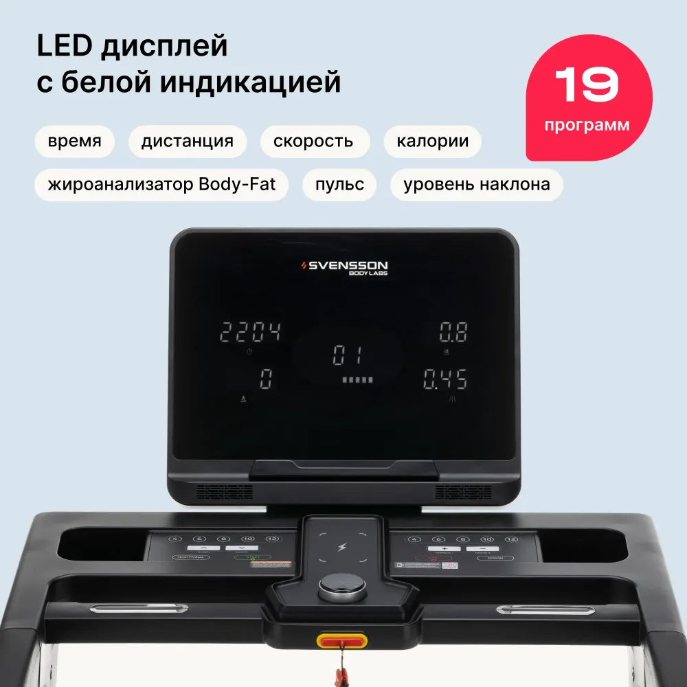 - Svensson Body Labs Physioline Sprintmaster A — настоящий чемпион в мире домашнего фитнеса! Эта электрическая беговая дорожка обладает всеми необходимыми характеристиками, чтобы помочь вам достичь ваших фитнес-целей прямо у себя дома. Специально антикоррозийная обработка и покрытие гарантируют долговечность и стойкость рамы. Скорость регулируется в диапазоне от 1 до 20 км/ч, благодаря двигателю мощностью 3.5 л.с. (с пиковой мощностью 5.0 л.с.), вы сможете настроить тренировку под себя. Беговое полотно с антискользящим покрытием толщиной 1.6 мм и размером 140*51 см предлагает просторную и безопасную поверхность для бега. Электрическая регулировка угла наклона с 12 уровнями позволяет вам сделать тренировку более интенсивной и разнообразной. Беспроводной приемник HRC обеспечивает более точное измерение пульса. Нагрудный кардиодатчик приобретается отдельно. Шестизональный LED-дисплей с белой индикацией и многофункциональный дисплей шайба диаметром 61 мм отображают показания, такие как время, скорость, дистанция, уровень наклона, калории, пульс, шаги, жироанализатор (Body-Fat), профиль программы и статус Bluetooth. Всего доступно 19 программ тренировок, включая ручной режим, жироанализатор, встроенные, пользовательские и пульсозависимые программы. Sprintmaster A также оснащена мультимедийными возможностями, включая воспроизведение аудиофайлов через динамики мощностью 5 Ватт и разъем USB для удобства подключения. Интеграция Bluetooth позволяет работать с популярными тренировочными мобильными приложениями, такими как Fitshow, Kinomap и ZWIFT. Удобство использования и хранения является одним из преимуществ этой беговой дорожки. Двухфазная гидравлическая система Easy Drop™ позволяет плавно поднять беговую поверхность для удобного хранения. Плюс ко всему здесь есть беспроводная зарядка для ваших смартфонов. С транспортировочными роликами и компенсаторами неровностей пола, вы легко переместите дорожку и установите ее на любой поверхности.