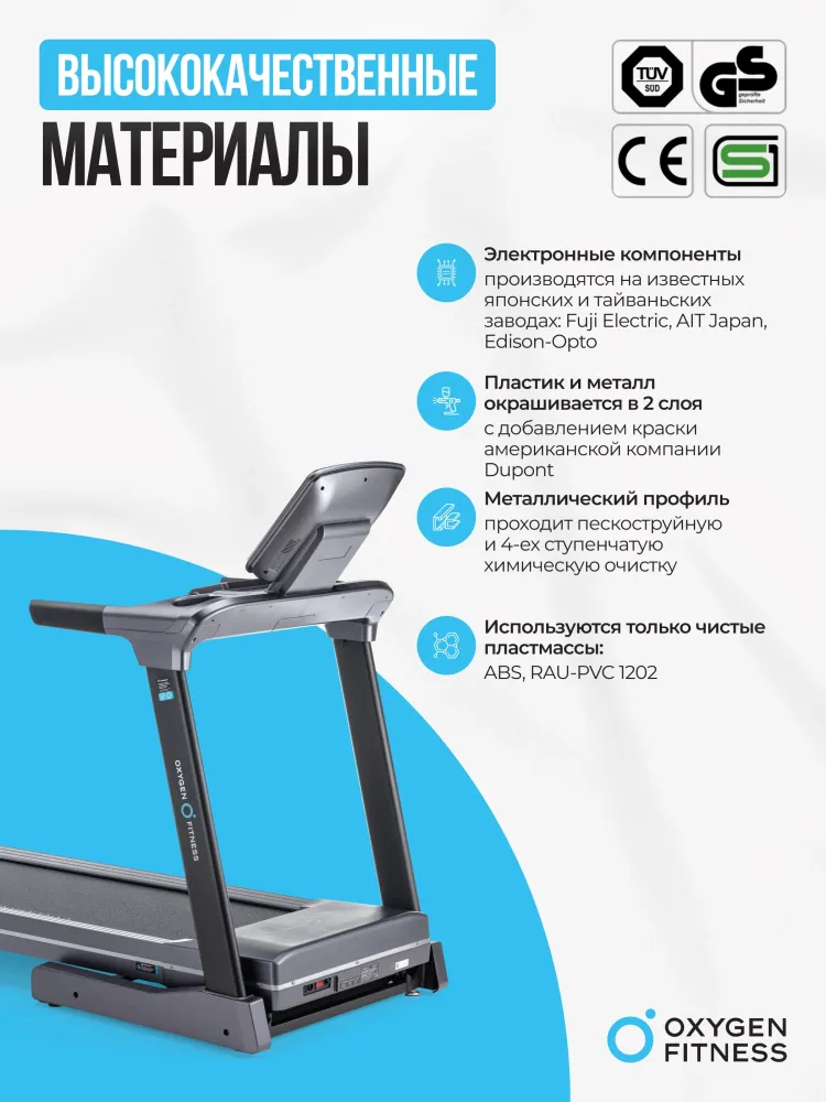 - Представляем вашему вниманию беговую дорожку OXYGEN FITNESS COBALT LCD PRO— идеальный выбор для тех, кто стремится к высшему уровню в тренировках, будь то дома или в профессиональном фитнес-центре. Эта модель воплощает в себе передовые технологии и высокое качество, предлагая пользователям превосходные условия для эффективных и комфортных тренировок. Мощный двигатель Fuji Electric AC с пиковой мощностью 5,8 л.с. обеспечивает невероятную производительность и бесшумную работу, что делает тренировки не только продуктивными, но и приятными. Независимо от того, только ли вы начинаете свой путь в фитнесе или уже опытный спортсмен, возможность регулировать скорость в диапазоне от 0,8 до 18 км/ч позволит вам добиться желаемых результатов. Высокопрочная рама с антикоррозийной обработкой гарантирует, что дорожка прослужит вам долгие годы, сохраняя первозданный вид и функциональность. Просторное беговое полотно размером 140 см на 51 см, изготовленное из многослойного полимерного материала Habasit NVT-218 толщиной 1,8 мм, дарит вам уверенность и комфорт на каждом шагу. Хотите разнообразить тренировки? Электрическая регулировка угла наклона позволит вам менять интенсивность и сложность упражнений всего одним нажатием кнопки. Основное внимание уделено и вашему комфорту — 10-дюймовый LCD дисплей выводит на экран все ключевые показатели тренировки: от времени и скорости до пульса и сожженных калорий. Хотите добавить интерактивности? Подключите дорожку к своим любимым мобильным приложениям Fitshow™ и Kinomap™ через Bluetooth и отслеживайте свой прогресс с максимальной точностью. 17 разнообразных программ тренировок, включая целевые и пульсозависимые, позволят вам выбрать идеальную программу для достижения ваших целей, будь то снижение веса, увеличение выносливости или поддержание физической формы. А возможность использования ручного режима и встроенный жироанализатор позволят вам контролировать тренировки и максимально адаптировать их под ваши нужды. OXYGEN FITNESS COBALT LCD PRO не только высокотехнологична, но и удобна в использовании. Сенсорные датчики на поручнях точно измеряют ваш пульс, а беспроводной приемник HRC поддерживает работу с кардиодатчиками, которые можно приобрести отдельно для еще большей точности. Встроенные транспортировочные ролики и компенсаторы неровностей пола обеспечат простоту перемещения и установки дорожки в любом месте вашего дома или фитнес-зала. Складная конструкция с двухфазной гидравлической системой easyFOLD™ делает хранение дорожки максимально удобным. В сложенном виде она занимает всего 128 см в длину, 89 см в ширину и 160 см в высоту, что позволит вам экономить пространство, не жертвуя качеством тренировок. С максимальным весом пользователя до 150 кг и весом самой дорожки 90 кг, OXYGEN FITNESS COBALT LCD PRO является эталоном устойчивости и надежности, помогая вам стать лучшей версией себя и быть вашим надежным партнером на пути к здоровью и успеху! Ключевые преимущества OXYGEN FITNESS OXYGEN FITNESS COBALT LCD PRO: • диапазон скоростей от 0,8 до 18 км/ч; • большое беговое полотно Habasit NVT-218 толщиной 1,8 мм, длиной 140 см и шириной 51 см; • интеграция с мобильными приложениями Fitshow™ и Kinomap™ через Bluetooth; • максимальный вес пользователя до 150 кг; • 17 встроенных программ тренировок;
