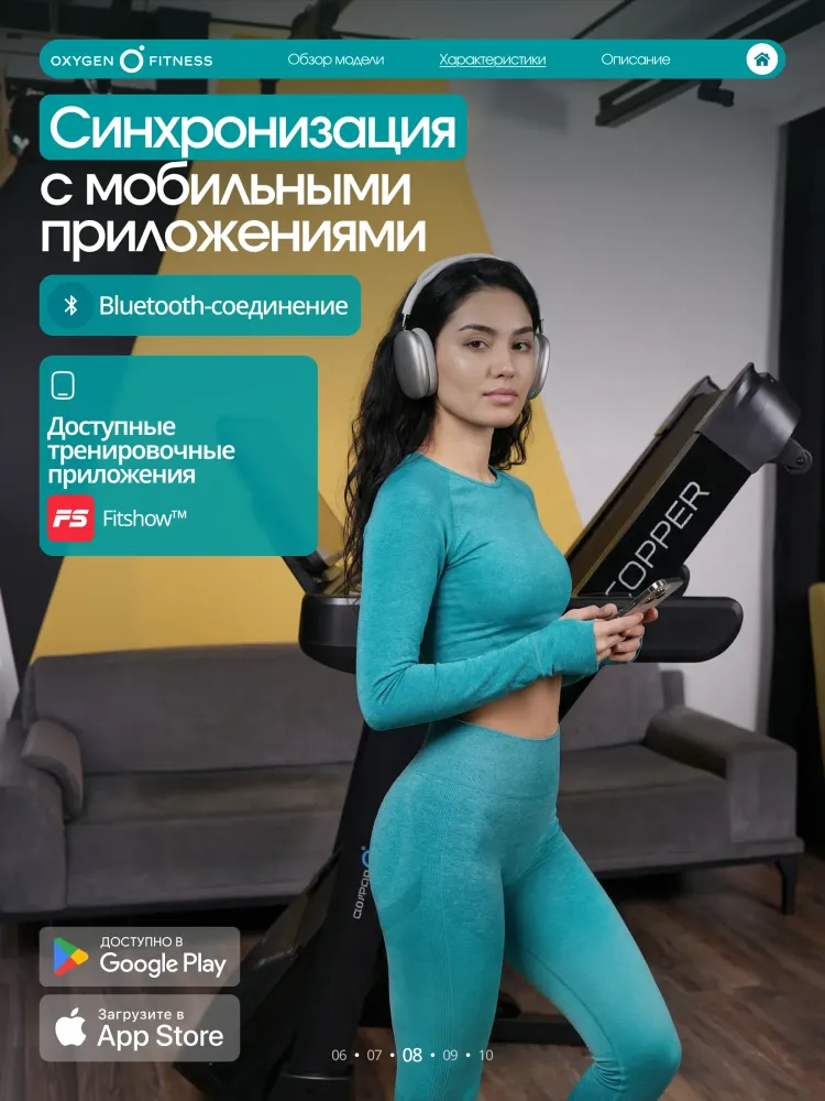 - OXYGEN FITNESS COPPER — мощная электрическая беговая дорожка премиального уровня для полукоммерческого использование с интенсивной нагрузкой. Модель ориентирована на пользователей, которым важны высокая скорость, широкий беговой простор, продвинутая амортизация и современные технологии комфорта. COPPER подходит как для регулярных пробежек, так и для серьёзных тренировок с электронным наклоном и контролем показателей, обеспечивая ощущение клубного уровня у себя дома. В основе дорожки — массивная высокопрочная рама с антикоррозийной обработкой и двухслойной покраской, рассчитанная на долгий срок службы. Корпус выполнен из ударопрочного полистирола HIPS, устойчивого к механическим нагрузкам. Беговое полотно размером 140 × 52 см и толщиной 1,6 мм создаёт просторную и безопасную зону для естественного шага и быстрого бега. Парафинированная дека из МДФ толщиной 12 мм обеспечивает стабильность и плавность хода. За снижение ударной нагрузки отвечает профессиональная система амортизации на базе 8 динамических эластомеров VCS™, эффективно защищающая суставы и позвоночник даже при высокой интенсивности тренировок. Электронная регулировка угла наклона с 15 уровнями позволяет точно управлять нагрузкой и имитировать бег в гору. OXYGEN FITNESS COPPER оснащена мощным двигателем 3.5 л.с. DC Fuji Electric с пиковой мощностью 5.8 л.с., обеспечивающим стабильную работу в диапазоне скоростей от 1 до 22 км/ч — от разминки до скоростного бега. Консоль и управление: • LED-дисплей с белой индикацией, • отображение: время, скорость, дистанция, калории, пульс, программа, жироанализатор, • сенсорные датчики пульса на поручнях. Программный пакет включает 30 тренировочных режимов: • ручной режим, • 24 предустановленные программы, • 3 пользовательские программы, • 1 пульсозависимую программу, • жироанализатор. Дополнительные возможности: • Bluetooth-колонки для воспроизведения музыки, • Bluetooth для подключения к приложению Fitshow™, • возможность подключения Bluetooth-кардиодатчика, • беспроводная зарядка смартфона, • подставка под планшет или смартфон, • отсеки для аксессуаров. OXYGEN FITNESS COPPER — мощная, технологичная и надёжная беговая дорожка для тех, кто хочет тренироваться дома на уровне профессионального фитнес-клуба.