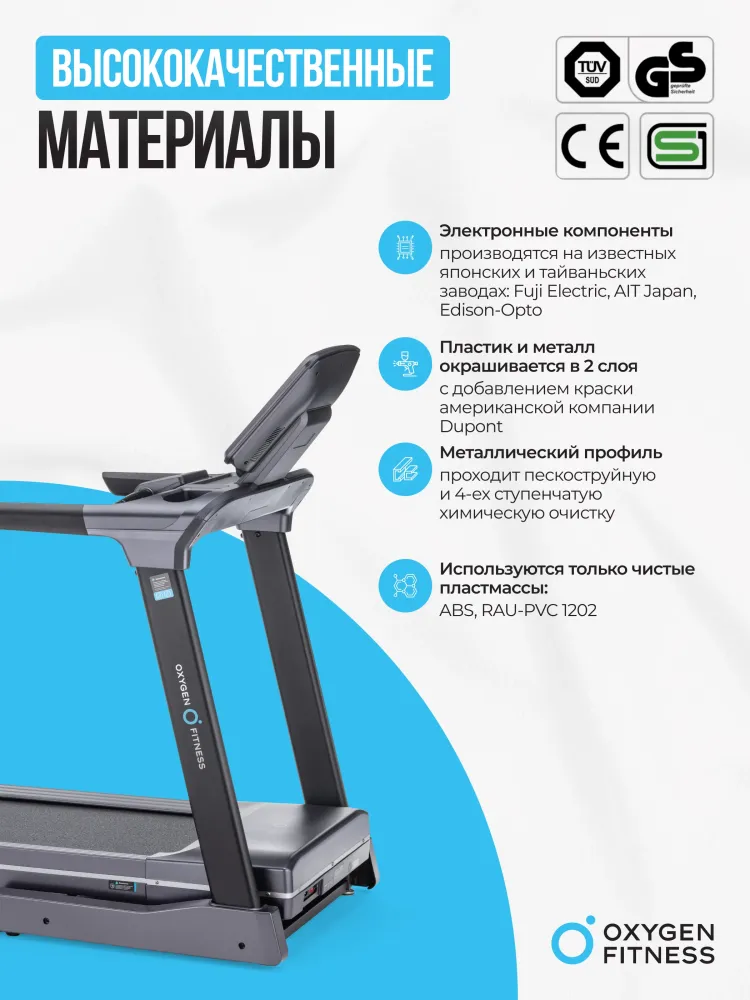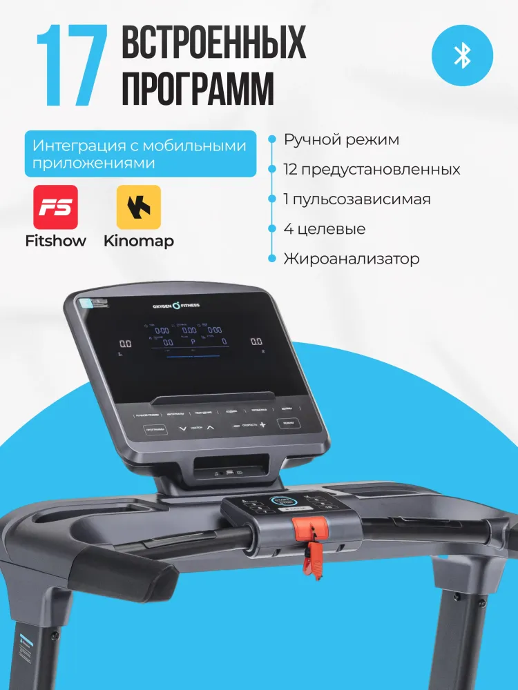 - Представляем вашему вниманию беговую дорожку OXYGEN FITNESS PALLADIUM LCD PRO — идеальный выбор для тех, кто стремится к высшему уровню в тренировках, будь то дома или в небольших клубах, отелях или реабилитационных центрах. Эта модель воплощает в себе передовые технологии и высокое качество, предлагая пользователям превосходные условия для эффективных и комфортных тренировок. Мощный двигатель Fuji Electric AC с пиковой мощностью 6,5 л.с. обеспечивает невероятную производительность и бесшумную работу, что делает тренировки не только продуктивными, но и приятными. Независимо от того, только ли вы начинаете свой путь в фитнесе или уже опытный спортсмен, возможность регулировать скорость в диапазоне от 0,8 до 18 км/ч позволит вам добиться желаемых результатов. Высокопрочная рама с антикоррозийной обработкой гарантирует, что дорожка прослужит вам долгие годы, сохраняя первозданный вид и функциональность. Просторное беговое полотно размером 150 см на 51 см, изготовленное из многослойного полимерного материала Habasit NVT-218 толщиной 1,8 мм, дарит вам уверенность и комфорт на каждом шагу. Хотите разнообразить тренировки? Электрическая регулировка угла наклона позволит вам менять интенсивность и сложность упражнений всего одним нажатием кнопки. Основное внимание уделено и вашему комфорту — 10-дюймовый LCD дисплей выводит на экран все ключевые показатели тренировки: от времени и скорости до пульса и сожженных калорий. Хотите добавить интерактивности? Подключите дорожку к своим любимым мобильным приложениям Fitshow™ и Kinomap™ через Bluetooth и отслеживайте свой прогресс с максимальной точностью. 17 разнообразных программ тренировок, включая целевые и пульсозависимые, позволят вам выбрать идеальную программу для достижения ваших целей, будь то снижение веса, увеличение выносливости или поддержание физической формы. А возможность использования ручного режима и встроенный жироанализатор позволят вам контролировать тренировки и максимально адаптировать их под ваши нужды. OXYGEN FITNESS PALLADIUM LCD PRO не только высокотехнологична, но и удобна в использовании. Сенсорные датчики на поручнях точно измеряют ваш пульс, а беспроводной приемник HRC поддерживает работу с кардиодатчиками, которые можно приобрести отдельно для еще большей точности. Встроенные транспортировочные ролики и компенсаторы неровностей пола обеспечат простоту перемещения и установки дорожки в любом месте вашего дома или фитнес-зала. Складная конструкция с двухфазной гидравлической системой easyFOLD™ делает хранение дорожки максимально удобным. В сложенном виде она занимает всего 128 см в длину, 89 см в ширину и 160 см в высоту, что позволит вам экономить пространство, не жертвуя качеством тренировок. С максимальным весом пользователя до 160 кг и весом самой дорожки 100 кг, OXYGEN FITNESS PALLADIUM LCD PRO — это стандарт устойчивости и надежности, который поможет вам стать лучшей версией себя! Ключевые преимущества OXYGEN FITNESS PALLADIUM LCD PRO: • диапазон скоростей от 0,8 до 18 км/ч; • большое беговое полотно Habasit NVT-218 толщиной 1,8 мм, длиной 150 см и шириной 51 см; • интеграция с мобильными приложениями Fitshow™ и Kinomap™ через Bluetooth; • максимальный вес пользователя до 160 кг; • 17 встроенных программ тренировок; • гидравлическая система складывания easyFOLD™.