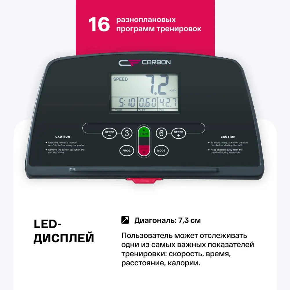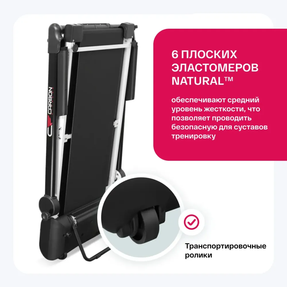 - CARBON FITNESS T200 SLIM – отличное решение для любителей заниматься бегом в домашних условиях. Беговая дорожка имеет уникальную систему складывания. В сложенном виде толщина тренажера составляет всего 15 см. Это позволит хранить дорожку под кроватью или на балконе. На тренажере расположены специальные опоры с рельефным покрытием и подставка, которые обеспечивают его устойчивость. За перемещение беговой дорожки отвечают 2 транспортировочных ролика. Несмотря на компактные размеры, особое внимание уделено амортизации. 6 плоских эластомеров Natural™ обеспечивают средний уровень жесткости, что позволяет проводить комфортную, безопасную для суставов тренировку. Работоспособность тренажера обеспечивает двигатель американской компании Leeson мощностью 1,25 л.с. В режиме пиковой мощности двигатель достигает 2.5 л.с. Такие показания обеспечивают скорость до 8 км/ч и выдерживают 90 кг веса. Беговое полотно размером 106*38 см подходит для занятий пользователям ростом до 190 см. Дорожка оснащена информативным черно-белым LED-дисплеем диагональю 2,9 дюйма (7,3 см). Пользователь может отслеживать одни из самых важных показателей тренировки: скорость, время, расстояние, калории. На выбор представлено 12 разноплановых встроенных программ, в которых используются различные виды тренировок (быстрая ходьба, легкий бег, бег трусцой, фартлек, аэробный бег, сжигание жира, интервальный бег, снижение веса, бег на выносливость, подготовка к марафону, развитие скорости, темповая тренировка). В ручном режиме можно настроить тренировку в соответствии с уровнем спортивной подготовки. Сделать упор на конкретный показатель можно при помощи режима целевых тренировок (время, дистанция, калории). Приятной опцией является подставка под телефон или планшет. Консоль имеет функцию регулирования положения, что позволит найти каждому пользователю свой угол наклона для гаджетов.