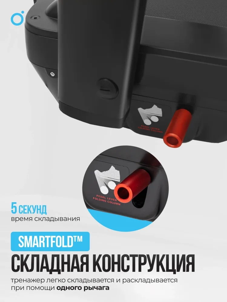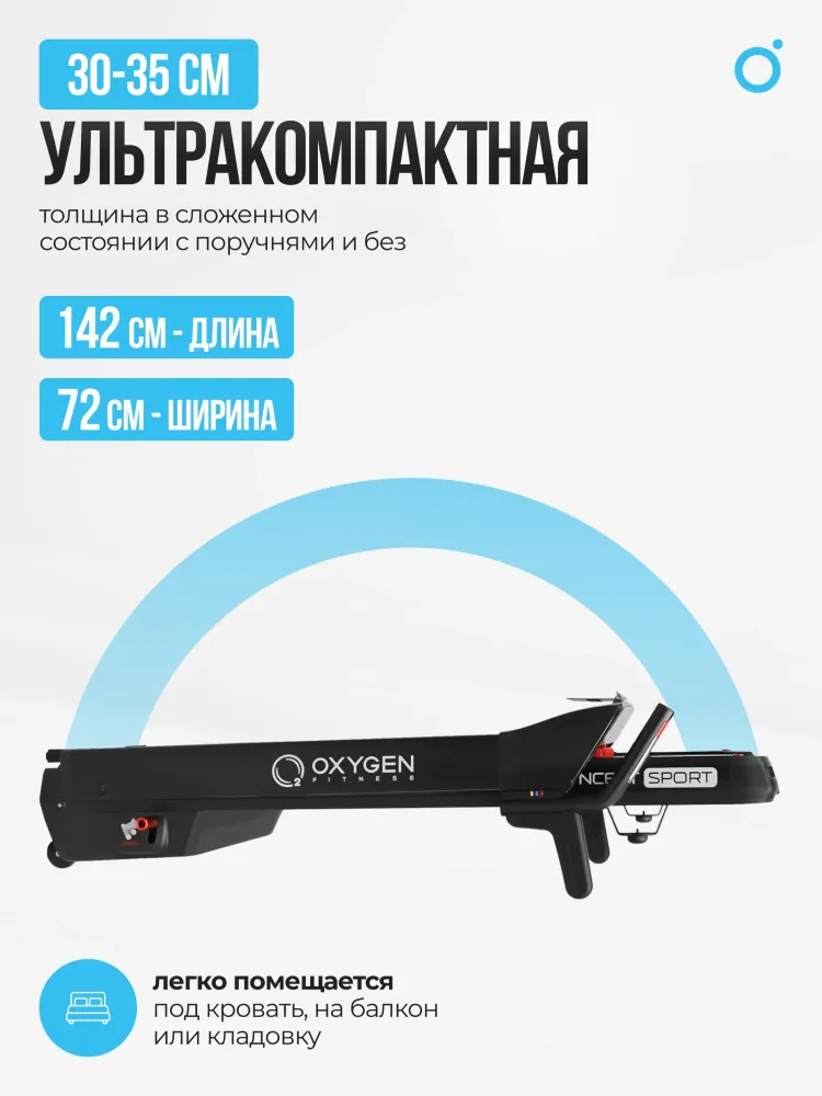 - Серия M-Concept - это уникальные тонкие беговые дорожки от OXYGEN FITNESS™. Толщина тренажера в сложенном виде составляет всего 35 см. (или 30 см. при условии снятия небольших поручней). Дорожка легко помещается под кровать, в кладовку или любое другое небольшое место - хранить ее можно и в горизонтальном, и в вертикальном состоянии. Безусловным преимуществом серии является инновационная система перемещения smartMOVE™ - за счет 4 разнонаправленных роликов тренажер можно перемещать в двух проекциях (вперед-назад и вправо-влево) - это очень удобно и, главное, легко в условиях небольших площадей городских квартир. Отдельно стоит выделить другую крайне полезную технологию smartFOLD™ - тренажер складывается и раскладывается простым способом при помощи одного рычага, на весь процесс уйдет не более 5 секунд. Сама дорожка поставляется в уже собранном виде и никакой инструментальной сборки не требует. Ее просто нужно достать из коробки и подключить к розетке. Теперь стоит перейти к главным преимуществам серии M-Concept. Здесь для начала стоит сказать, что практически все ультракомпактные беговые дорожки страдают ограниченным функционалом. Зачастую это вообще чистый маркетинговый продукт, эксплуатирующий желание потребителя заниматься фитнесом в условиях небольшой городской квартиры. Полноценная беговая дорожка по факту "съедает" до 4-ех квадратных метров площади (многие пользователи не складывают дорожку, плюс необходимая зона безопасности вокруг). Соответственно, ради ультракомпактности жертвуется многим - по факту имеем слабые неустойчивые рамы, откровенно маломощные двигатели, скорость до 6 или 8 км./ч., отсутствие амортизации и угла наклона. Некоторые модели не имеют поручней. Ходьба, и тем более бег на таких дорожках достаточно опасен - при небольшой потере равновесия удержаться не за что, и все в итоге может закончиться травмой. В целом, стоит очень внимательно отнестись к покупке ультракомпактной беговой дорожки, объективно оценить плюсы и минусы, понять сможете ли Вы в принципе пользоваться этим изделием. OXYGEN FITNESS™ M-Concept - это принципиально иной подход к компактным беговым дорожкам. Да, возможно, толщина здесь немного больше, чем в ультратонких аналогах. Но это настоящая, полноценная беговая дорожка. На ней можно комфортно и эффективно заниматься, на ней можно достигать реальных результатов в улучшении своей физической формы и, наконец, она безопасна. Итак, давайте посмотрим на характеристики. В M-concept Sport установлен надежный двигатель производства японской Fuji Electric, его мощность составляет 2.25 л.с. в режиме постоянной эксплуатации (или 4.05 л.с. при пиковых нагрузках). Именно мощный двигатель позволяет разогнать полотно до 14 км./ч. Важно, что размер полотна просто огромный для такого компактного тренажера - рабочая беговая поверхность составляет 130 см. в длину и 48 см. в ширину. По второму параметру дорожка вообще приближается к клубному уровню. Более того, в M-Concept Sport есть даже автоматическая регулировка угла наклона от 0 до 12% - за счет чего значительно увеличивается вариативность тренировок. Еще одна ахиллесова пята ультракомпактов - амортизация. По факту ее нет - как бы производитель не доказывал обратное. При такой тонкой раме поставить полноценную систему амортизации невозможно. В серии M-Concept, за счет большей толщины рамы, вопрос решен радикально - з