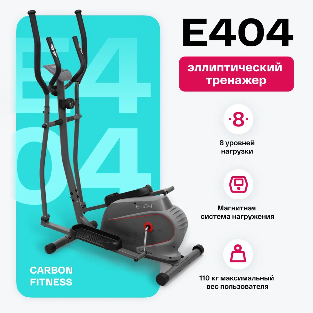 - Carbon E404 с магнитной системой нагружения относится к классу среднеразмерных эллиптических тренажеров для домашнего применения. Рамная конструкция из усиленного профиля выдерживает вес пользователя до 110 кг. Система нагружения построена на базе классического заднего привода. Магнитная система нагружения обеспечивает биомеханически правильное педалирование и корректное распределение нагрузки по всей траектории движения. Качество кручения также обеспечивается мощным сбалансированным маховиком с собственным весом 3 кг. Длина шага составляет 33 см. Расстояние между педалями (так называемый "малый Q-Фактор S.Q.F.™") составляет 21 см. Чем меньше такое значение, тем больше тренировка на тренажере приближена к естественным движениям во время бега. Тренировочный компьютер представлен LCD-дисплеем с монохромной матрицей. На экран выводятся все основные параметры тренировки - время, скорость, дистанция, расход калорий, пульс, одометр. Также есть 4 встроенные программы, направленные на целевые тренировки по времени, дистанции, расходу калорий и пульсу. Нагрузка регулируется механическим путем в 8 положениях. К числу дополнительных характеристик эллипсоида относятся такие опции как транспортировочные ролики и компенсаторы неровностей пола. Таким образом, переместить изделие из одного места в другое не составит большого труда даже для хрупкой девушки, а компенсаторы позволят отрегулировать положение ножек на неровной поверхности. Из приятного бонуса - наличие подставки под смартфон для разнообразия тренировки.