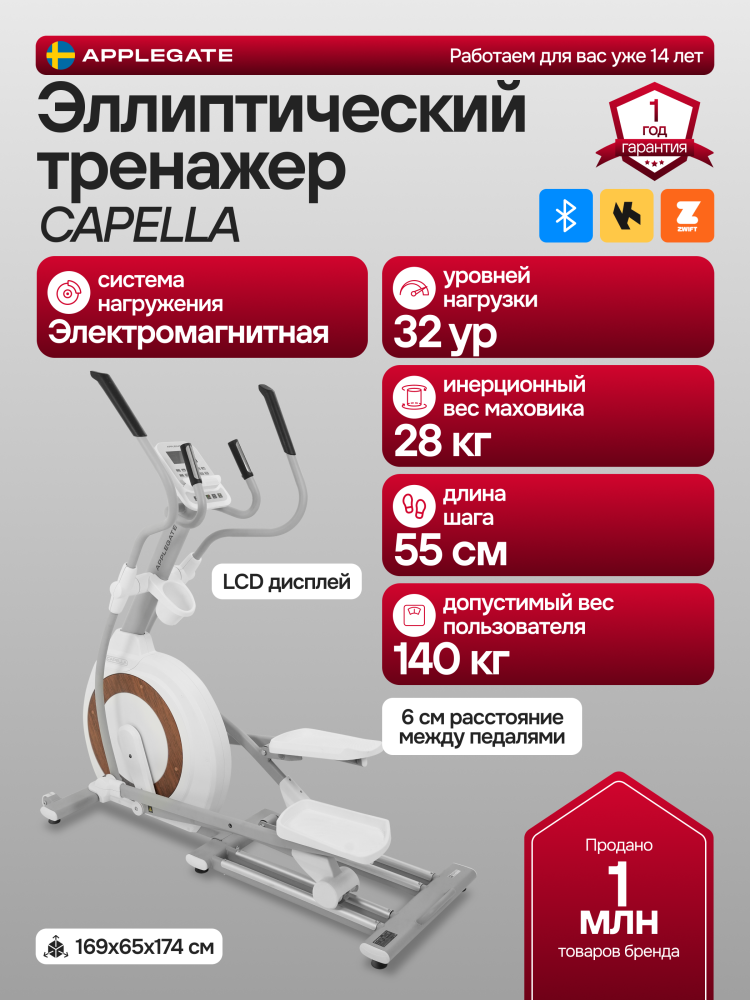 - Эллиптический тренажер APPLEGATE CAPELLA - выбор для тех, кто стремится поддерживать отличную физическую форму, не выходя из дома. С его помощью вы сможете эффективно тренироваться в комфортной обстановке, благодаря современным технологиям и продуманному дизайну. Вес тренажера составляет 72 кг, что обеспечивает стабильность и надежность во время тренировок. Тренажер оснащен электромагнитной системой нагружения с 32 уровнями нагрузки, что позволяет выбрать оптимальный режим для каждой тренировки. Инерционный вес маховика составляет 28 кг, что обеспечивает плавный и комфортный ход. Длина шага в 550 мм и расстояние между педалями в 60 мм делают занятия максимально удобными. Консоль с LCD-дисплеем отображает все необходимые параметры: время, скорость, дистанцию, калории, пульс и уровень нагрузки. Для еще большего удобства предусмотрены 23 программы тренировок, включая режимы для пульсозависимых тренировок и жироанализатор. Эллиптический тренажер APPLEGATE CAPELLA поддерживает Bluetooth-соединение для работы с мобильными фитнес-приложениями, такими как Kinomap™ и Zwift™, что позволяет вам интегрировать тренировки с интерактивными программами. Удобные двухпозиционные нескользящие рукоятки с сенсорными датчиками пульса помогут вам следить за сердечным ритмом. Также предусмотрены транспортировочные ролики и компенсаторы неровностей пола, что делает перемещение тренажера простым и удобным. Эллиптический тренажер APPLEGATE CAPELLA - это не просто тренажер, а ваш надежный помощник на пути к здоровью и отличной физической форме! Ключевые преимущества APPLEGATE CAPELLA: • эффективные тренировки: 32 уровня нагрузки и 23 программы для разнообразия тренировок; • интерактивность: подключение к мобильным приложениям для увлекательных и динамичных тренировок; • подходит для всех: максимальный вес пользователя до 140 кг, что позволяет использовать тренажер широкой аудитории; • подставка для планшета/смартфона и держатель для бутылки для максимального удобства во время тренировок.