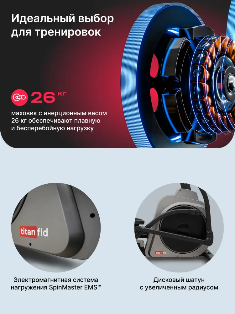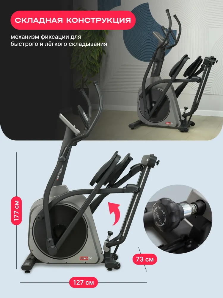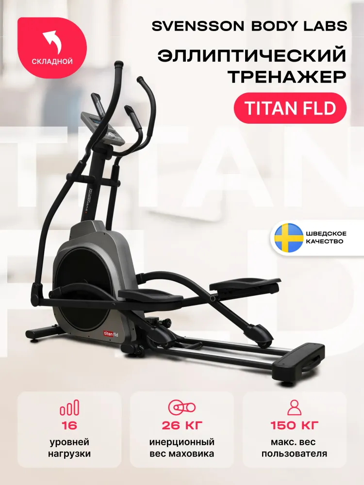 - Эллиптический тренажер SVENSSON BODY LABS TITAN FLD — это идеальное решение для домашних тренировок, предназначенное для людей, стремящихся поддерживать свою физическую форму. С его помощью вы сможете эффективно тренировать все группы мышц, не перегружая суставы. Высокопрочная рама с антикоррозийной обработкой и двухслойной покраской гарантирует долговечность тренажера. TITAN FLD имеет электромагнитную систему нагружения SpinMaster EMS™, предлагающую 16 уровней нагрузки, что позволяет адаптировать тренировки под любые уровни подготовки. Инерционный вес маховика составляет 26 кг, что обеспечивает плавность и комфорт во время занятий. Длина шага в 500 мм и расстояние между педалями всего 50 мм способствуют естественному движению, а дисковый шатун с увеличенным радиусом делает тренировки более эффективными. Компактность и мобильность – еще один плюс данной модели, складная конструкция и транспортировочные ролики позволяют легко хранить тренажер и перемещать его по дому. Консоль тренажера оснащена LCD-дисплеем с голубой индикацией, на котором отображаются все необходимые параметры: время, скорость, дистанция, калории, пульс, нагрузка и обороты в минуту. Тренажер предлагает 24 программы, включая быстрый старт, ручной режим и пульсозависимые программы. Возможность подключения к кардиодатчикам через Bluetooth позволяет отслеживать сердечный ритм во время тренировки, а поддержка Bluetooth для работы с мобильными фитнес-приложениями, такими как Kinomap™ и Zwift™, позволяет разнообразить тренировки и делать их более увлекательными. Удобные двухпозиционные нескользящие рукоятки с сенсорными датчиками пульса обеспечивают комфорт и безопасность во время занятий. Эллиптический тренажер SVENSSON BODY LABS TITAN FLD — это надежный и функциональный инструмент для достижения ваших фитнес-целей в комфортной домашней обстановке. Ключевые преимущества SVENSSON BODY LABS TITAN FLD: • компактность и мобильность: складная конструкция и транспортировочные ролики позволяют легко хранить тренажер и перемещать его по дому; • интеграционные технологии: поддержка Bluetooth для работы с мобильными фитнес-приложениями, такими как Kinomap™ и Zwift™, позволяет разнообразить тренировки и делать их более увлекательными; • комфорт и удобство: антискользящие и увеличенного размера педали, сенсорные датчики на поручнях и возможность подключения к кардиодатчикам делают тренировки безопасными и эффективными; • прочность и надежность: высокопрочная рама с антикоррозийной обработкой и двухслойной покраской гарантирует долговечность тренажера.
