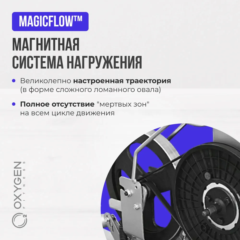 - OXYGEN FITNESS™ Tornado II EL относится к классу среднегабаритных эллипсоидов с магнитной системой нагружения. Равно как и для всех других эллиптических тренажеров OXYGEN FITNESS™, он построен на базе приводной системы magicFLOW™ с действительно продуманной и эффективной биомеханикой от одного из мировых лидеров в инжиниринге эллиптических рамных конструкций - компании Sportech E.L. Великолепно настроенная траектория (в форме сложного ломанного овала) совпадает с геометрией эллипсов профессионального уровня. Высокий уровень биомеханических настроек подтверждает практически полное отсутствие "мертвых зон" на всем цикле движения, в том числе на максимальных нагрузках. Кроме того, как и полагается приличным эллипсам, основной акцент делается на мышцы бедр и ягодиц, в то время как подавляющее большинство других эллипсов такого уровня грешат смещением нагрузки вперед - что не только снижает общую эффективность тренировки, но и излишне перегружает коленные суставы. Помимо самой рамы, Tornado II обладет внушительным сбалансированным маховиком с инерционным весом 15.4 кг. Длина шага имеет достаточную для своего шага длину и составляет 34 см. По своим остальным характеристикам Tornado II EL ориентирован на широкую массу спортсменов начального и среднего уровней. Датчики пульса на поручнях, 8 положений ступенчатой регулировки нагружения, антискользящие настраиваемые трехпозиционные педали. Черно-белый LCD дисплей с сенсорными клавишами выводит на экран все основные параметры тренировки: скорость, время, дистанцию, количество оборотов педалей в минуту, потраченные калории и пульс. По завершении тренировки функция Recovery оценит способность сердечно-сосудистой системы к восстановлению. Максимально вес пользователя составляет 120 кг.