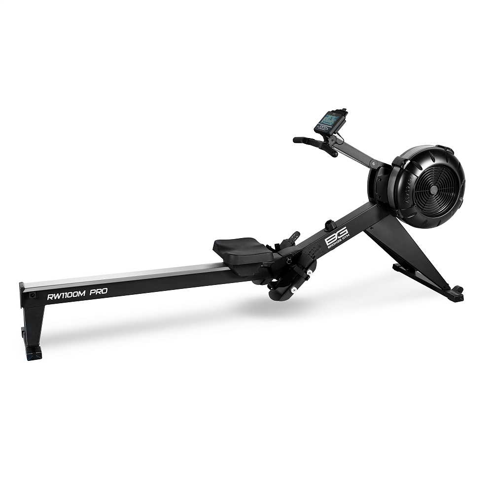 - BRONZE GYM RW1100M PRO TURBO – это профессиональный гребной тренажер с аэродинамической системой нагружения. Благодаря системе воздушного сопротивления RW1100M делает тренировку максимально эффективной для любого уровня спортивной подготовки пользователя. Чем выше скорость, тем выше нагрузка – это основной принцип работы оборудования. Таким образом, увеличение сопротивления зависит исключительно от интенсивности тренировки пользователя. За счет ритмичных последовательных движений задействуются различные группы мышц нижней и верхней части тела, формируется правильная осанка, получают нагрузку органы дыхательной системы. RW1100M имеет в своем арсенале и множество других интересных параметров. Высокопрочная алюминиевая монорельса обеспечивает большую амплитуду движения - 110 см, что позволит комфортно заниматься пользователям ростом выше 200 см. Рельса, выполненная из высококачественного алюминия обеспечивает отличный уровень скольжения. Эргономичное сиденье-слайдер профессионального класса с гелевыми вставками. Есть упорные платформы для ног с регулируемыми ремешками для фиксации, которые дают максимальный комфорт при занятии. Благодаря компенсаторам неровностей пола можно легко выровнять положение модели на неровной поверхности. Проблема с маленькой квадратурой помещений, актуальной для многих корпоративных залов или небольших фитнес-клубов, теперь решена – оборудование можно хранить в вертикальном положении. Необходимо просто вытащить специальный адаптер и поставить тренажер в соответствующее положение. Переместить тренажер также не составляет большого труда - для этого предусмотрены транспортировочные ролики. Максимальный вес пользователя составляет 155 кг. Тренировочный компьютер оборудован LCD-дисплеем с подсветкой. На экране отображаются следующие данные: время тренировки, пройденная дистанция, расход калорий, пульс, количество гребков в минуту, мощность в Вт, средняя мощность в Вт, циклы тренировки. Все надписи на консоли русифицированы. В число самих программ входят 8 режимов, направленных на решение самого широкого спектра задач – от развития силы до снижения веса. Помимо предустановленных программ, можно воспользоваться самостоятельно регулируемым ручным режимом. Есть такие программы, как обратный отсчет времени, обратный отсчет дистанции, обратный отсчет расхода калорий, игровая программа, интервальная программа 20/10, интервальная программа 10/20, интервальная программа 10/10. Для точного определения пульса и просто комфортной тренировки в компьютер встроен беспроводной приемник (нагрудный ремень-передатчик приобретается дополнительно). К числу дополнительных преимуществ модели относится то, что мобильное устройство можно расположить на подставке консоли.