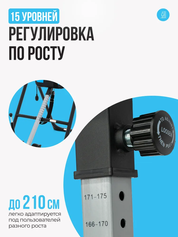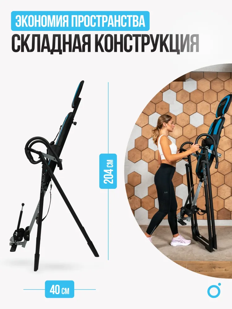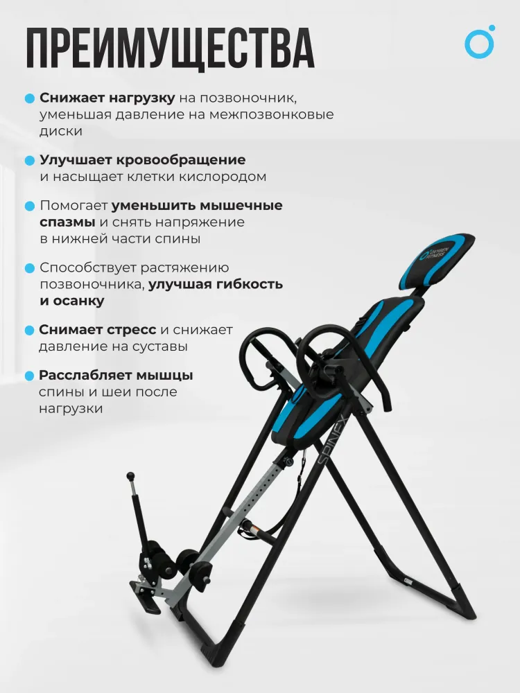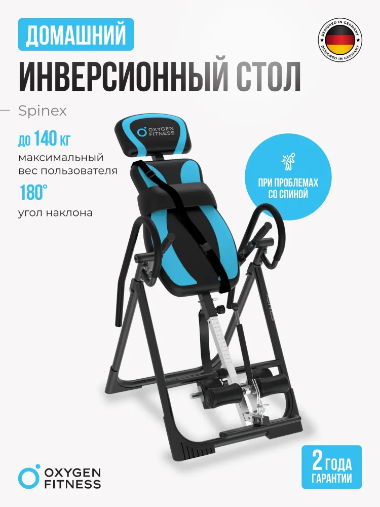 - Инверсионный стол OXYGEN FITNESS SPINEX — это мощное средство для восстановления здоровья позвоночника и улучшения общего состояния организма. Благодаря инверсии этот стол позволяет снять напряжение с позвоночных дисков, улучшить кровообращение и уменьшить болевые ощущения в спине. Его использование способствует естественной декомпрессии позвоночника, что помогает уменьшить давление на межпозвоночные диски и облегчить симптомы хронических болей в спине. Модель SPINEX предлагает исключительную настройку для каждого пользователя. Благодаря 15 уровням регулировки по росту и 5 уровням регулировки подголовника она идеально подходит для людей ростом до 210 см. Максимальный угол наклона в 180 градусов позволяет плавно и безопасно полностью переворачиваться, что обеспечивает глубокое расслабление мышц и улучшает циркуляцию крови. Это особенно полезно для восстановления после физических нагрузок и улучшения подвижности позвоночника. Стол также оснащён надувной подушкой для поясницы с удобной грушей для сдувания и надувания, что позволяет индивидуально настроить поддержку поясничного отдела для максимального комфорта. Высококачественные материалы и продуманная эргономика делают SPINEX не только эффективным, но и комфортным в использовании. Толстая подушка спинки (4 см) и подголовник (3,5 см) обеспечивают максимальный комфорт даже при длительных сеансах инверсии. Размеры спинки 80*48 см и подголовника 40*30 см создают оптимальную поддержку для пользователя, а 8 уровней фиксации ног с системой GravityLock™ обеспечивают безопасность во время использования, исключая возможность травм. Регулировочный ремень с карабином обеспечивает точное и безопасное закрепление стола в нужном положении, позволяя пользователю контролировать угол наклона. Это важная функция для тех, кто только начинает использовать инверсионную терапию или имеет особые требования к углу наклона для достижения максимального эффекта. Безопасность и стабильность конструкции делают стол SPINEX идеальным решением как для домашних пользователей, так и для реабилитационных центров. Инверсионный стол SPINEX от OXYGEN FITNESS — это эффективный инструмент для поддержания здоровья позвоночника, улучшения гибкости и снижения стресса. Компактные размеры в сложенном виде (204*70*40 см) делают его удобным для хранения, а в рабочем состоянии он занимает минимум места, сохраняя при этом функциональность и удобство. Инвестиции в ваше здоровье и комфорт станут залогом долгосрочного улучшения качества жизни. Ключевые преимущества OXYGEN FITNESS SPINEX: • ремень безопасности, фиксирующий тело на спинке тренажера; • надежные, регулируемые фиксаторы для ног с системой GravityLock™; • надувающаяся подушечка RelaxPad, помогающая расслабить поясничный отдел; • стоппер для контроля угла переворота; • максимальный рост пользователя до 210 см.
