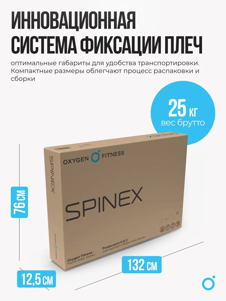 МаркаOxygen Fitness АртикулSPINEX Цвет основнойчерный Максимальный вес пользователя, кг140 Размер в упаковке (ДхШхВ), см132х76x12.5 Размер в рабочем состоянии (ДхШхВ), см203х70x130 Вес нетто, кг22 Вес брутто, кг25 ПроизводительFitathlon Group (подразделение в Германии) Страна изготовленияКНР Гарантийный срок24 мес. Показать больше -