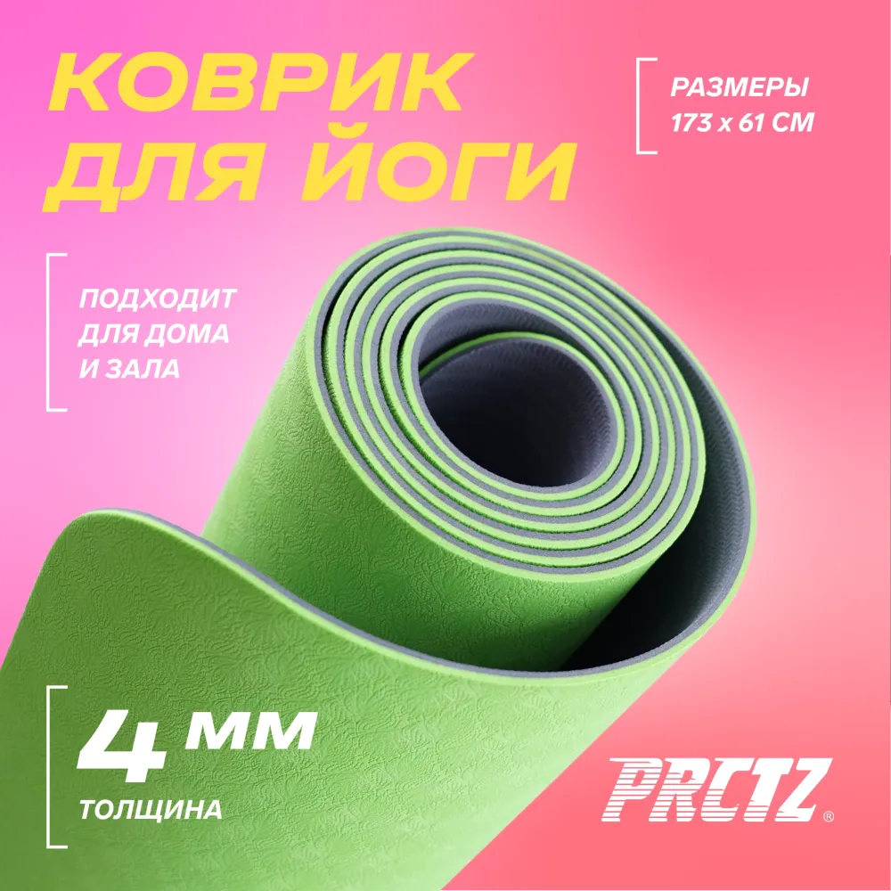 - Тренируйтесь с удовольствием с PRCTZ. Двухслойный нескользящий коврик PRCTZ. Идеально сбалансированная мягкость защитит ваше тело, локти и колени при выполнении упражнений. На коврике PRCTZ приятно даже просто полежать 5-10 минут в середине дня — это помогает и для вашей осанки. Подходит под любые типы поверхности, ламинат, ковролин, газон. Так же можно заниматься в носках и кроссовках. Коврик выполнен из экологичного термопластичного эластомера — это износостойкий, плотный и упругий материал, который долго сохраняет форму. Размеры: 173х61х0.4 см. Вес коврика 730 гр. Оптимальная толщина, мягкость и упругость. Очень комфортные ощущения во время йоги и фитнеса. Насыщенная расцветка. Упаковка. Прозрачный полиэтилен. Уход за ковриком: Протрите коврик влажной тряпкой и дайте ему высохнуть. Коврик можно споласкивать в душе теплой водой, используя нейтральное моющее средство.