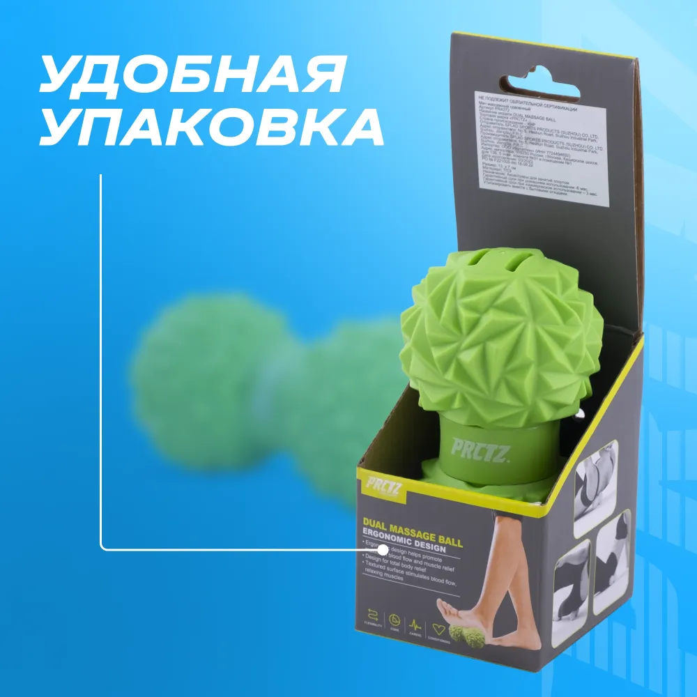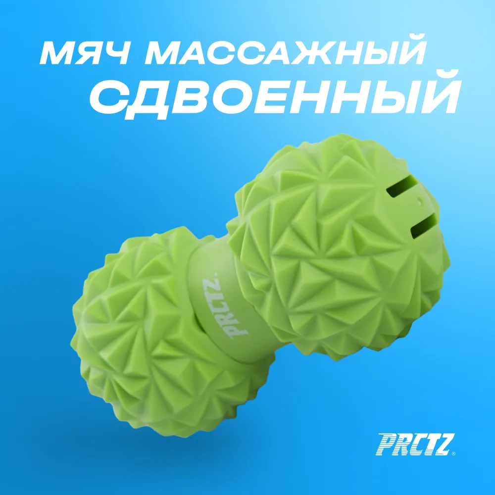 - Мяч массажный сдвоенный PRCTZ DUAL MASSAGE BALL - идеальное решение для любителей активного образа жизни и тех, кто часто сталкивается с нарушениями позвоночника и мышц шеи. Рельефная структура поверхности с шипами воздействует на нервные окончания, улучшает приток крови и активизирует кровообращение. Таким образом, мячик ускоряет кровоток, уменьшает застои и повышает тонус мышц, а также открывает возможности выполнения разных упражнений для улучшения состояния всего организма - С его помощью вы сможете снять напряжение и усталость после интенсивной тренировки или напряженного рабочего дня. Благодаря двум различным поверхностям мяча, вы можете выбрать интенсивность массажа в зависимости от своих предпочтений. - С его компактными размерами (диаметр 7см, длина 13см) и легким весом (280г), вы можете брать его с собой в сумку или использовать дома во время курса массажа. - Форма мяча арахис позволяет добиться более точного массажа в нужных областях шеи. - Не упускайте возможность насладиться прекрасным массажем в любое время и в любом месте с мячом массажным сдвоенным PRCTZ DUAL MASSAGE BALL.