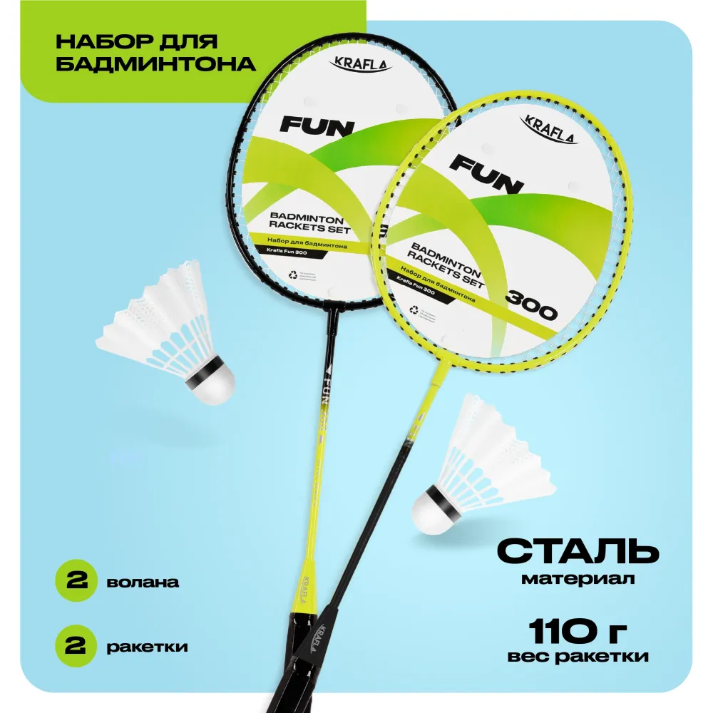 - Легкий и компактный набор для бадминтона серии FUN 300, который состоит из двух ракеток и двух воланов, станет прекрасным выбором для игр на свежем воздухе.