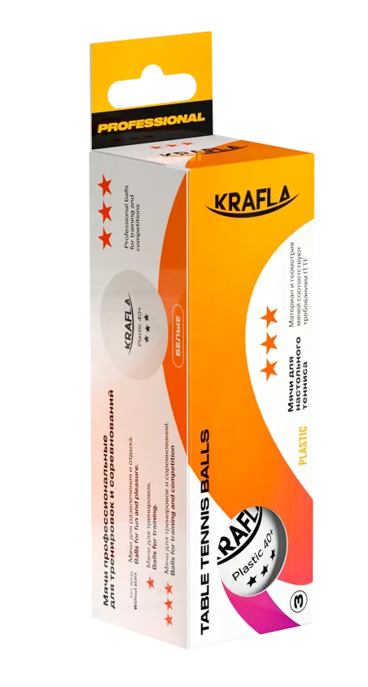 - Набор профессиональных мячей для настольного тенниса от бренда KRAFLA. Мячи предназначены для тренировок профессионалов или для проведения соревнований. Изделие выполнено из качественного пластика (ABS). Диаметр составляет 40 мм, количество звезд - 3.