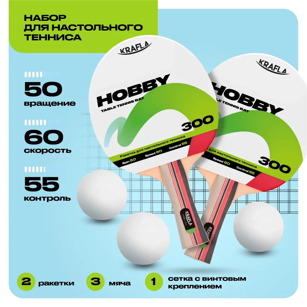 - Набор для настольного тенниса KRAFLA S-H300 (2 ракетки + 3 мяча) любительского уровня - хороший выбор для начинающего пользователя. Высокий показатель контроля и повышенные показатели скорости и вращения помогают игроку быстро прогрессировать. Основание выполнено из 7-слойной фанеры, толщиной 6,5 мм. Толщина губки составляет 1,5 мм, а рукоятка вогнутой формы подойдет любому пользователю. Вес ракетки 145 г.