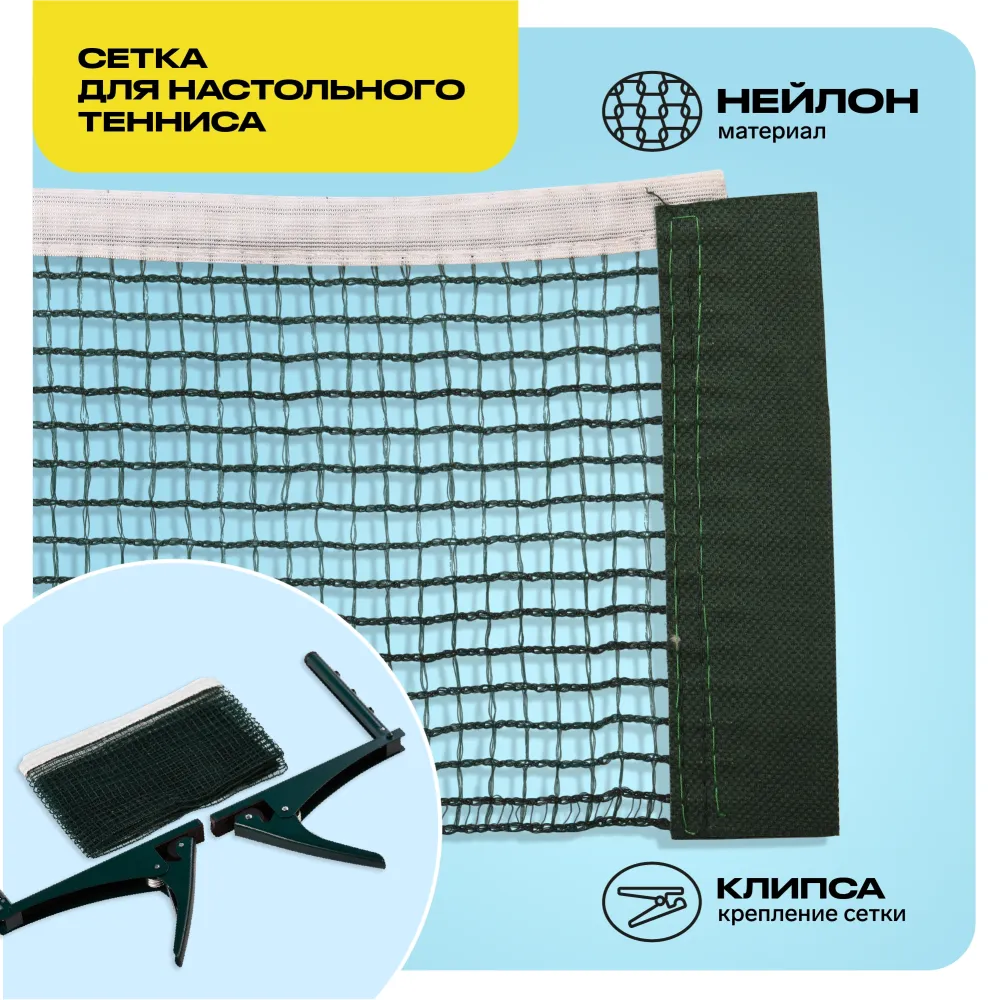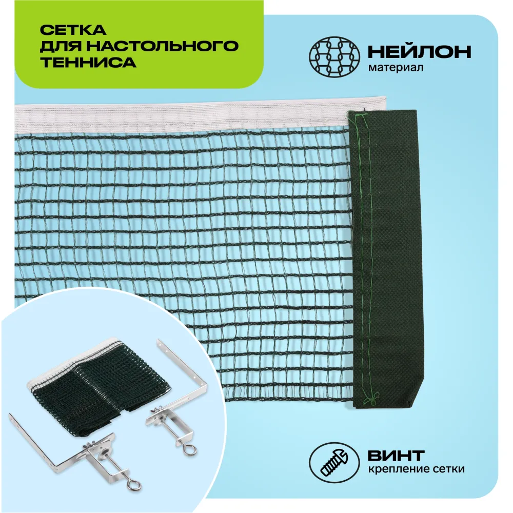 - Упругая нейлоновая сетка для любительских игр в настольный теннис с винтовым креплением, выполненная из качественного и прочного материала, обладает высокими износостойкими свойствами. Сетка легко и просто крепится к столу. Натяжение регулируется, металлические стойки идут в комплекте.