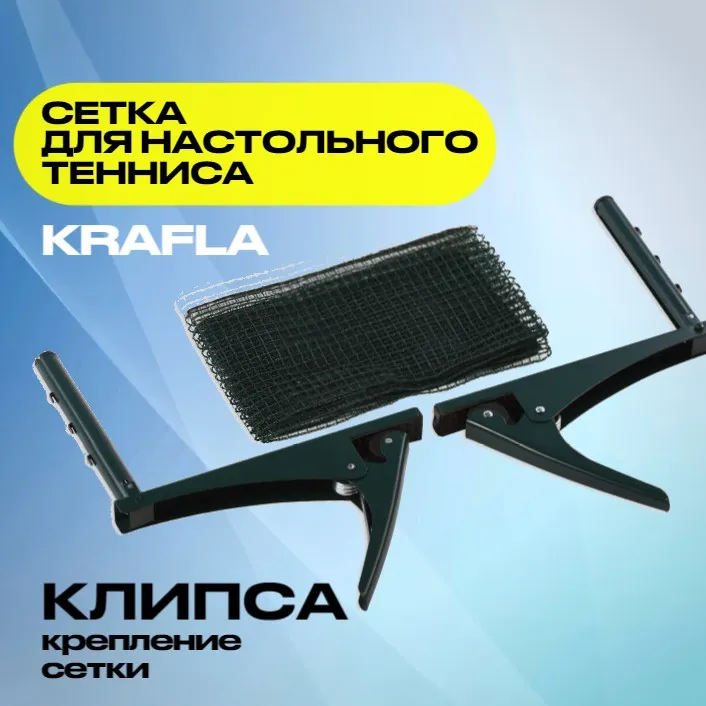 - Сетка для настольного тенниса KRAFLA N-T1000 оснащена клипсой для быстрой установки, которая занимает не больше минуты. Выполнена из качественного и прочного материала, обладает высокими износостойкими свойствами. Натяжение регулируется, металлические стойки идут в комплекте.