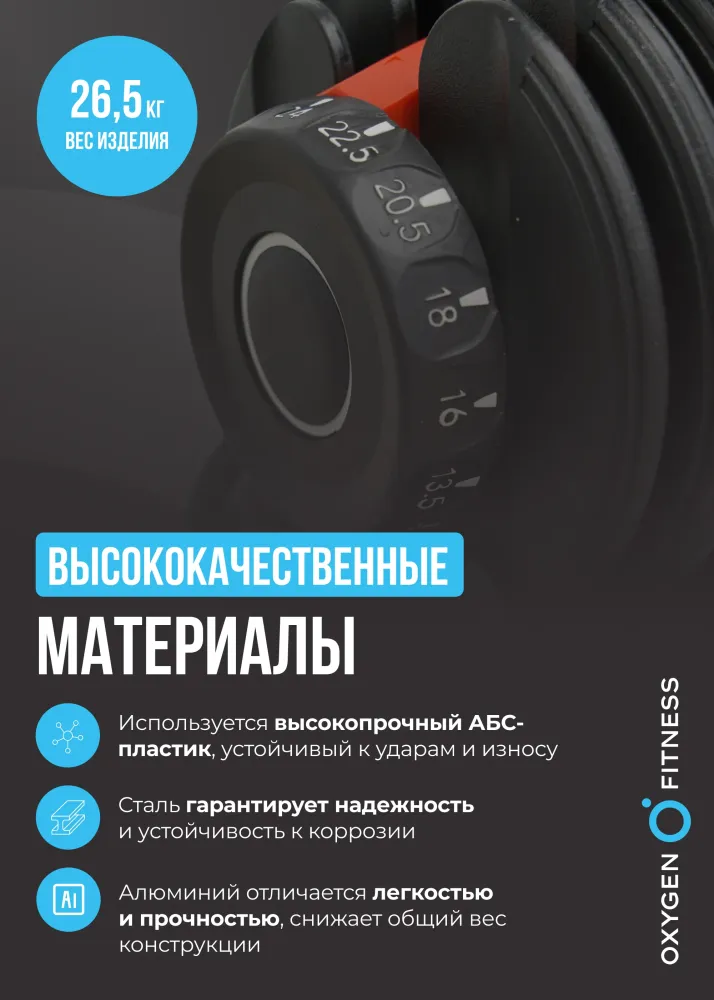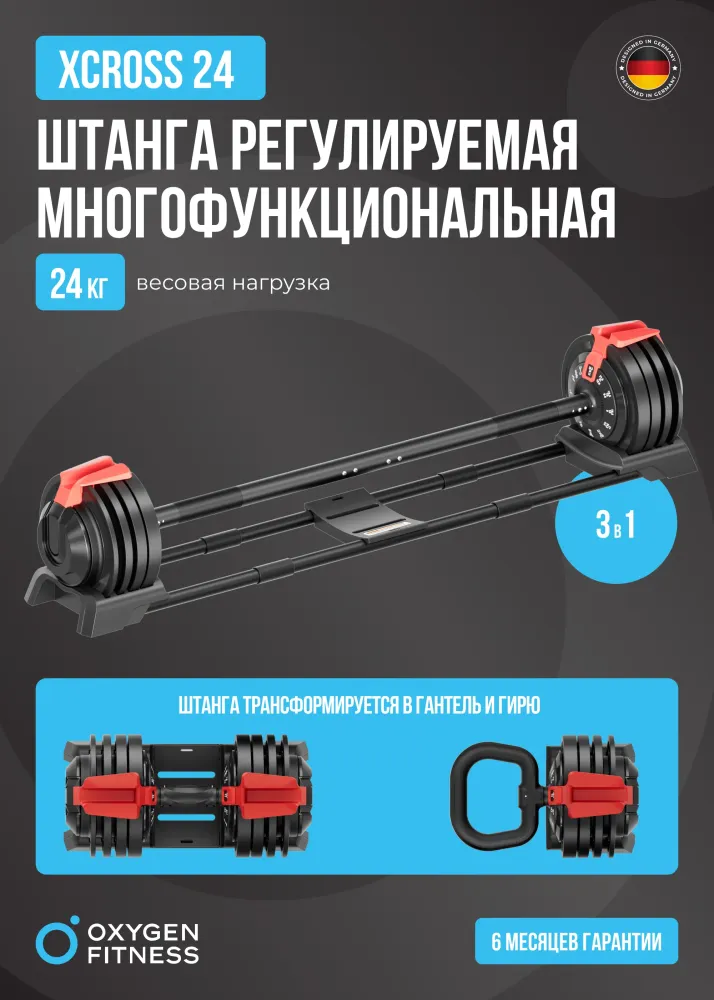 - Многофункциональная регулируемая штанга OXYGEN FITNESS XCROSS 3 в 1- тройное сочетание силы, эффективности и универсальности в одном комплекте! Этот набор станет незаменимым помощником в достижении фитнес целей и превратит ваши тренировки в настоящее удовольствие, ведь это идеальное сочетание спортивного инвентаря для дома, который поможет развить силу, выносливость и создать идеальный рельеф! Разборная конструкция штанги легко трансформируется в гирю и гантель. Сборная штанга с общим весом конструкции 24 кг является неотъемлемой частью тренировок с отягощением. Предусмотрено 12 весовых вариаций для штанги: 4/6/8/10/11,5/14/15/17/18,5/20/22/24 кг. С ее помощью вы сможете выполнять разнообразные упражнения, такие как приседания, жимы, становую тягу и многое другое. Предусмотрено 12 весовых вариаций для гантели: 3/6/8/9/11/13/15/17/18/19/21/24 кг. Гантель позволит изолированно проработать конкретные группы мышц. Вы сможете работать над развитием бицепса, трицепса, грудных мышц и мышц спины. Предусмотрено 12 весовых вариаций для гири: 2/3/4/5/6/7/8/8,5/9/10/11/12 кг. Гиря – это отличный способ развить силу и выносливость всего тела. С их помощью вы сможете выполнять разнообразные упражнения, такие как махи, подъемы и выпады. Универсальный комплект, из которого можно собрать штангу, гантель или гирю позволит максимально разнообразить домашние тренировки при минимальной затрате места. Удобные для хвата ручки со специальным покрытием предотвратят скольжение и обеспечат надежный захват. Чтобы не повредить напольное покрытие в наборе предусмотрена подставка для размещения гантели, гири и штанги. Размеры штанги с подставкой 111 х 21 х 22 см; гантели с подставкой 41 х 21 х 22 см; гири с рукояткой 31 х 21 х 22 см.