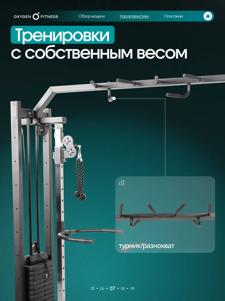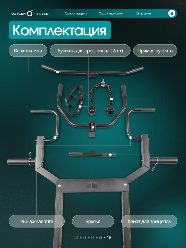 - OXYGEN FITNESS VESTON - это мощный полукоммерческий кроссовер с полным функционалом для развития мышц верхней части тела, корпуса и рук. Тренажёр оснащён двумя независимыми грузоблоками и множеством дополнительных станций, что делает его универсальным решением для небольших залов, студий, фитнес-клубов и продвинутых домашних тренировочных зон. Конструкция рассчитана на интенсивное использование и высокие нагрузки: максимальный вес пользователя - 220 кг, максимальная нагрузка - 140 кг. Основа тренажёра — жёсткая рама прямоугольного профиля 70×50 мм с толщиной стенки 1,5 мм, обеспечивающая идеальную устойчивость и долговечность. В комплексе используются два грузоблока по 70 кг каждый (12+12 плит), выполненные из прочной композитной плиты. Вес одной плиты — 5,7 кг. Передача нагрузки осуществляется через стальные тросы диаметром 6 мм — надёжные, износостойкие и рассчитанные на долгий срок службы. Габариты в рабочем положении: • 295 × 130 × 230 см. Вес нетто — 244 кг. VESTON предлагает широкий диапазон тренировок за счёт продуманной конструкции и прикладных аксессуаров: • Кроссовер с регулируемыми рычагами (8 уровней по высоте) — упражнения на грудные, плечи, спину, руки и корпус. • Многофункциональный турник — подтягивания разными хватами, тренировка спины и мышц кора. • Брусья с регулировкой по высоте (15 уровней) — проработка трицепса, грудных и стабилизаторов. • Многофункциональная рычажная тяга — вариативная работа на широчайшие и мышцы спины. • Канат для трицепса — точечная изоляция рук. Дополнительно предусмотрены: • 2 пружинных замка, • накопители под диски Ø50 мм для удобной организации пространства.