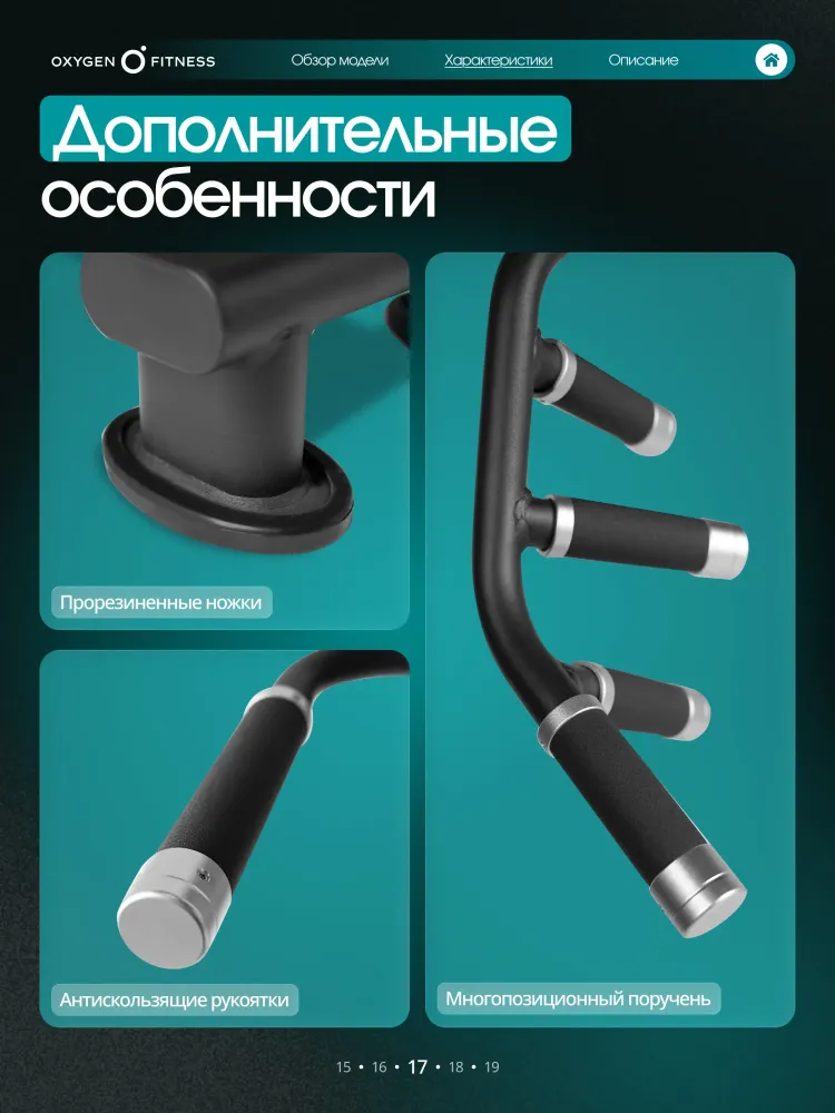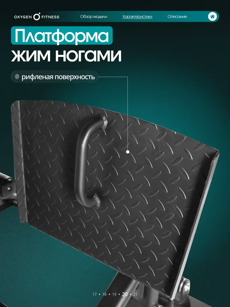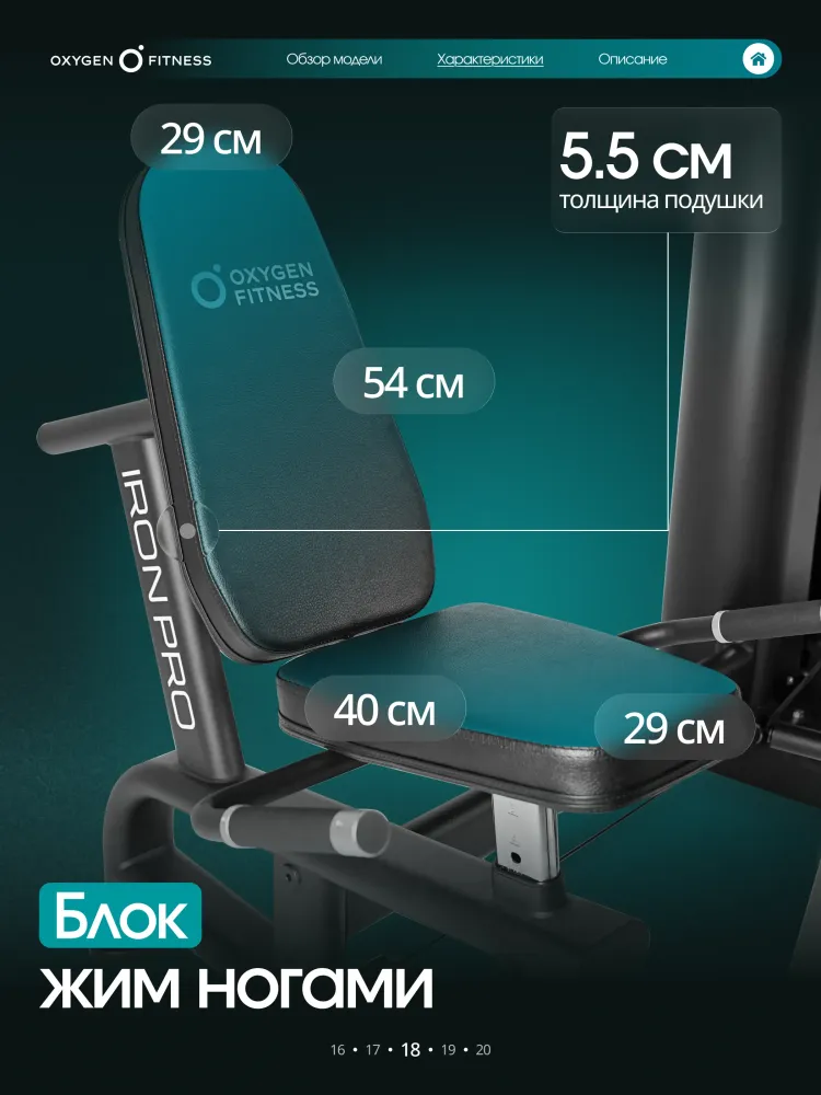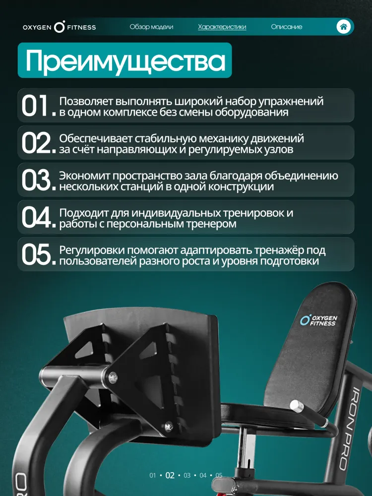 - OXYGEN FITNESS IRON PRO — мощная многофункциональная силовая станция полукоммерческого уровня, разработанная для интенсивных тренировок и максимальной эффективности. Модель объединяет широкий спектр силовых упражнений и позволяет полноценно прорабатывать основные группы мышц: грудь, спину, плечи, руки и ноги. Благодаря расширенному функционалу и высокой надежности станция отлично подходит как для домашнего использования, так и для фитнес-студий, корпоративных залов и небольших спортивных клубов. Усиленная конструкция для интенсивных тренировок Основу тренажера составляет прочная стальная рама из профиля 50 × 70 мм с толщиной стенки 2 мм, обеспечивающая высокую жесткость и устойчивость при любых нагрузках. Значительный вес конструкции 327 кг гарантирует стабильность тренажера даже при выполнении динамичных силовых упражнений. Мультистанция рассчитана на пользователей весом до 150 кг, что делает ее надежным оборудованием для регулярных и интенсивных тренировок. Эффективная грузоблочная система Система нагрузки реализована через грузоблочный стек 90 кг, состоящий из 17 композитных плит по 5 кг. Это позволяет точно подбирать уровень нагрузки и постепенно увеличивать рабочий вес по мере роста силы и выносливости. Передача усилия осуществляется через прочный стальной трос диаметром 5 мм, обеспечивающий плавный ход механизмов, точную передачу нагрузки и долговечность конструкции. Расширенный функционал тренировок Модель IRON PRO отличается расширенными возможностями тренировок, включая модуль жима ногами, который значительно увеличивает вариативность упражнений и позволяет эффективно прорабатывать мышцы ног и ягодиц. Тренажер позволяет выполнять множество упражнений на: грудные мышцы, спину, плечевой пояс, руки, мышцы ног. Таким образом, один комплекс способен заменить сразу несколько силовых тренажеров. Эргономика и комфорт Особое внимание уделено удобству пользователя. Сиденье и спинка имеют эргономичную форму и выполнены с использованием PU-поролона высокой плотности, обеспечивающего комфорт и правильную поддержку тела. Обивка из износостойкой экокожи устойчива к интенсивной эксплуатации и легко очищается. Размеры подушек: спинка — 54 × 29 × 5,5 см сиденье — 40 × 29 × 5,5 см валики — диаметр 13 см Точная настройка под пользователя Для удобства пользователей разного роста и уровня подготовки предусмотрена система регулировок: рукоятки — 7 уровней спинка — 5 уровней сиденье — 5 уровней по высоте блок жима от груди — 10 уровней спинка блока жима ногами — 5 уровней Такая гибкость настройки обеспечивает правильную биомеханику движений и повышает эффективность каждой тренировки. Оптимальные размеры Несмотря на расширенный функционал, тренажер сохраняет удобные габариты для размещения в фитнес-пространстве: длина — 210 см ширина — 202 см высота — 220 см OXYGEN FITNESS IRON PRO — это универсальная силовая станция с расширенным функционалом и профессиональной надежностью. Она объединяет высокую прочность конструкции, плавную работу механизмов и комфортную эргономику, позволяя проводить полноценные силовые тренировки на одном тренажере.