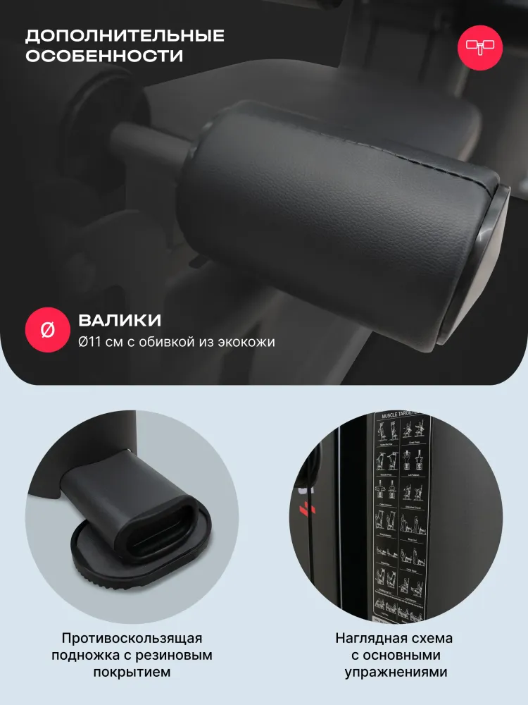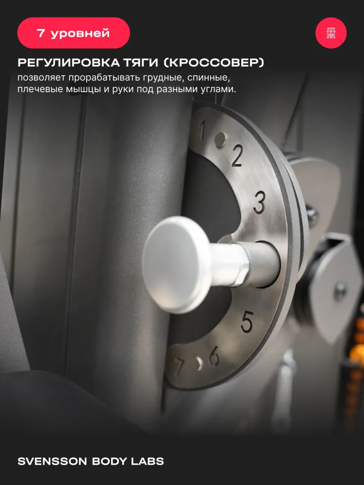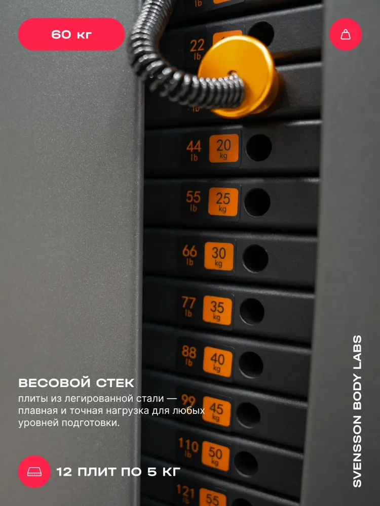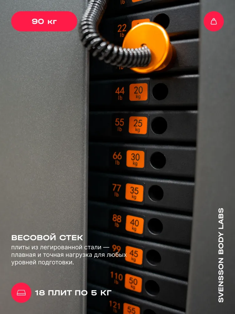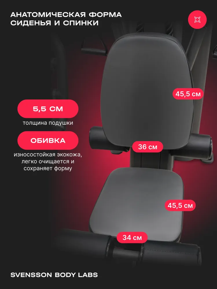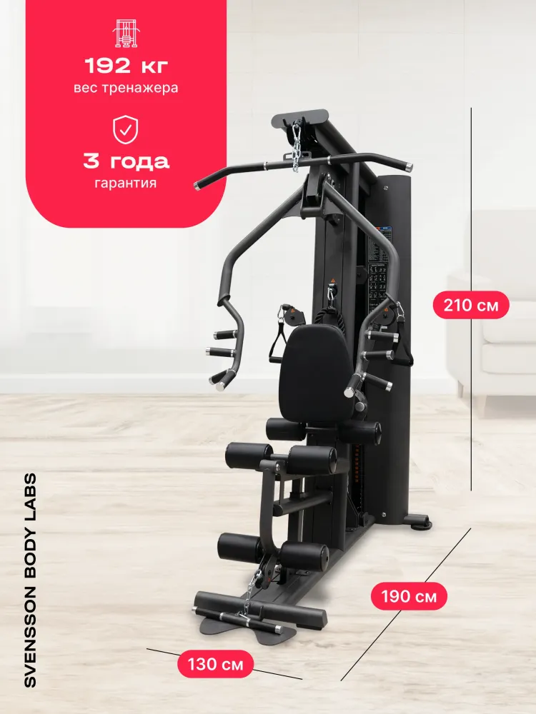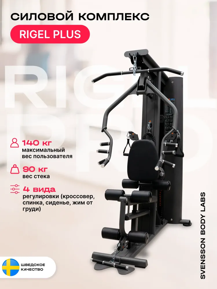 - SVENSSON BODY LABS RIGEL PRO — это полукоммерческий силовой комплекс, предназначенный для эффективных тренировок всех групп мышц. Благодаря продуманной конструкции и широкому функционалу, он идеально подходит как для фитнес-центров, так и для тех, кто ценит качество и комфорт в домашних тренировках. Высокое качество материалов и продуманный дизайн обеспечивают долговечность и надежность оборудования. Комплекс оснащен грузоблочным стеком весом 90 кг, состоящим из 18 стальных плит по 5 кг каждая, что позволяет регулировать нагрузку до 90 кг. Регулировка положения сиденья, спинки и тяговых элементов осуществляется по нескольким уровням (до 7 для тяги, 5 для спинки, 4 для сиденья по высоте), обеспечивая комфорт и индивидуальную настройку под каждого пользователя. Эргономичное сиденье с наполнителем из PU-поролона и обивкой из искусственной кожи гарантирует комфорт во время тренировки. Общий размер комплекса в рабочем состоянии составляет 190 см в длину, 130 см в ширину и 210 см в высоту. Максимальная допустимая нагрузка для пользователя — 140 кг, что делает комплекс универсальным для большинства спортсменов. Подушки и валики выполнены из искусственной кожи и имеют размеры: спинка — 45.5х36х5.5 см, сиденье — 45.5х34х5.5 см, диаметр валика - 11 см, что обеспечивает комфорт и поддержку при выполнении различных упражнений. SVENSSON BODY LABS RIGEL PRO — идеальный выбор для эффективных и безопасных тренировок в условиях полукоммерческого использования. Ключевые преимущества SVENSSON BODY LABS RIGEL PRO: • многофункциональность: возможность выполнять упражнения на все группы мышц; • надежность и качество материалов: стальной трос и прочный грузоблочный стек; • регулируемость и комфорт: многоуровневая настройка сиденья, спинки и тяговых элементов;