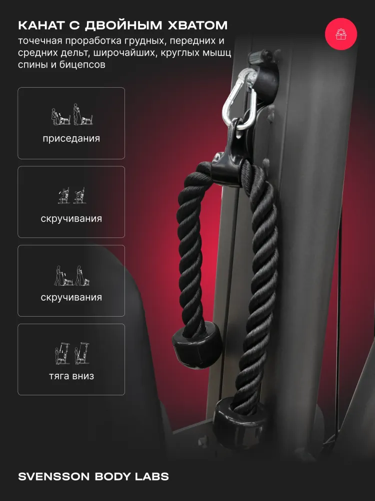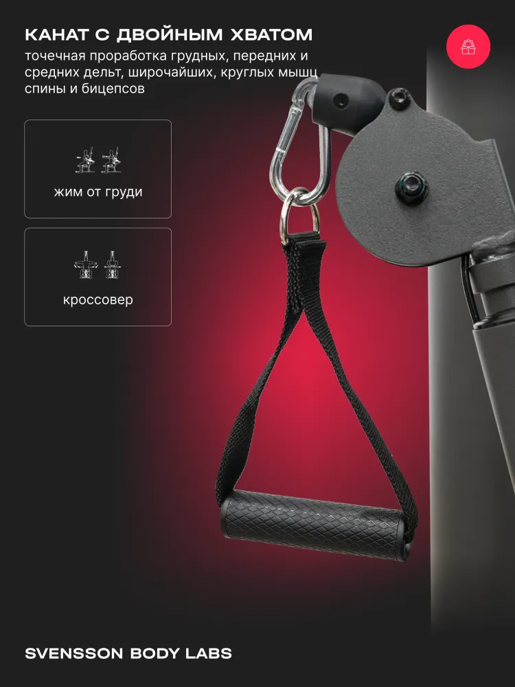 МаркаSvensson Body Labs АртикулRIGEL_PRO Диаметр троса, мм6 Материал тросасталь Сиденьеэргономичное с наполнителем из PU поролона и обивкой из искусственной кожи Размер в рабочем состоянии (ДхШхВ), см190х130x210 Размер в упаковке (ДхШхВ), см201.5х96.5x105.8 Вес нетто, кг264 Вес брутто, кг192 Максимальный вес пользователя, кг140 Страна изготовленияКНР Гарантийный срок36 мес. Показать больше -