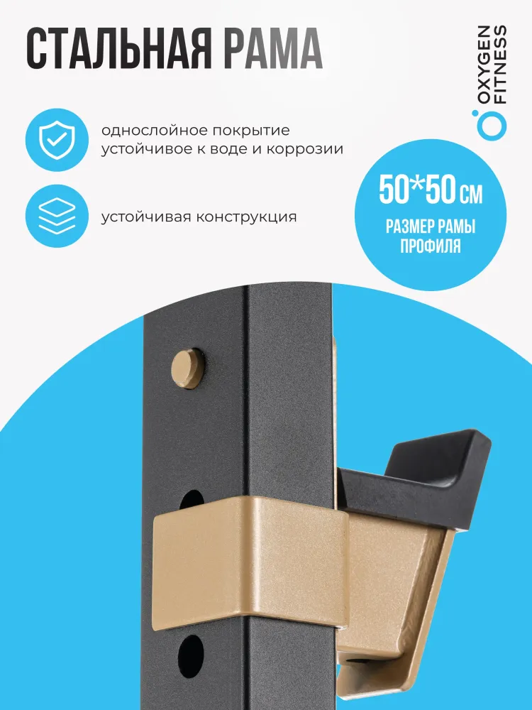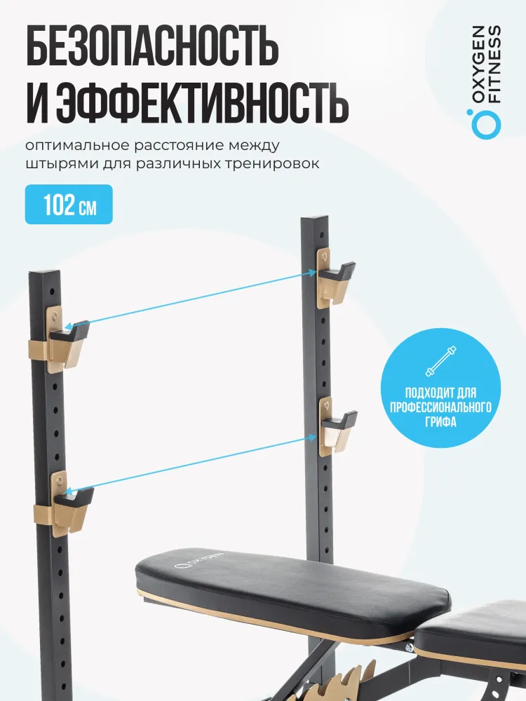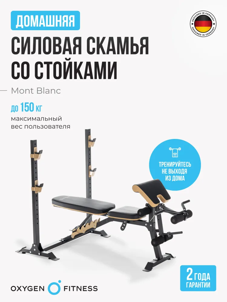- OXYGEN FITNESS MONT BLANC - это усиленная многофункциональная силовая скамья, имеющая мощный прямоугольный профиль размером 50*50 мм. Выдерживает нагрузку до 150 кг. По сути состоит из двух блоков - собственно скамьи для жима с партой на бицепс и стойки под штангу. Стойку нельзя использовать независимо от скамьи. Скамью можно использовать в нескольких положениях - с высоко поднятой спинкой для выполнения упражнений на бицепс (совместно с партой на бицепс), как скамью с положительным наклоном, как горизонтальную скамью и как скамью с отрицательным наклоном. Парта на бицепс регулируется в 4-ех положениях и при необходимости выполнения упражнений на сгибание либо разгибание ног ее можно снять. Обивка сидения и спинки выполнена по специальной технологии, которая представляет из себя искусственную комбинированную кожу из высококачественного полиуретана. Центральная часть обивки выполнена из материала со специальной антискользящей поверхностью, которая надежно фиксирует положение тела. Поверхность сидения и спинки - контурное и полностью соответствует антропометрическим параметрам подавляющего большинства пользователей. Стойку под штангу можно использовать в двух вариантах - в сочетании со скамьей для жима штанги и отдельно для приседов. Особенностью стойки является наличие не двух, а четырех держателей для штанги. Это позволяет абсолютно безопасно, в одиночку и без партнера, выполнять жим штанги от груди.