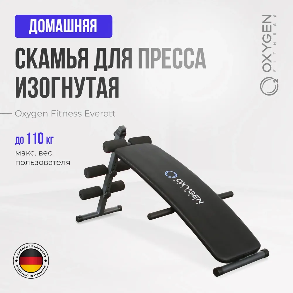 - Изогнутая скамья для пресса от немецкого производителя OXYGEN FITNESS – это идеальное дополнение для домашнего спортзала. Оборудование предназначено для всесторонней проработки мышц пресса, а также для различных типов упражнений – приседания, жим лежа, подъем ног и т.д. Скамья для пресса EVERETT имеет складную конструкцию, что позволяет значительно сэкономить жилую площадь. Угол наклона регулируется по высоте в 16 положениях, что делает ее незаменимой для выполнения самых разнообразных тренировок. Удобно структурированные регулируемые валики-держатели для ног обеспечивают точную стабилизацию ног, изолируя мышцы верхней части тела. Повышенный комфорт на протяжении всей тренировки обеспечивает эргономичное сиденье с поролоновой подушкой. EVERETT оснащен стальной рамой размером 38*38 мм. Однослойное покрытие устойчиво к воде и коррозии. Выдерживает максимальный вес пользователя до 110 кг.