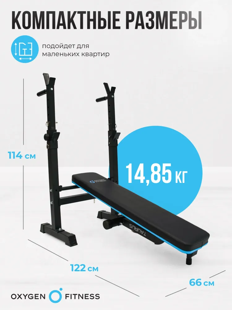 - Многофункциональная силовая скамья OXYGEN FITNESS TAURUS — это идеальный выбор для тех, кто хочет эффективно заниматься спортом в домашних условиях. С помощью этого оборудования вы сможете выполнять широкий спектр силовых упражнений для всех групп мышц. Скамья сочетает в себе функциональность и компактный дизайн, что делает ее отличным дополнением к вашему домашнему тренажерному залу. Скамья OXYGEN FITNESS TAURUS имеет прочный квадратный профиль рамы размером 50x50 мм, обеспечивая надежность и стабильность во время тренировок. С максимальным весом пользователя до 140 кг, она подходит для большинства атлетов. Сиденье размером 104x23 см с толщиной подушки 5 см обеспечивает комфорт во время выполнения упражнений. Скамья оснащена 7 уровнями регулировки стойки по высоте и регулируемой опорой, что позволяет адаптировать оборудование под ваши индивидуальные нужды. Скамья легко складывается, что делает ее удобной для хранения. В сложенном виде ее размеры составляют 43 см в длину, 66 см в ширину и 131 см в высоту. В рабочем состоянии длина скамьи составляет 122 см, ширина — 66 см, а высота — 114 см, что обеспечивает достаточное пространство для комфортных тренировок. Это делает OXYGEN FITNESS TAURUS отличным выбором для тех, у кого ограниченное пространство для тренировки. Скамья OXYGEN FITNESS TAURUS —надежный партнер в достижении ваших фитнес-целей. Ключевые преимущества OXYGEN FITNESS TAURUS: • прочный квадратный профиль рамы (50x50 мм) для надежности и устойчивости; • 7 уровней регулировки стойки по высоте и регулируемая опора для индивидуальной настройки; • комфортабельное сиденье размером 104x23 см с толщиной подушки 5 см для удобства во время тренировок; • максимальный вес пользователя до 140 кг, что делает скамью подходящей для большинства атлетов; • компактные размеры и возможность складывания для легкого хранения и интеграции в любое домашнее пространство.