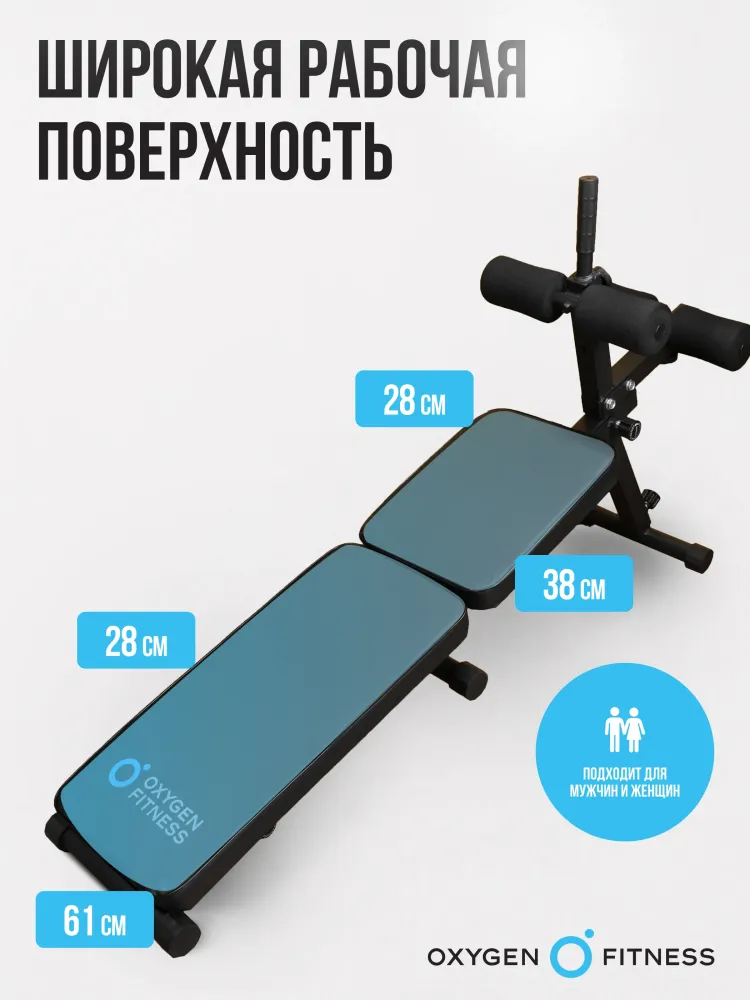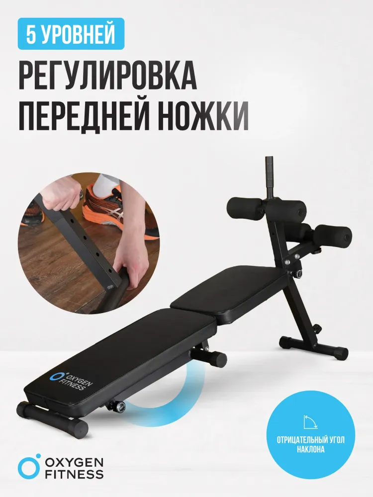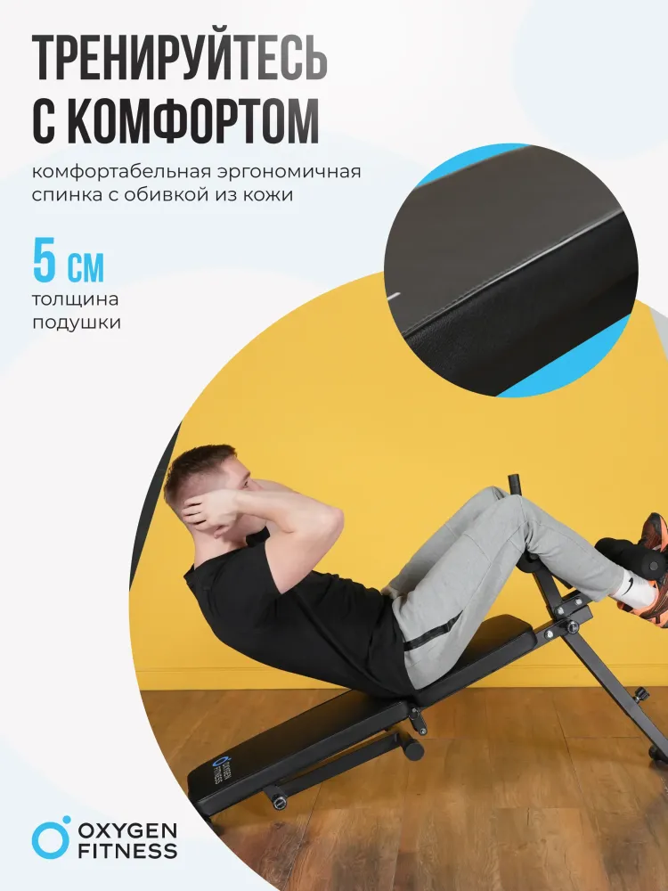 - Складная скамья OXYGEN FITNESS FOLDINGPRO — это удобное и функциональное оборудование, предназначенное для выполнения упражнений на развитие абдоминальных и косых мышц живота, а также верхней части тела. С максимальной весовой нагрузкой до 150 кг, скамья подходит для большинства пользователей и обеспечивает надежную поддержку во время тренировок. Компактные размеры (140 см в длину, 33 см в ширину и 99 см в высоту) делают ее идеальным выбором для домашнего использования, позволяя легко интегрировать скамью в любое пространство. Скамья OXYGEN FITNESS FOLDINGPRO оснащена комфортабельным эргономичным сиденьем с обивкой из кожи толщиной 50 мм, что обеспечивает высокий уровень комфорта во время занятий. Имеется возможность регулировки как положения сиденья, так и спинки, что позволяет выбрать оптимальное положение для выполнения различных упражнений. Скамья предлагает 5 уровней регулировки передней ножки и 3 уровня регулировки неопреновых валиков, что делает ее универсальной для выполнения множества упражнений. Скамья имеет прочный профиль рамы размером 40x40 мм, что гарантирует стабильность и безопасность во время тренировок. Удобные размеры скамьи позволяют легко выполнять различные упражнения, а возможность складывания делает ее удобной для хранения и транспортировки. С сиденьем размером 28x38 см и спинкой 61x28 см, OXYGEN FITNESS FOLDINGPRO обеспечивает достаточную площадь для комфортабельных тренировок. Складная скамья OXYGEN FITNESS FOLDINGPRO — это надежное и универсальное решение для достижения ваших фитнес-целей, обеспечивающее комфорт и эффективность во время тренировок в домашних условиях! Ключевые преимущества OXYGEN FITNESS FOLDINGPRO: • компактная и легкая конструкция: вес всего 11,5 кг и возможность складывания для удобства хранения; • регулируемое сиденье и спинка: возможность настройки под индивидуальные предпочтения для максимального комфорта; • прочные материалы: надежный профиль рамы и высококачественные компоненты для долговечности; • максимальная весовая нагрузка: до 150 кг, что делает скамью подходящей для большинства пользователей.