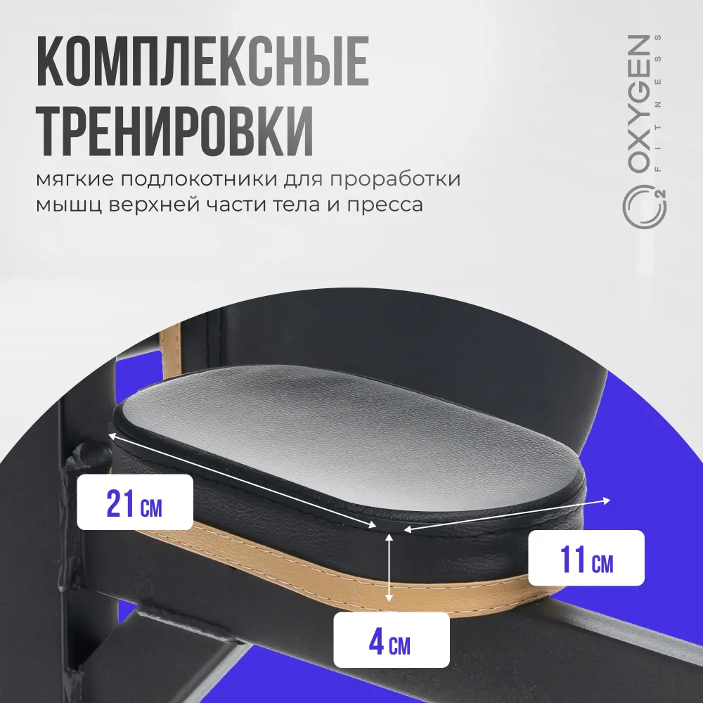 - OXYGEN FITNESS ELGON - идеальное решение для эффективной тренировки верхней части тела и торса. Он сочетает в себе функциональность и комфорт, позволяя вам разнообразить свою тренировку и развить силу в мышцах рук, груди, плеч и торса. Стальная усиленная рама с однослойной покраской обеспечивает надежность и стабильность, а основной профиль толщиной 60*30*1.2 мм гарантирует прочность и долговечность. Эргономичная спинка и скамья толщиной 40 мм с обивкой из эко кожи обеспечивают оптимальную поддержку и комфорт во время тренировки. Вы сможете регулировать высоту турника на 6 уровнях, позволяя настроить его под ваш рост и предпочтения. ELGON способен выдержать максимальный вес пользователя до 150 кг. Его компактные размеры в рабочем состоянии позволяют легко разместить его дома, даже в ограниченном пространстве.