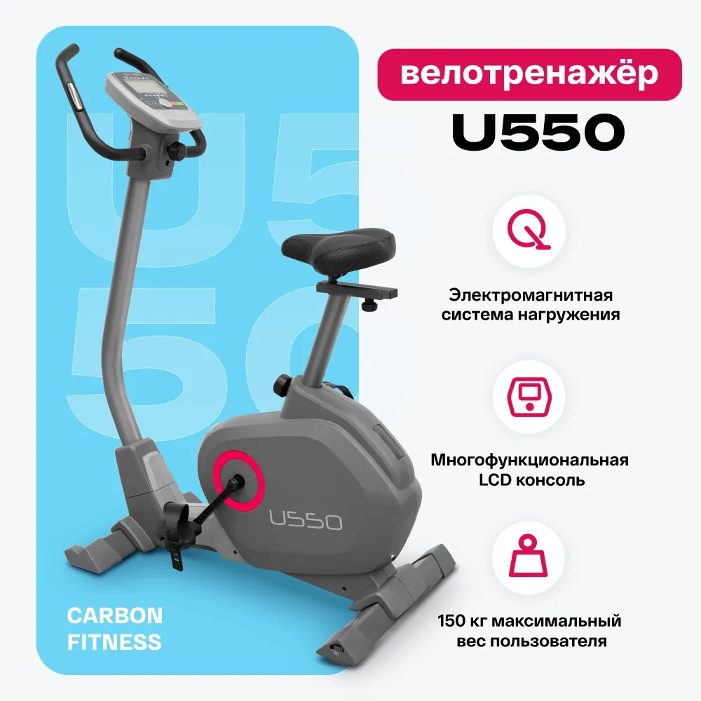 - CARBON FITNESS U550 - полнофункциональный велотренажер с электромагнитной системой нагружения для домашнего применения. Широкий спектр программных возможностей и более чем демократичная для такого уровня стоимость. U550 ориентирован на широкий круг пользователей начального и среднего уровня подготовки. Тренировочный компьютер представлен многофункциональным черно-белым LCD-дисплеем. На экран выводятся все основные параметры тренировки - время, дистанция, скорость, калории, пульс, темп (обороты в мин.), фитнес тест, сканирующий режим. На выбор представлены 12 разноплановых встроенных программ: быстрый старт, тренировки по целевому параметру — времени, дистанции, расходу калорий, 4 пульсозависимые программы, 4 пользовательских программы. Регулировка нагрузки электронная (16 уровней). Другие параметры CARBON FITNESS U550 также несут массу полезного. Комфортабельное сиденье регулируется по вертикали и горизонтали. Плюс ко всему, есть возможность регулировки наклона поручней. Рифленые антискользящие педали с прорезиненными многопозиционными ремешками обеспечивают надежное сцепление на любых скоростях педалирования. Эргономичная форма корпуса обеспечивает комфортную посадку на тренажер, не нужно перекидывать ногу. Благодаря компенсаторам неровностей пола можно легко выровнять положение велотренажера на неровной поверхности. Переместить тренажер также не составляет большого труда - для этого предусмотрены транспортировочные ролики. Тренажер подойдет пользователям ростом до 190 см.