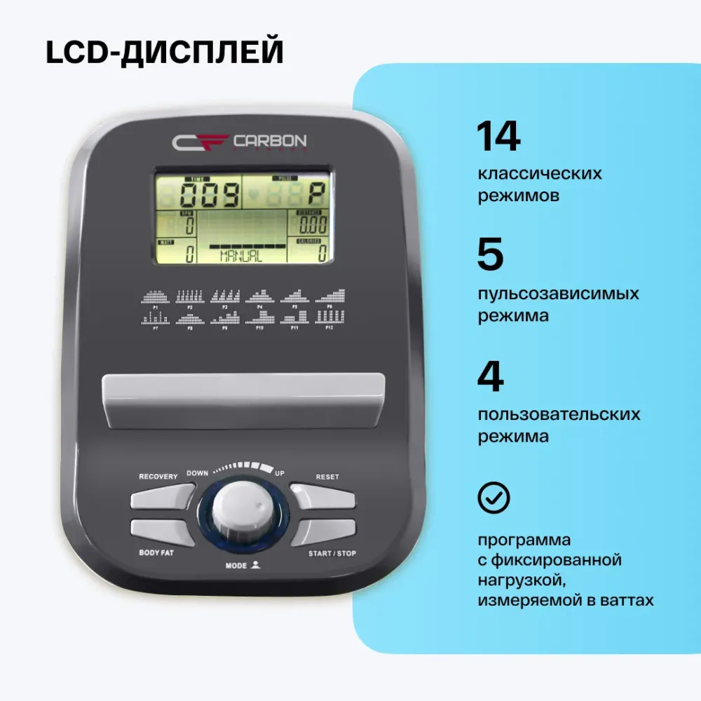 МаркаCarbon Fitness АртикулU804_NEW Назначение (Fitathlon)домашнее Тип тренажера (Fitathlon)велотренажер вертикальный Посадка (Fitathlon)вертикальная Система нагружения (Fitathlon)электромагнитная Количество уровней нагрузки16 (10-350 Вт) Регулировка нагрузкиэлектронная Инерционный вес маховика, кг16 BioFusion Тип педального узлатрехкомпонентный Сиденьес подушкой повышенной комфортности Регулировка положения сиденьяпо горизонтали и вертикали Рукояткистандартные с оплеткой из пенорезины Регулировка положения руляпо горизонтали КонсольLCD Показания консолипрофиль, время, дистанция, скорость, калории, обороты в мин., пульс, Ватты, фитнес-тест (Recovery), фитнес-оценка, жироанализатор (Body Fat), индекс массы тела (BMI), температура Общее количество программ24 Спецификация программручной режим, интервалы, "качели", шаги, долина, подъем, плато, склон, холмы, горы, фартлек, сжигание жира, жироанализатор, случайная, 1 Ватт-фиксированная, 4 пользовательские, 5 пульсозависимых Язык интерфейсаанглийский Подставка под планшет/смартфонДа Транспортировочные роликиДа Компенсаторы неровностей полаДа Дополнительные особенности тренажерарифленые педали с регулируемыми ремешками; сиденье повышенной комфортности Размер в упаковке (ДхШхВ), см78х28x56 Размер в рабочем состоянии (ДхШхВ), см96х47x137 Вес нетто, кг25 Вес брутто, кг25.4 Максимальный вес пользователя (Fitathlon)140 Подключение к сети220 В ПроизводительFitathlon Group (подразделение в Германии) Страна изготовленияКНР Гарантийный срок12 мес. Показать больше -