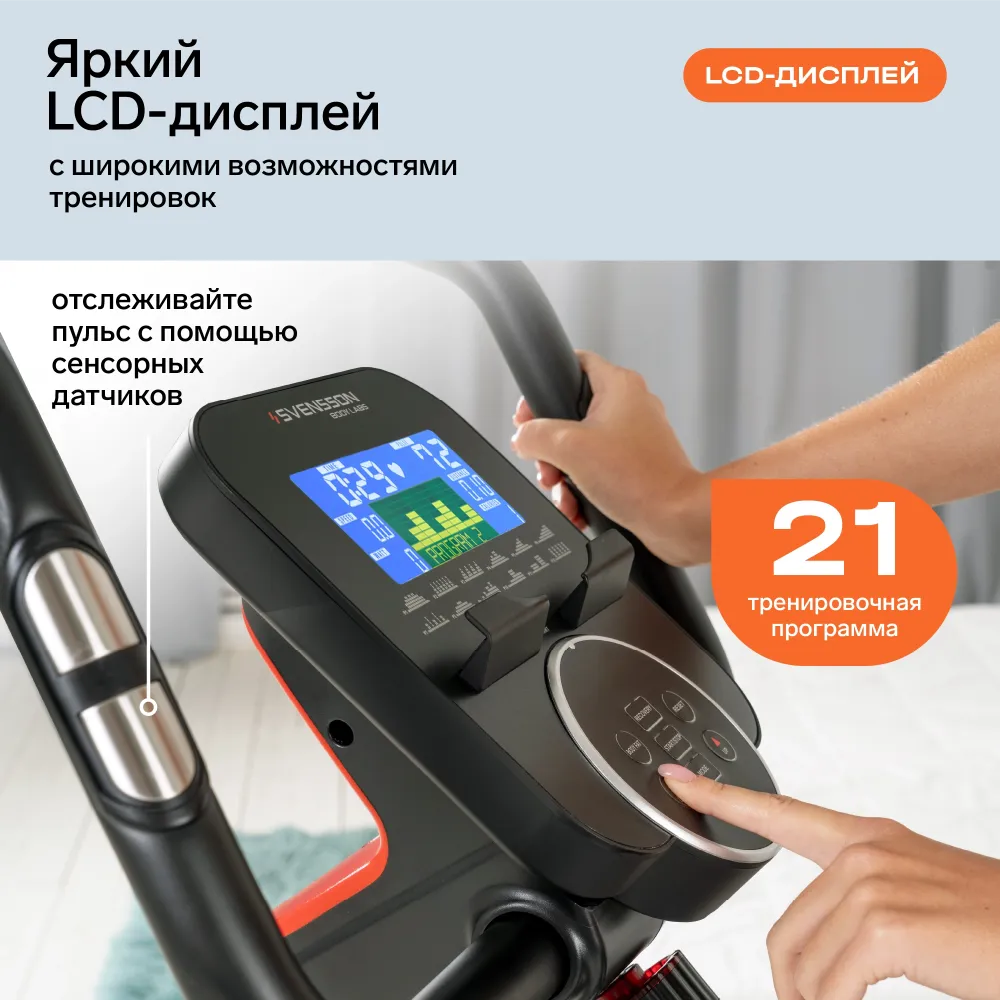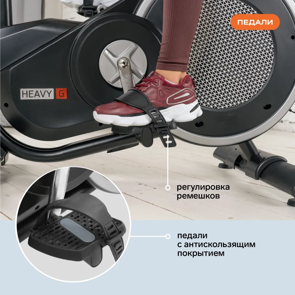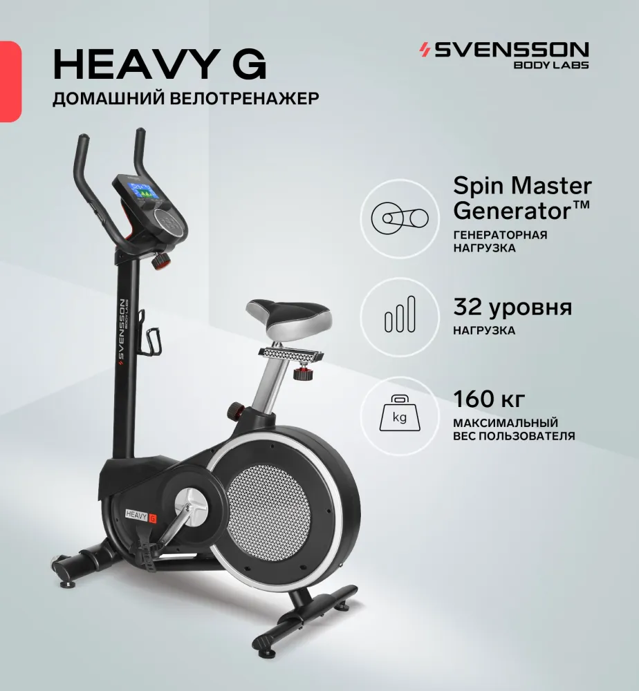 - Генераторный велоэргометр серии HEAVY G (UPRIGHT TYPE) - флагман линейки велотренажеров SVENSSON BODY LABS с вертикальной посадкой. Здесь используются самые надежные узлы и компоненты, самый качественный пластик, а все характеристики выкручены на максимум. Благодаря усиленному толстому металлическому профилю нетто вес изделия составляет внушительные 38 кг. Тренажер устойчив, надежен и выдерживает пользователей тяжеловесов вплоть до 160 кг. Предметом особой гордости серии HEAVY G является внешний вид. Он является результатом очередной неповторимой авторской работы известного шведского интерьерного дизайнера Патрика Хагборга (Patrik Hagborg), с которым производитель тренажеров (Jörgen Svensson LLC, Швеция) разрабатывает свои премиальные серии. В основе визуальной концепции HEAVY G лежит черный цвет с добавлением элементов серебристого и красного. Первый придает оборудованию необходимую солидность - в определенной степени, даже брутальность. Более легкий серебристый - это отсыл к строгим и благородным краскам северной природы. Стремительный красный цвет выделяет значимые элементы и формирует общий образ премиального продукта, которым будет по праву гордиться его владелец. Одна из главных особенностей HEAVY G - генераторный тип нагружения. Такой тип традиционно относится к числу самых надежных и обладает высшим качеством педалирования среди всех велоэргометров. К числу преимуществ генератора также относится энергонезависимость. Для полноценной работы тренажера нет необходимости подключать его в розетку и тянуть питающий провод по всей комнате. Помимо всего прочего, это полностью "зеленая" технология", которая не требует никаких внешних источников энергии. То есть, во-первых, сохраняет природные ресурсы планеты и, во-вторых, позволяет сэкономить на счетах на электричество. Безусловно, генератор - важный, но не единственный компонент приводной системы тренажера. Система, получившая общее запатентованное название SpinMaster Generator , состоит из утяжеленного сбалансированного маховика весом 15 кг., трехкомпонентного педального узла (аналогичного горным велосипедам), многожильного кевларового ремня и преднатяжителя, а также трех внутренних высококачественных впрессованных подшипников. Выверенная биомеханика и эргономика также относятся к числу сильных сторон HEAVY G UPRIGHT. Подседельный штырь регулируется как в вертикальном, так и в горизонтальном положениях. Поверхность штыря покрыта хромом - это не только элемент дизайна, но и надежная защита от царапин. Большая мягкая подушка сидения анатомической формы с гелиевыми вставками обеспечивает максимальный комфорт во время тренировки вне зависимости от того, сколько времени Вы проведете, выполняя свои спортивные задачи. Педали с рифленой антискользящей поверхностью и регулируемые прорезиненные ремешки надежно фиксируют положение стопы любого размера. Многопозиционный руль, полностью закрытый от влаги прорезиненной пеноуретановой защитой, регулируется по кругу и дает возможность принять спортивное "шоссейное" положение. Тренировочный компьютер представлен многофункциональным цветным LCD-дисплеем диагональю 14 см. В программный пакет входят 12 предустановленных программ, направленных на тренировку скоростных качеств, выносливости, укрепления сердечно-сосудистой системы и похудания. Помимо предустановленн