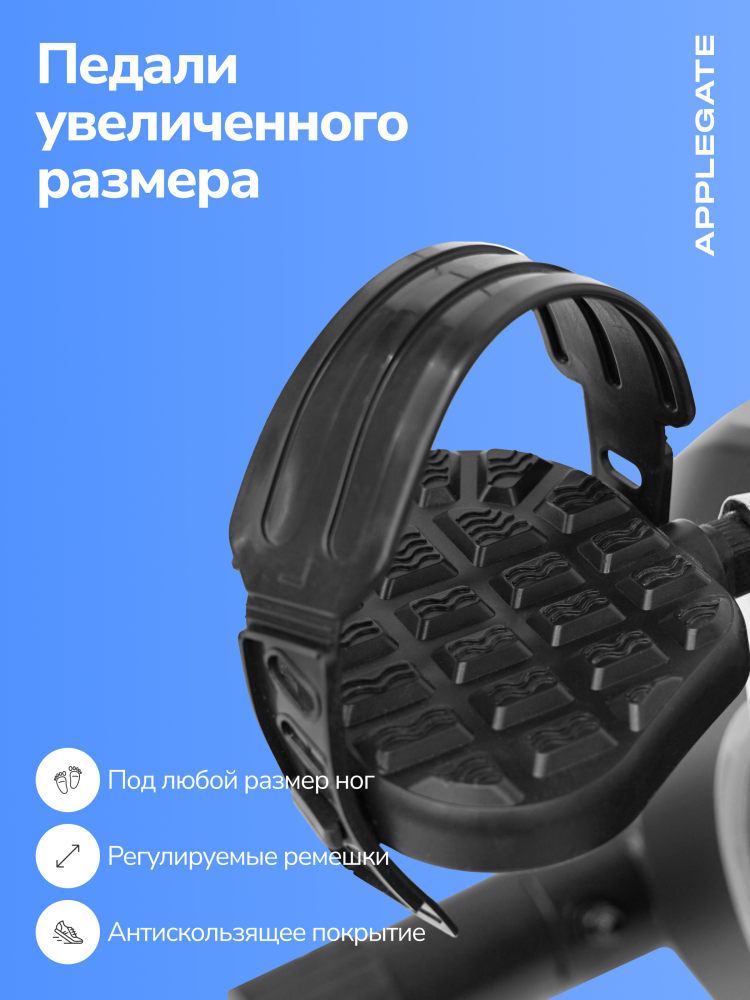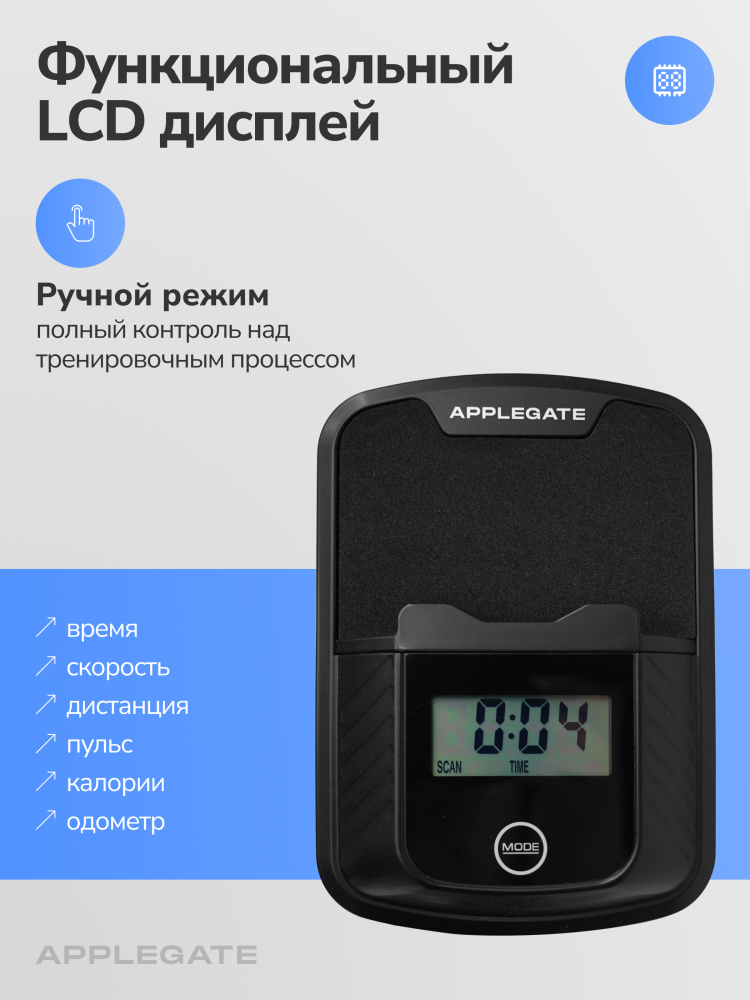 - APPLEGATE GYRO M — это вертикальный велотренажер, предназначенный для домашних тренировок. Легкий и устойчивый, он выдерживает нагрузку до 120 кг благодаря прочной раме с антикоррозийной обработкой и современным материалам. Габариты 83 × 47 × 122 см позволяют разместить его даже в ограниченном пространстве, а транспортировочные ролики обеспечивают легкость перемещения. Магнитная система нагружения и 8 уровней регулировки позволяют подобрать оптимальную интенсивность для тренировки. Тяжелый маховик весом 12 кг и трехкомпонентный педальный узел обеспечивают плавный и комфортный ход. Прорезиненные педали с регулируемыми ремешками надежно фиксируют стопы, делая занятия безопасными. Сиденье анатомической формы с возможностью регулировки по вертикали подходит для пользователей разного роста. Рукоятки с мягким покрытием из пенорезины обеспечивают удобный хват, а встроенные сенсорные датчики на поручнях позволяют контролировать пульс во время занятий. Монохромный LCD-дисплей отображает основные параметры тренировки: время, скорость, дистанцию, количество сожженных калорий, пульс и общий пробег (одометр). Консоль оснащена ручным режимом, а также держателем для планшета или смартфона, чтобы вы могли совмещать тренировки с просмотром фильмов или серфингом в интернете. APPLEGATE GYRO M не требует подключения к сети, что позволяет разместить его в любом удобном месте. Прочные материалы, современный ABS-пластик и надежная механическая система нагрузки гарантируют долгий срок службы даже при регулярных интенсивных тренировках. APPLEGATE GYRO M станет отличным выбором для тех, кто ценит удобство, качество и эффективность домашних тренировок. Ключевые преимущества APPLEGATE GYRO M: • маховик BioFusion c инертным весом 12 кг и 8 уровнями нагрузки; • габариты тренажера 83 × 47 × 122 см; • монохромный LCD дисплей с отображением основных показателей • максимальный вес пользователя до 120 кг.