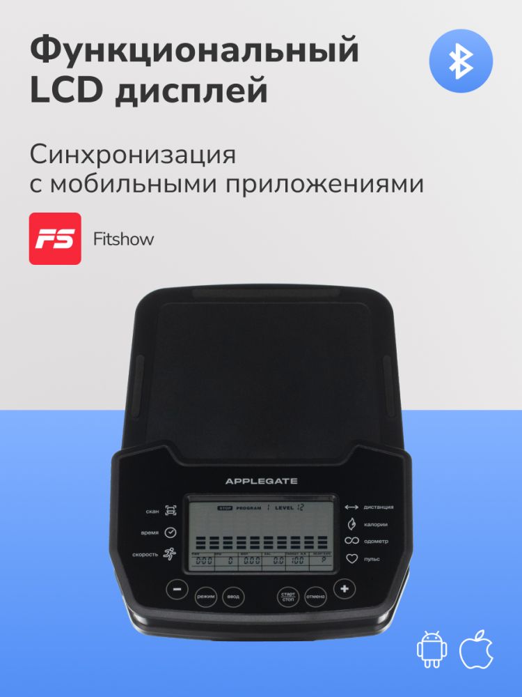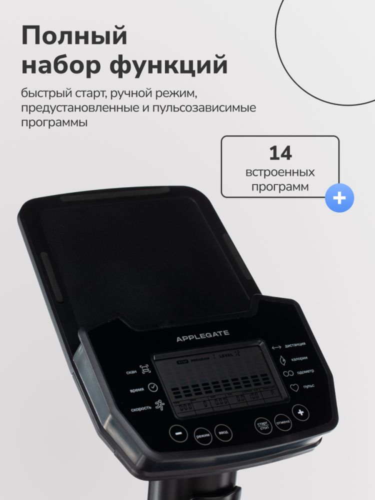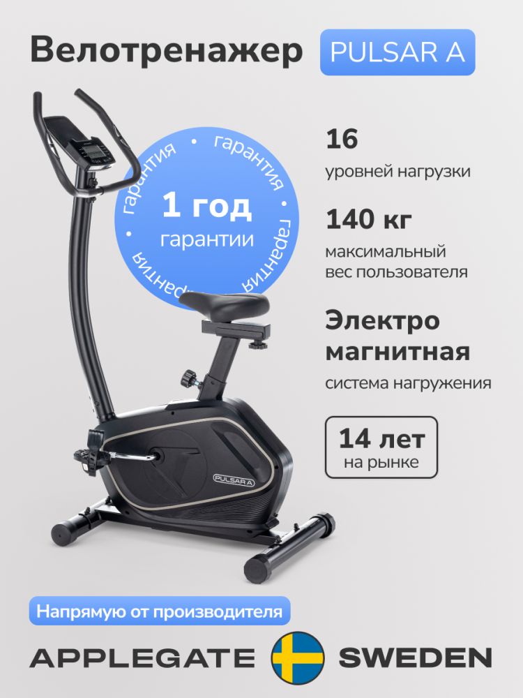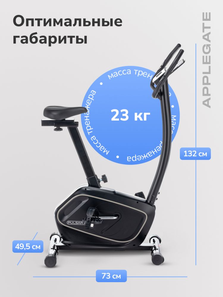 - Добро пожаловать в мир фитнеса и активного образа жизни с домашним велотренажером APPLEGATE PULSAR A! Этот тренажер - Ваш источник бесконечного вдохновения, комфорта и результативных тренировок прямо у вас дома. Устройтесь комфортно, ведь вас ждет вертикальная посадка, которая обеспечит правильную эргономику во время тренировки! APPLEGATE PULSAR A создан на основе высокопрочной рамы с двухслойной покраской, что обеспечивает не только устойчивость и долговечность, но и красивый внешний вид, добавляющий шарма вашей тренировочной зоне. Внутри тренажера используется качественный АБС-пластик из исходного сырья, который обеспечивает надежность и прочность всей конструкции. Насладитесь эффективными тренировками с помощью электромагнитной системы нагружения magicFLOW™ PLUS, которая предлагает вам 16 уровней нагрузки. Вы сможете точно настроить нагрузку под ваши потребности и достичь максимальной эффективности. С маховиком весом 12 кг, APPLEGATE PULSAR A обеспечивает плавное и практически бесшумное кручение, создавая идеальные условия для приятной и комфортной тренировки. Прорезиненные педали с регулируемыми ремешками обеспечивают надежную фиксацию ног во время тренировки. Комфортабельная подушка анатомической формы на сиденье позволит вам насладиться каждой минутой тренировки, не ощущая дискомфорта или усталости. Сиденье можно регулировать по горизонтали и вертикали, чтобы найти наиболее подходящую позицию для вашего тела и обеспечить оптимальную эргономику. Руль оснащен оплеткой из пенорезины, обеспечивая комфортный и надежный хват во время тренировки. Измерение пульса станет проще с сенсорными датчиками и встроенным телеметрическим приемником. Вы сможете точно контролировать свою сердечную частоту и адаптировать тренировку под ваши фитнес-цели. (Нагрудный кардиодатчик приобретается отдельно) Черно-белый LCD дисплей на консоли предоставляет вам информацию о времени, скорости, дистанции, сожженных калориях, пульсе, нагрузке, профиле программы и статусе Bluetooth. Вы всегда будете в курсе своих результатов и сможете отслеживать свой прогресс. APPLEGATE PULSAR A предлагает вам 14 программ тренировок, включая быстрый старт, ручной режим, предустановленные программы и пульсозависимые программы. Вы сможете разнообразить свои тренировки и достичь новых результатов. С помощью встроенного Bluetooth вы можете работать с тренировочным мобильным приложением Fitshow, чтобы добавить интерактивности и разнообразия. APPLEGATE PULSAR A поддерживает русский язык интерфейса. Подставка под планшет обеспечит вам развлечение во время тренировки, позволяя вам смотреть фильмы, слушать музыку или использовать тренировочные приложения. Встроенные транспортировочные ролики облегчат перемещение тренажера в вашем доме или помещении. Максимальный вес пользователя составляет 140 кг. Тренажер работает от сети 220 Вольт и имеет функцию энергосбережения, что поможет сократить энергопотребление и сэкономить ваши ресурсы. Откройте для себя новые горизонты фитнеса и энергии с домашним велотренажером APPLEGATE PULSAR A. Создайте свою собственную тренировочную зону в вашем доме и достигайте новых высот!