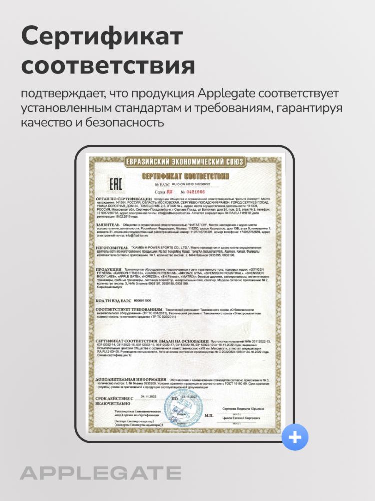 Подтверждает, что товар или услуга соответствуют установленным стандартам и требованиям, гарантируя качество и безопасность продукции.