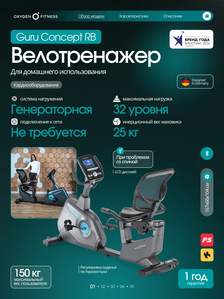 - Представляем вам GURU CONCEPT RB от OXYGEN FITNESS - велотренажер, специально разработанный для домашнего использования, станет отличным инструментом на пути к здоровому образу жизни. Этот тренажер обладает высокопрочной рамой (с антикоррозийной обработкой) и горизонтальной посадкой для максимального комфорта во время тренировок. Система нагружения magicFLOW™ PLUS GENERATOR обеспечивает 16 уровней нагрузки, позволяя вам наслаждаться интенсивными тренировками, а трехкомпонентный педальный узел с антискользящими педалями и регулируемыми ремешками гарантирует безопасность и удобство во время занятий. Эргономичное сиденье повышенной комфортности со спинкой и поручнями, а также регулировкой положения сидения по горизонтали позволяет настроить тренажер под ваши индивидуальные потребности. С сенсорными датчиками и встроенным телеметрическим приемником для измерения пульса, а также LCD дисплеем с яркой белой индикацией, вы сможете отслеживать время, скорость, дистанцию, калории, пульс, уровень нагрузки, обороты в минуту и ВАТТы, чтобы контролировать тренировочные показатели. С 14 доступными программами, включая быстрый старт, ручной режим, пользовательские программы, предустановленные и пульсозависимые программы, жироанализатор и программу восстановления, GURU CONCEPT RB предлагает широкий выбор тренировочных опций для достижения ваших спортивных целей. Интеграционные технологии Bluetooth позволяют взаимодействовать с тренировочными мобильными приложениями, такими как Kinomap™ и Zwift™, а также присутствует возможность подключения нагрудного датчика пульса (приобретается отдельно), дополняя тренировку новыми возможностями и вдохновляя на новые достижения. С GURU CONCEPT RB вы сможете создать идеальный путь к здоровью и фитнесу, наслаждаясь комфортом и эффективностью этого уникального тренажера. Ключевые преимущества OXYGEN FITNESS GURU CONCEPT RB: • генераторная система нагружения magicFLOW™ PLUS GENERATOR с 16 уровнями нагрузки; • 14 встроенных программ тренировок; • возможность работы с тренировочными фитнес приложениями Kinomap™ и Zwift™; • возможность подключения нагрудного кардиодатчика (приобретается отдельно).